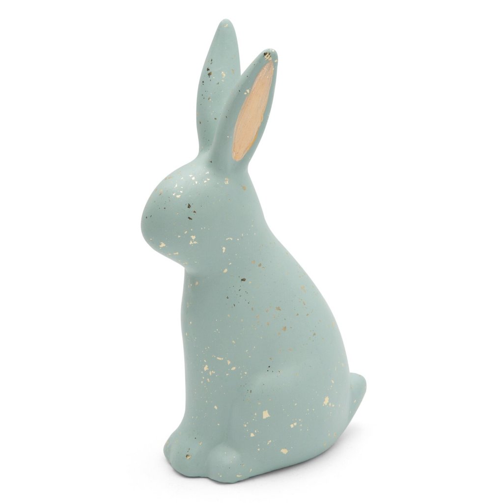 Okouzlující velikonoční zajíček z keramické hlíny. Jeho pastelové barvy v kombinaci s jemnými lesklými částečkami mu dodávají jedinečný, elegantní charakter. Díky pečlivému zpracování a jemně lesklému povrchu figurka krásně odráží světlo. Dokonalá volba pro milovníky jemných a přitom efektních velikonočních dekorací, které spojují tradici s moderním designem! Šířka: 13 cm, délka: 25 cm, barva: tyrkysová a zlatá, složení: keramická hlína.Doplňkové parametry