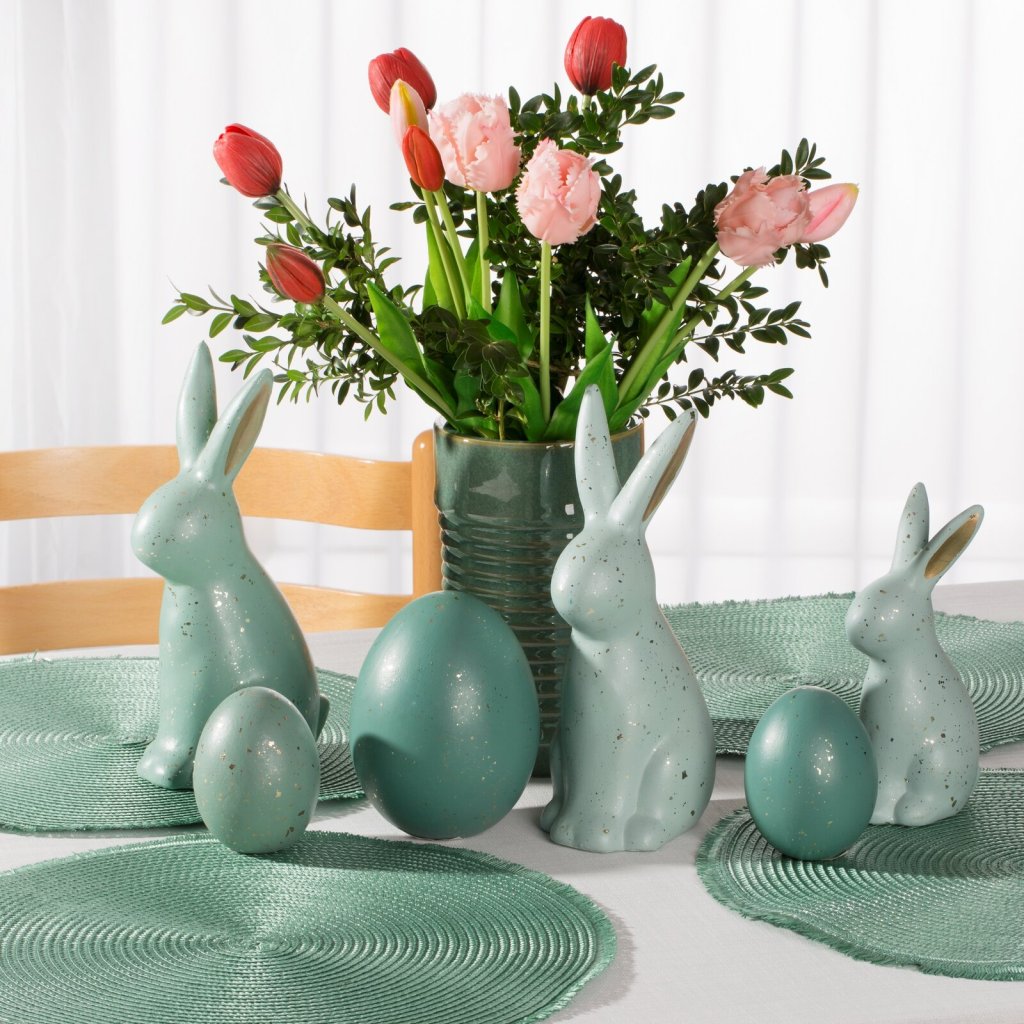 Okouzlující velikonoční vajíčko z keramické hlíny. Jeho pastelové barvy v kombinaci s jemnými lesklými částečkami mu dodávají jedinečný, elegantní charakter. Díky pečlivému zpracování a jemně lesklému povrchu figurka krásně odráží světlo. Dokonalá volba pro milovníky jemných a přitom efektních velikonočních dekorací, které spojují tradici s moderním designem! Šířka: 7 cm, délka: 10 cm, barva: tyrkysová a zlatá, složení: keramická hlína.Doplňkové parametry