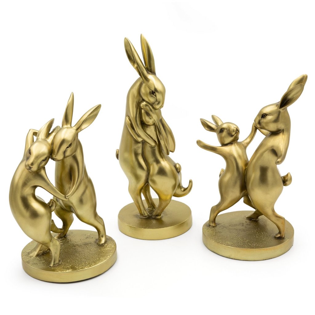 Elegantní a stylová velikonoční dekorace v podobě rodiny zajíčků, vyrobená z odolné polyesterové pryskyřice. Jejich jemný, matný zlatý povrch dodává sošce rafinovaný nádech a vytváří harmonický a luxusní akcent ve svátečních aranžmá. sošky potěší precizním zpracováním a jemnými detaily, které jim dodávají jedinečné kouzlo. Šířka: 12 cm, délka: 30 cm, barva: zlatá, složení: polyesterová pryskyřice.Doplňkové parametry