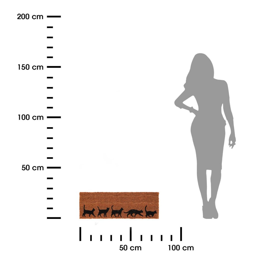 Vnější rohožka Cats , 75 × 25 cm je praktický a dekorativní doplněk , který efektivně pomáhá udržovat čistotu v interiéru . vrstva zajišťuje dobrou přilnavost k podlaze a zvyšuje bezpečnost při používání. Motiv kráčejících koček dodává rohožce originální vzhled, který ocení zejména milovníci zvířat .