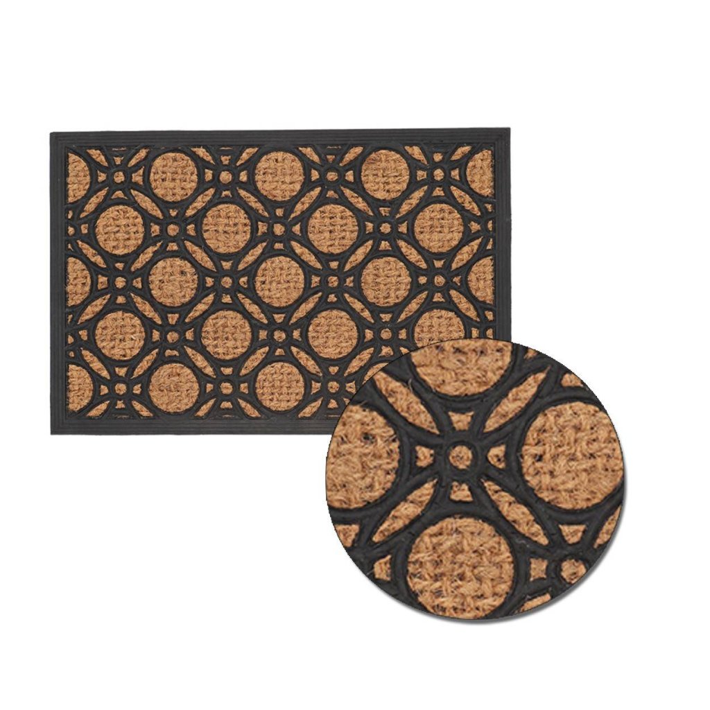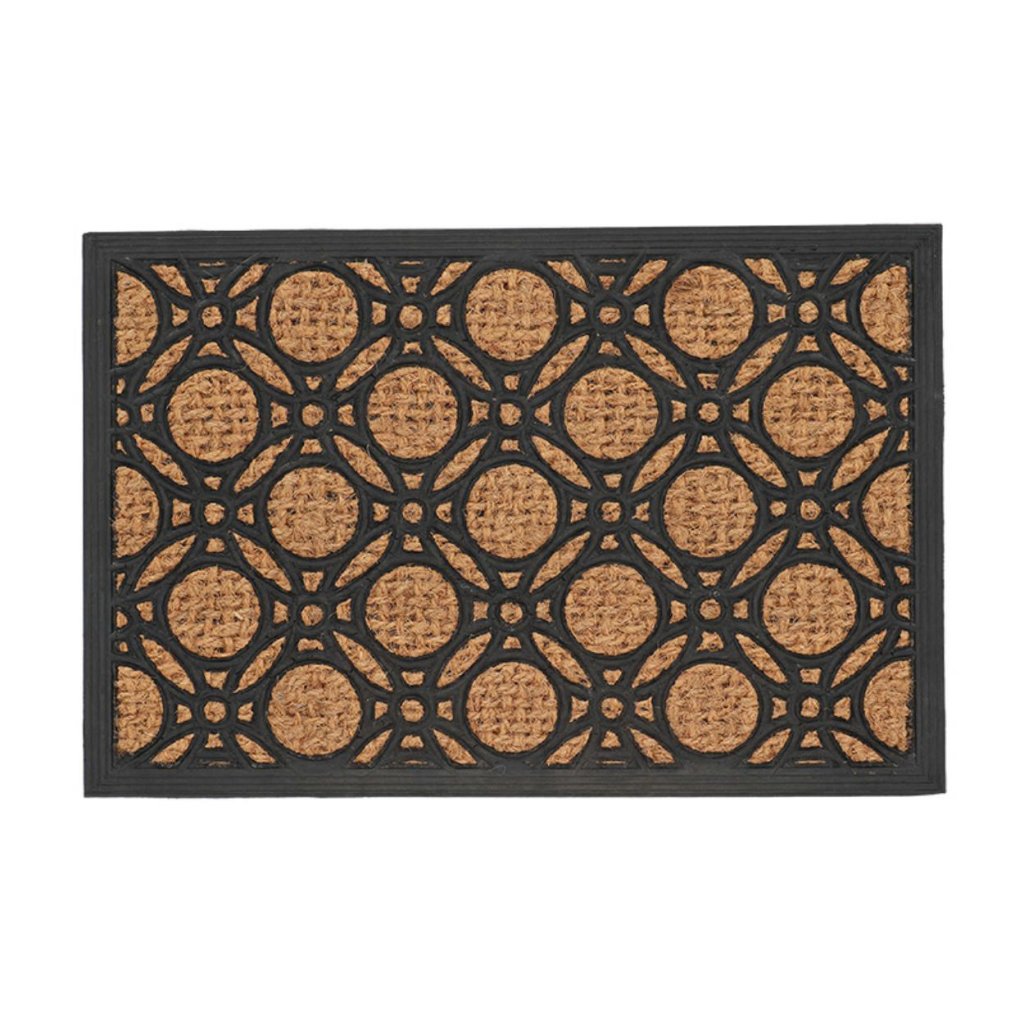 Vnější rohožka Goldie o rozměrech 60×40 cm nabízí moderní vzhled a vysokou funkčnost v jednom. Ozdobný motiv různě velkých kruhů jí dodává originální charakter, díky čemuž se stává stylovým doplňkem u vchodu i v interiéru.