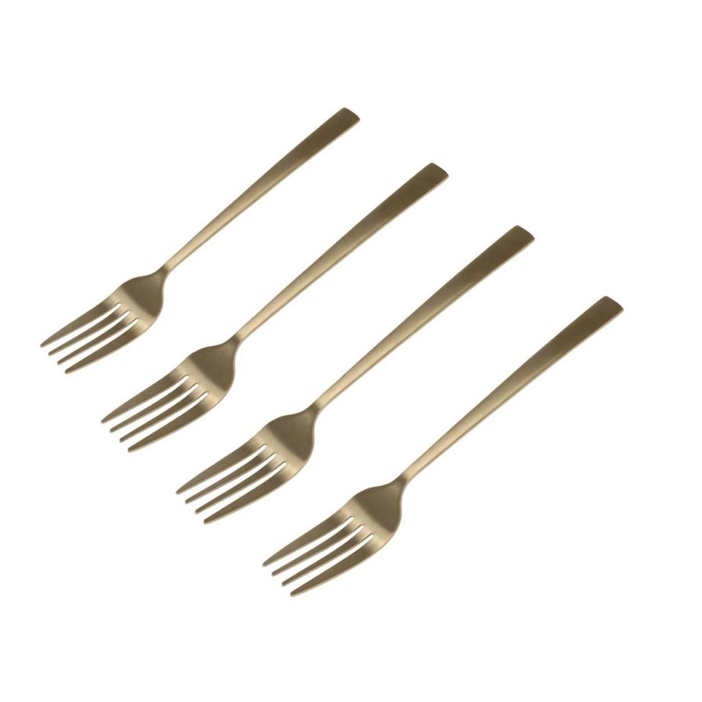 Sada elegantních dortových vidliček vyrobených z kvalitní nerezavějící oceli je dokonalým doplňkem k nádobí pro milovníky sofistikovaného stylu. Zlatá, matná povrchová úprava dodává vidličkám luxusní charakter, díky čemuž se perfektně hodí do různých aranžmá stolů - moderních i klasických. Ideální pro servírování koláčů, zákusků a občerstvení při jakékoli příležitosti.Délka: 15 cm
