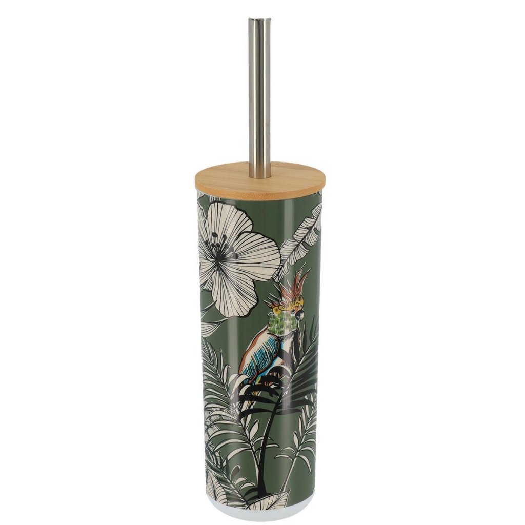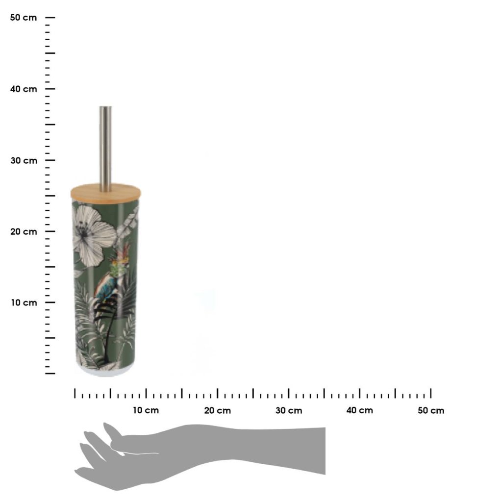 WC kartáč z kolekce Jungle Fever představuje stylové spojení funkčnosti a výjimečného designu. Je vyrobena z odolného plastu s barevným potiskem tropických listů a papouška na pozadí v odstínu khaki, díky čemuž dodá koupelně exotický a originální nádech . Vrchní část z přírodního bambusu spolu s chromovanými detaily vytváří harmonickou kombinaci přírodních a moderních prvků. Tento dekorativní a praktický WC kartáč je ideálním řešením pro ty, kteří hledají estetické doplňky s důrazem na detail.