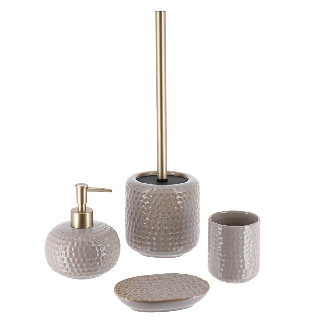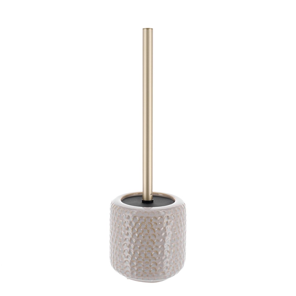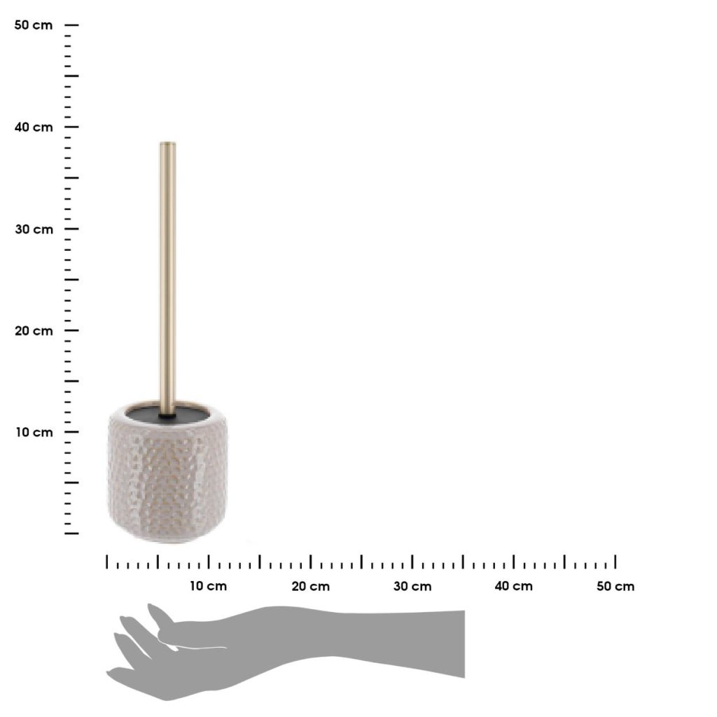 Stylový toaletní kartáč Nolan je elegantní a praktický doplněk, který dokonale doplní výzdobu každé moderní koupelny. Vyrobená z vysoce kvalitní keramiky v béžovém odstínu, zdobená jemným reliéfním vzorem, který jí dodává jedinečný charakter a eleganci. Zlatá rukojeť dodává luxusní nádech a zároveň zajišťuje odolnost a pohodlí při používání. Vyměnitelná hlavice kartáče a snadné čištění dělají produkt nejen účinným, ale také velmi funkčním. Je ideální pro glamourózní, klasická i moderní aranžmá. Díky estetické konstrukci ji lze vystavit na viditelném místě, aniž by narušila styl interiéru.Doplňkové parametry