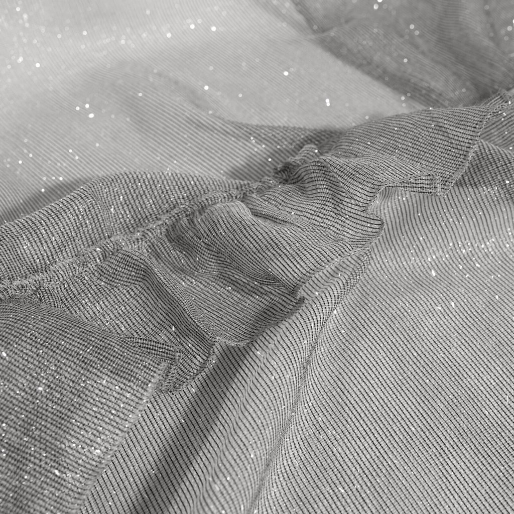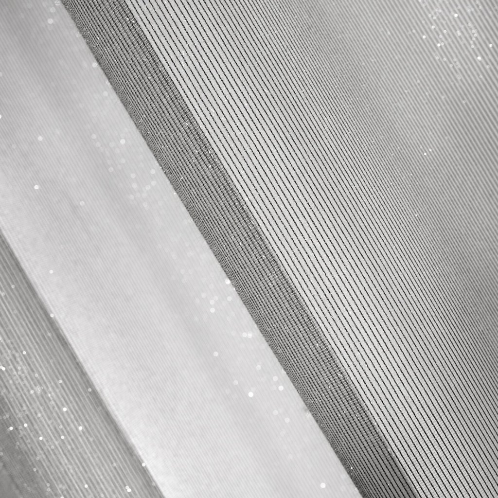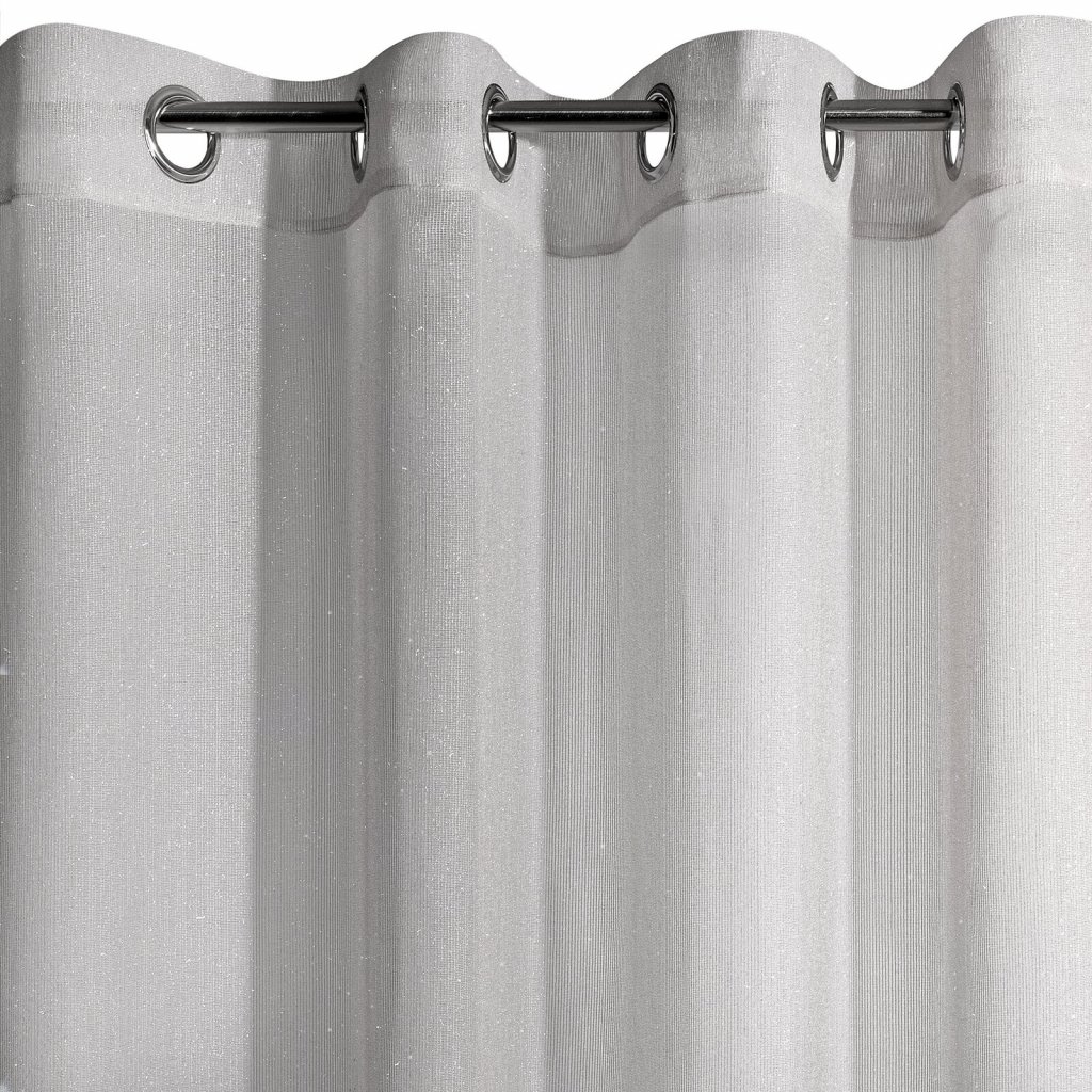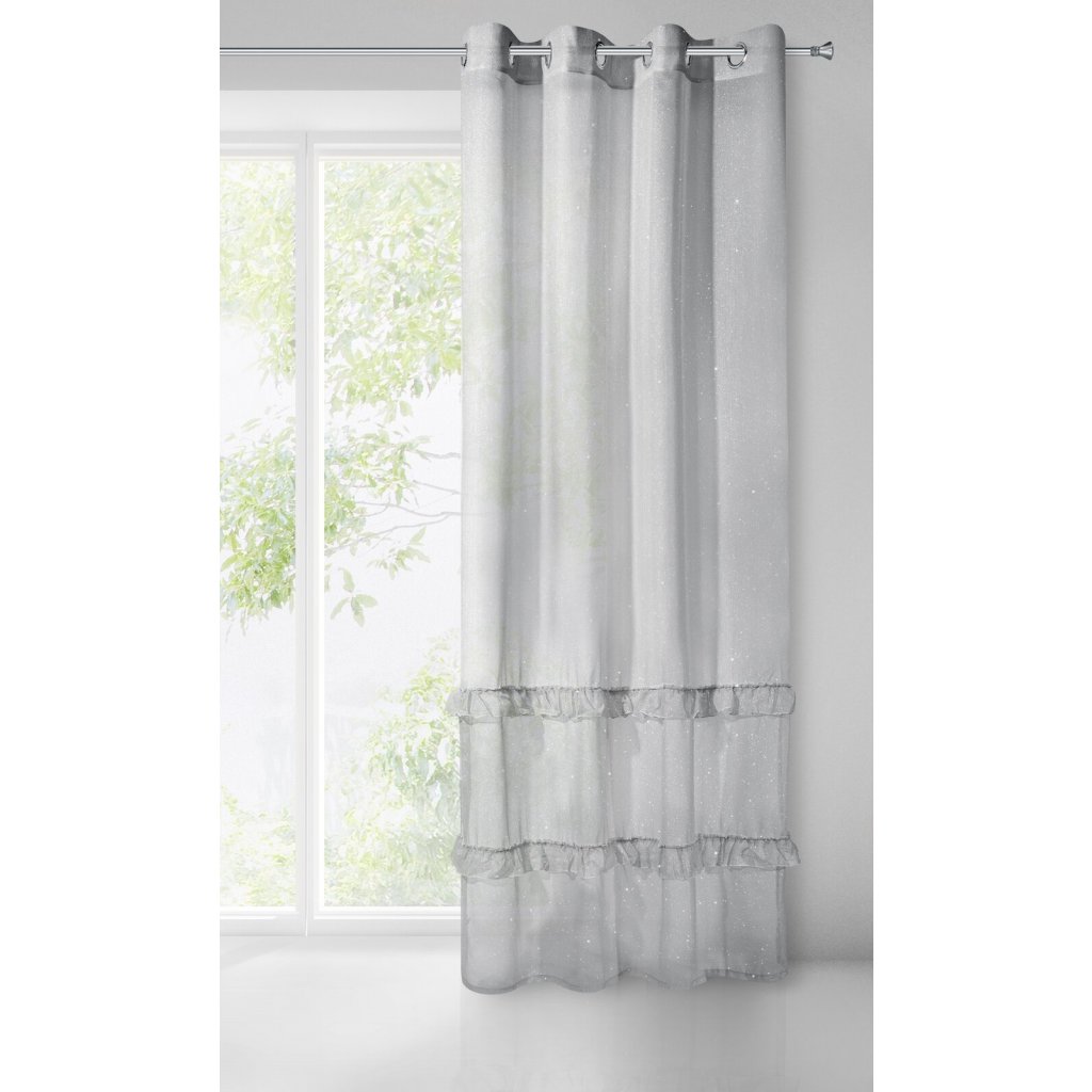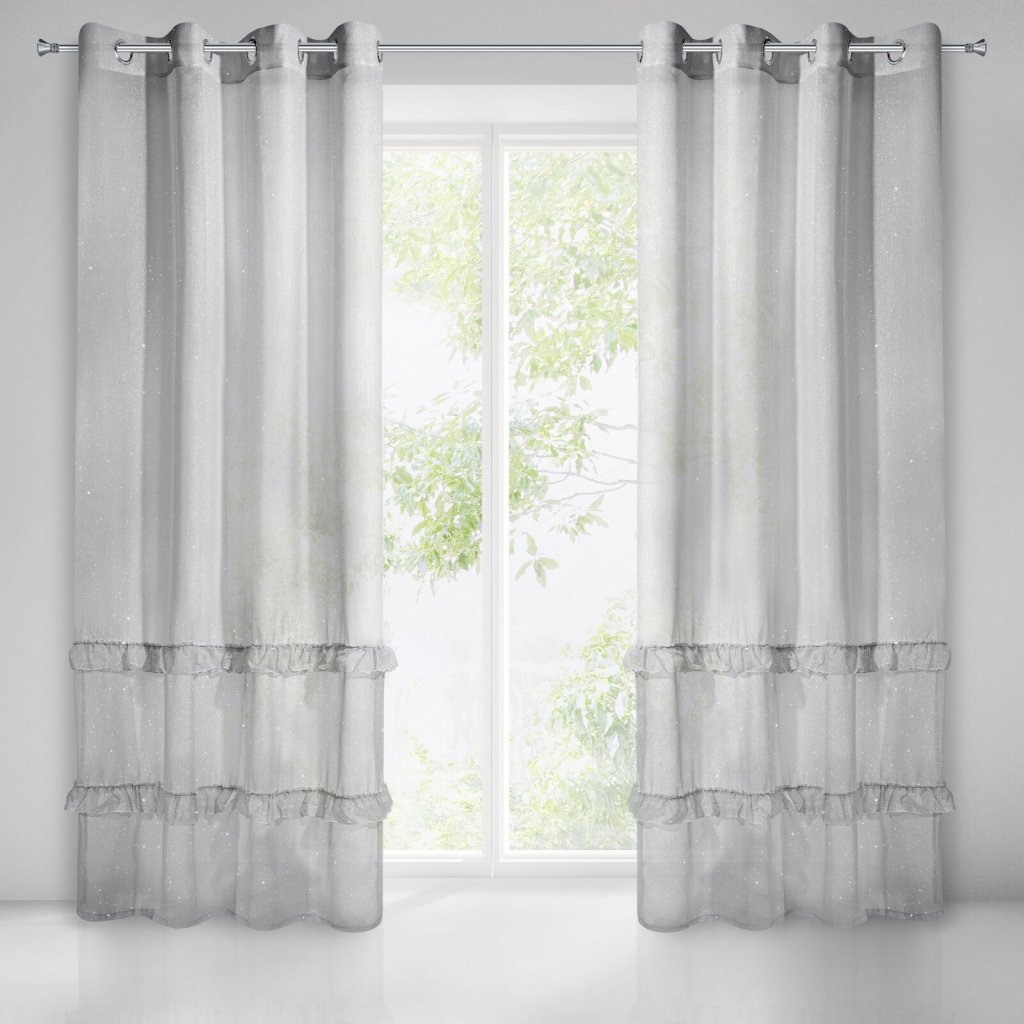 Jednobarevná záclona s mohérovou třpytivou nití zdobená volány. Šířka: 140 cm, délka: 250 cm, barva: šedá, hmotnost: 50 GSM, složení: 100 % polyesterDoplňkové parametry