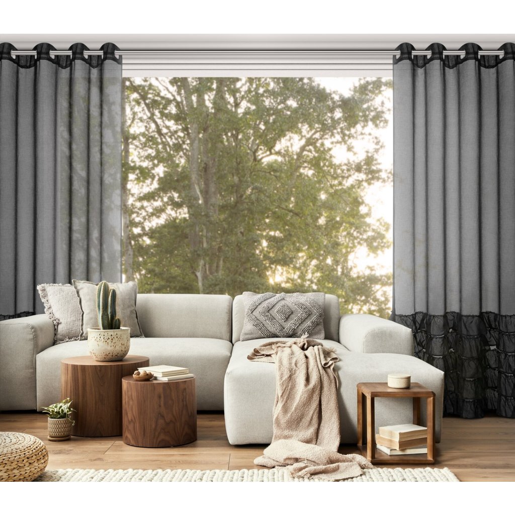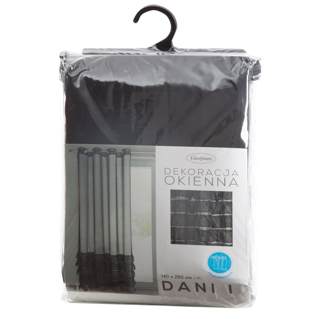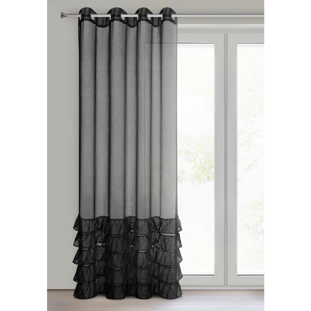 Hotová záclona zdobená volánem ve spodní části, šířka: 140 cm, délka: 250 cm, barva: černá, gramáž: 70 GSM, složení: 100% polyester.Doplňkové parametry