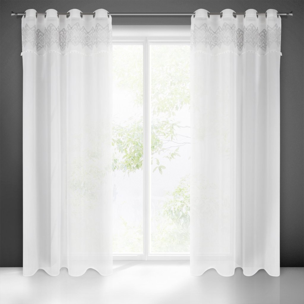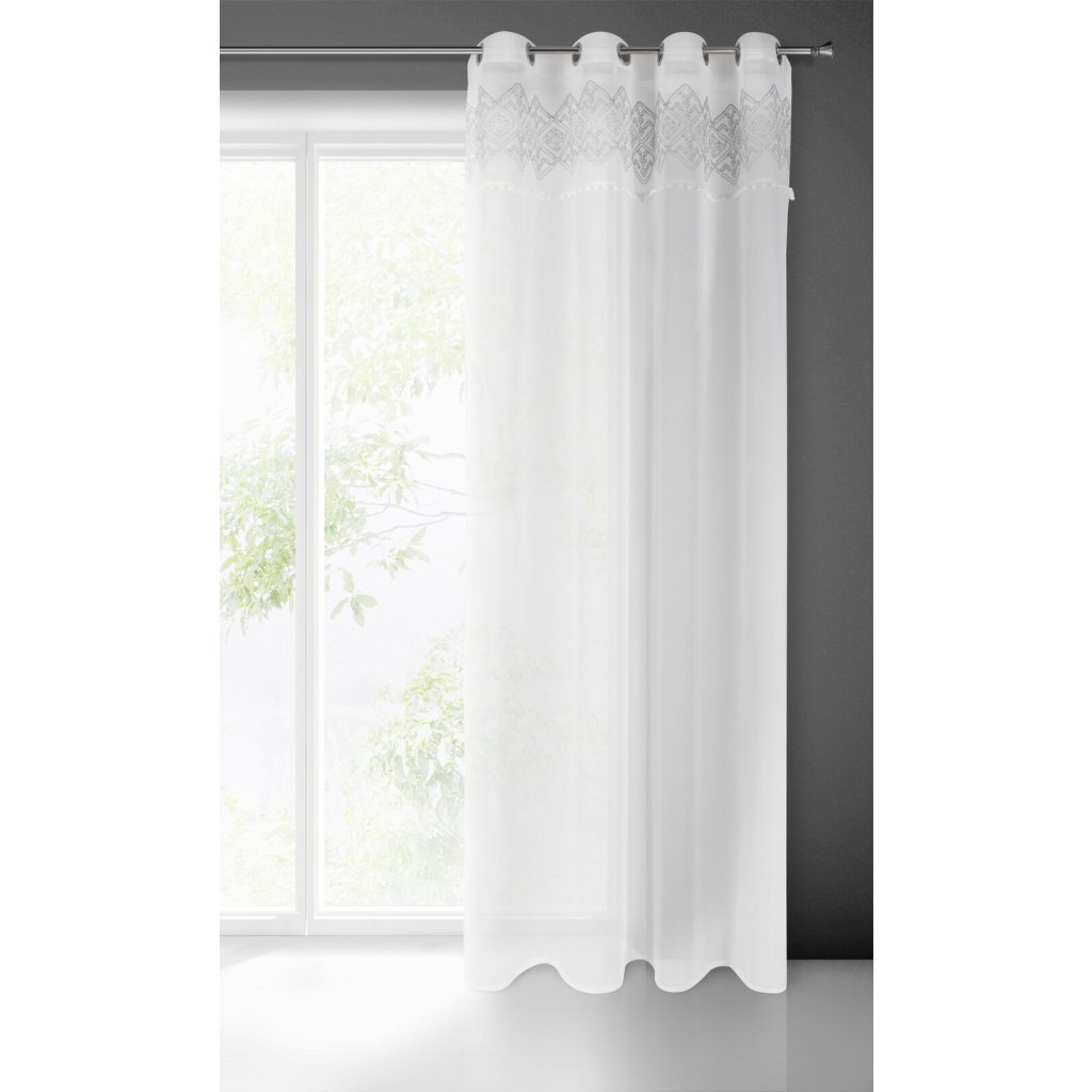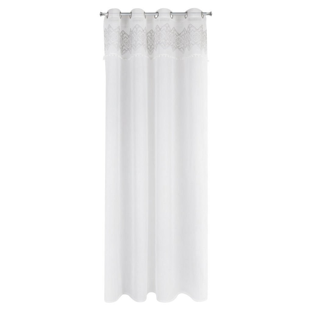 Jemná záclona kombinující tradiční a moderní vzory. Vrchní část zdobí stříbrná výšivka s geometrickým motivem. Šířka: 140 cm, délka: 250 cm, barva: bílá, hmotnost: 66 GSM, složení: 100 % polyesterDoplňkové parametry