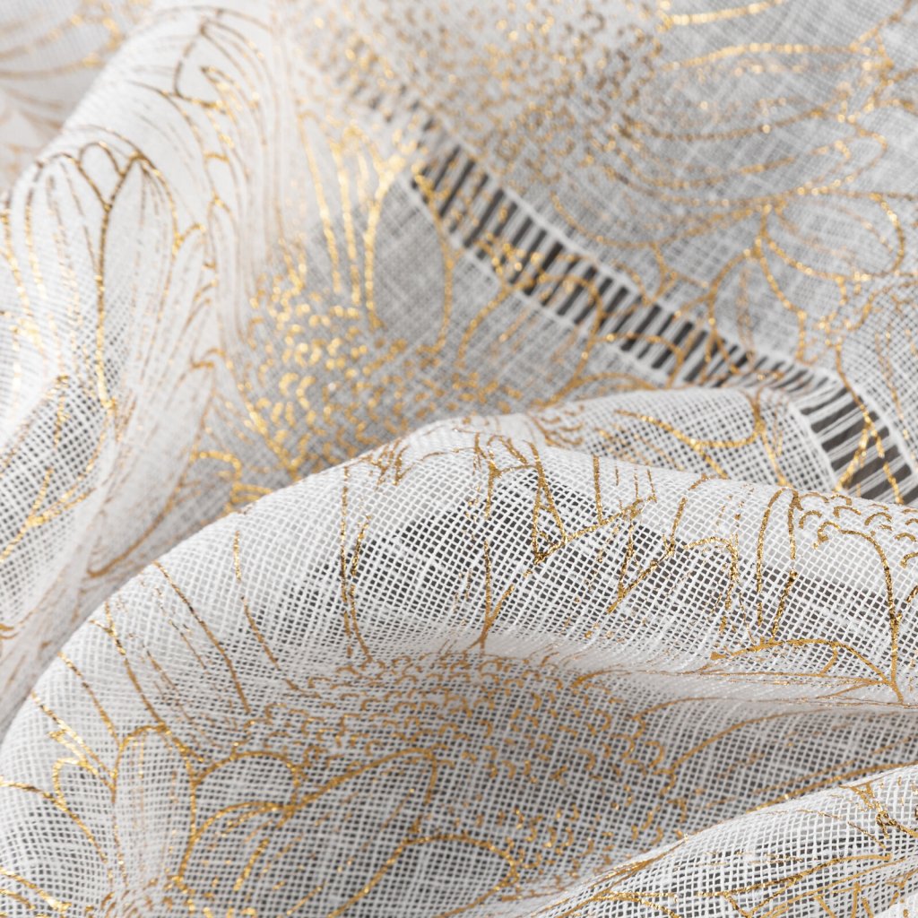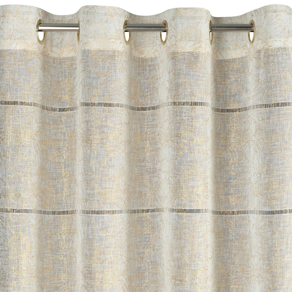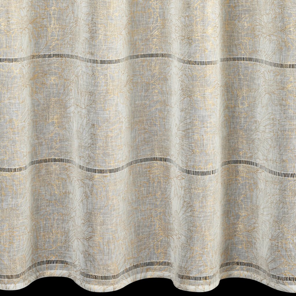 Záclona KATY kombinuje přírodní charakter matné gázy s jemnými, prolamovanými pruhy, které do interiéru vnášejí jemnou hru světla. Jemný květinový potisk dodává celkovému designu další šmrnc a dodává mu nádech lehkosti a elegance. Šířka: 140 cm, délka: 250 cm, barva: bílá a zlatá, hmotnost: 136 GSM, složení: 100% polyester.Doplňkové parametry