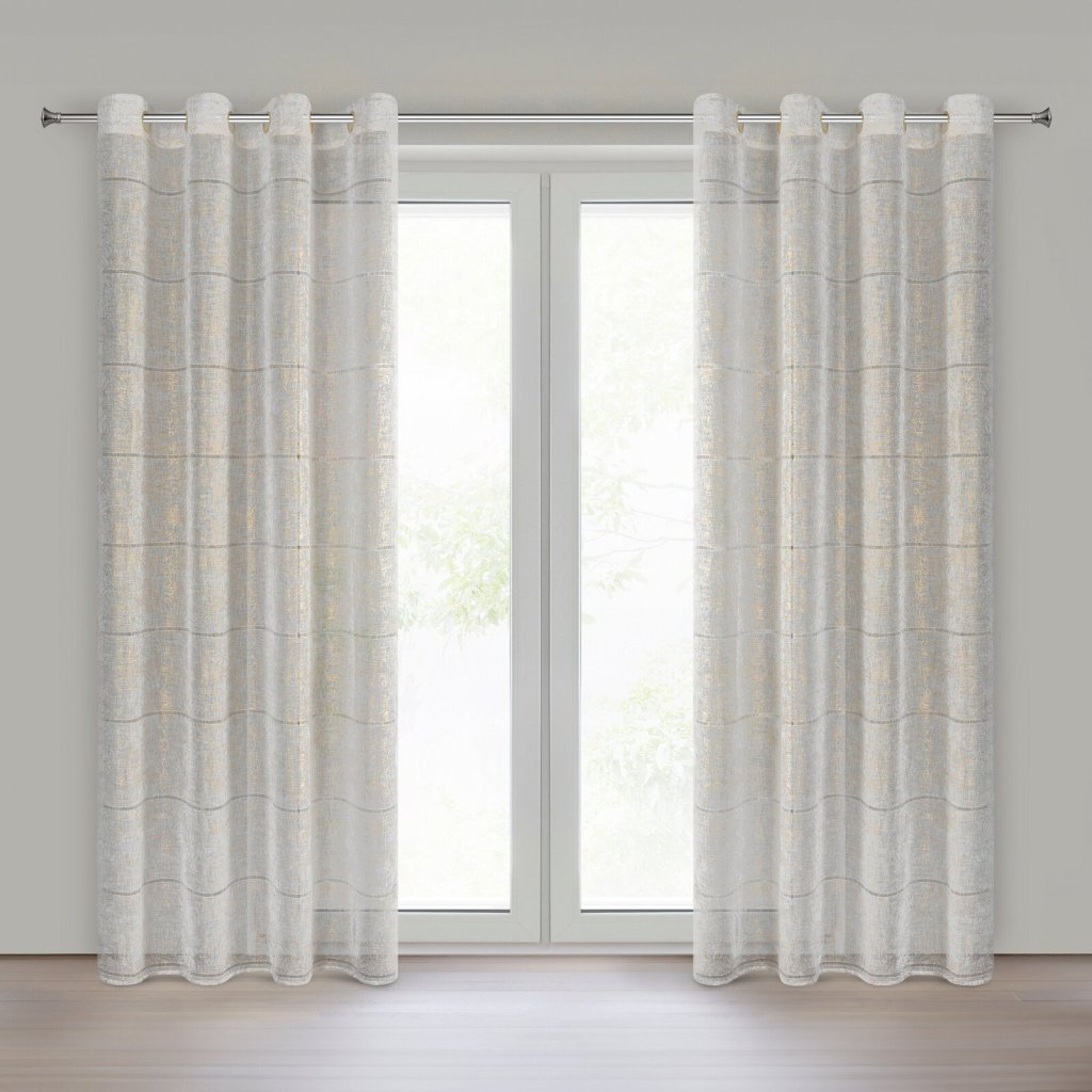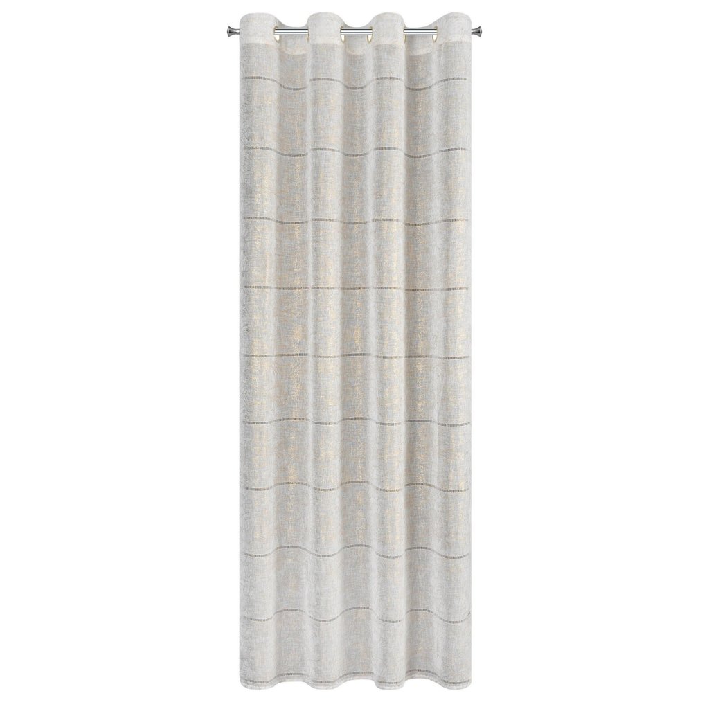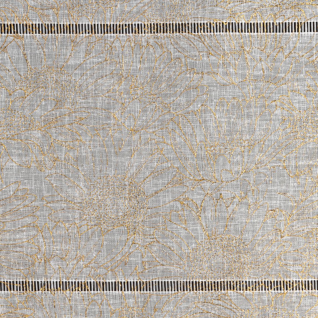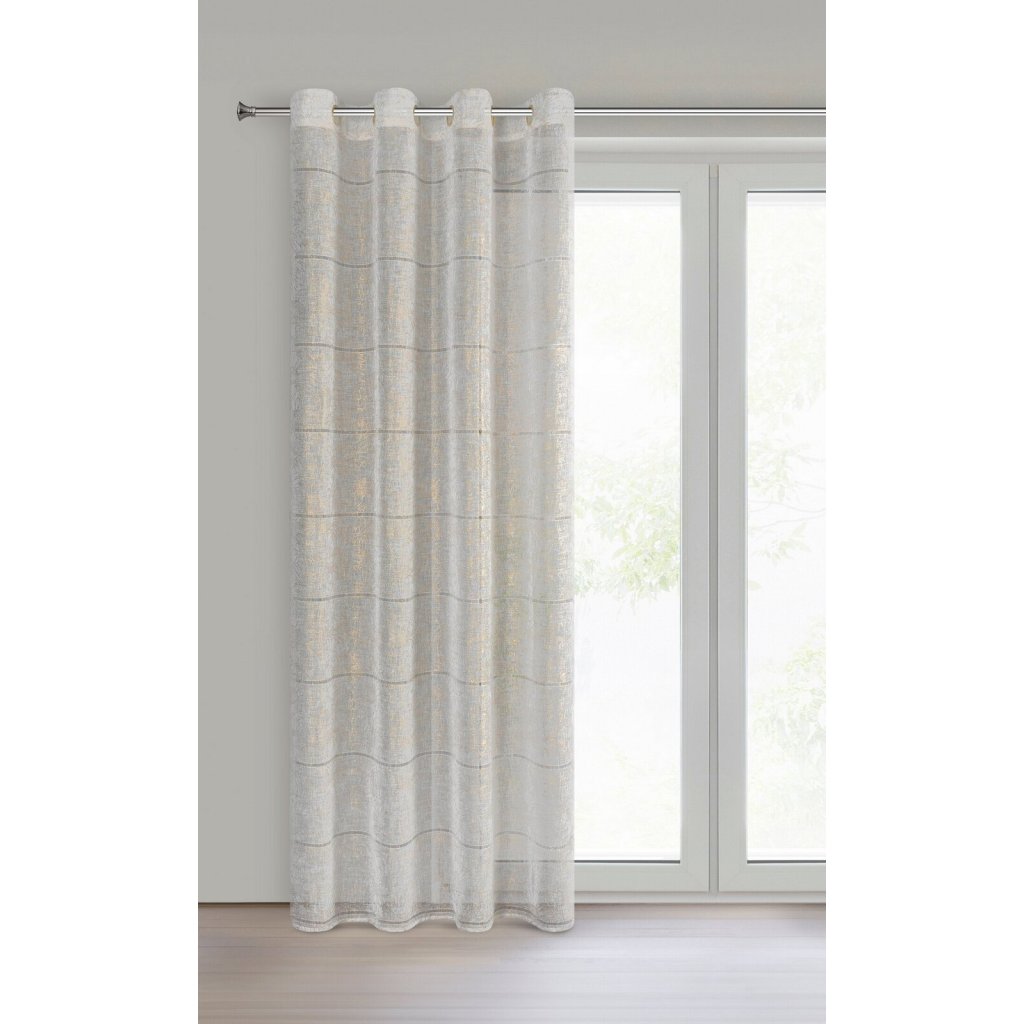 Záclona KATY kombinuje přírodní charakter matné gázy s jemnými, prolamovanými pruhy, které do interiéru vnášejí jemnou hru světla. Jemný květinový potisk dodává celkovému designu další šmrnc a dodává mu nádech lehkosti a elegance. Šířka: 140 cm, délka: 250 cm, barva: bílá a zlatá, hmotnost: 136 GSM, složení: 100% polyester.Doplňkové parametry