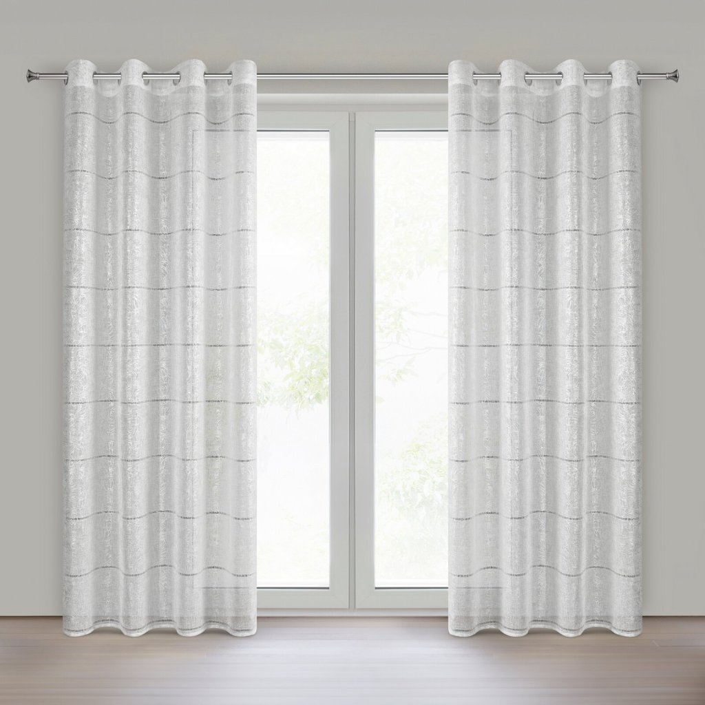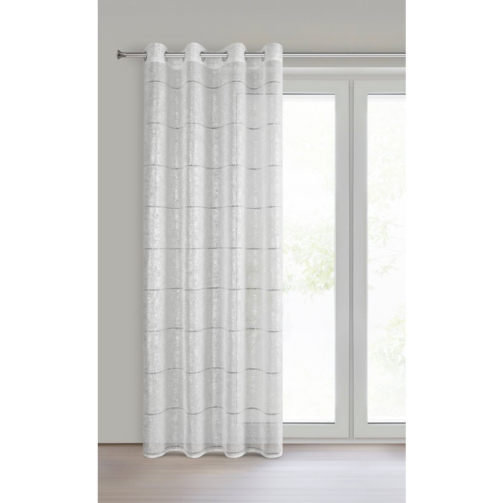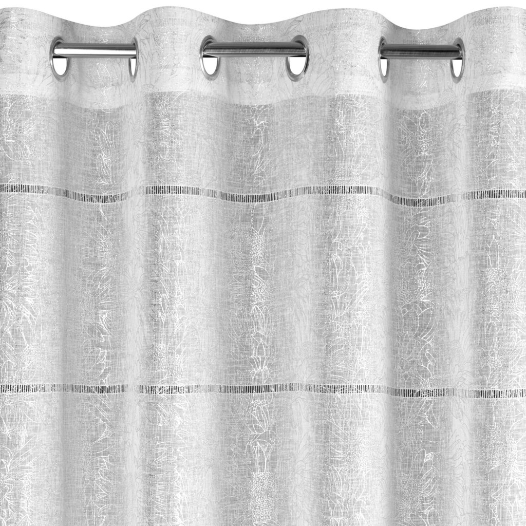 Záclona KATY kombinuje přírodní charakter matné gázy s jemnými, prolamovanými pruhy, které do interiéru vnášejí jemnou hru světla. Jemný květinový potisk dodává celkovému designu další šmrnc a dodává mu nádech lehkosti a elegance. Šířka: 140 cm, délka: 250 cm, barva: bílá a stříbrná, hmotnost: 136 GSM, složení: 100% polyester.Doplňkové parametry