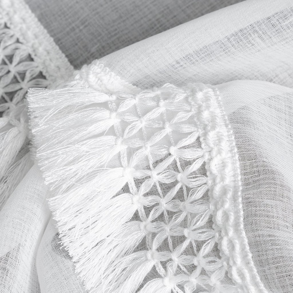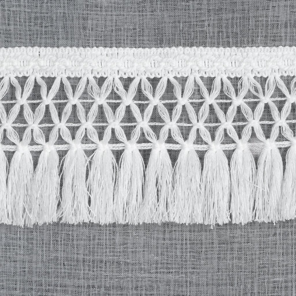 Hotová záclona s ozdobnými třásněmi, šířka: 140 cm, délka: 250 cm, barva: bílá, hmotnost: 75 GSM, složení: 100% polyester.Doplňkové parametry