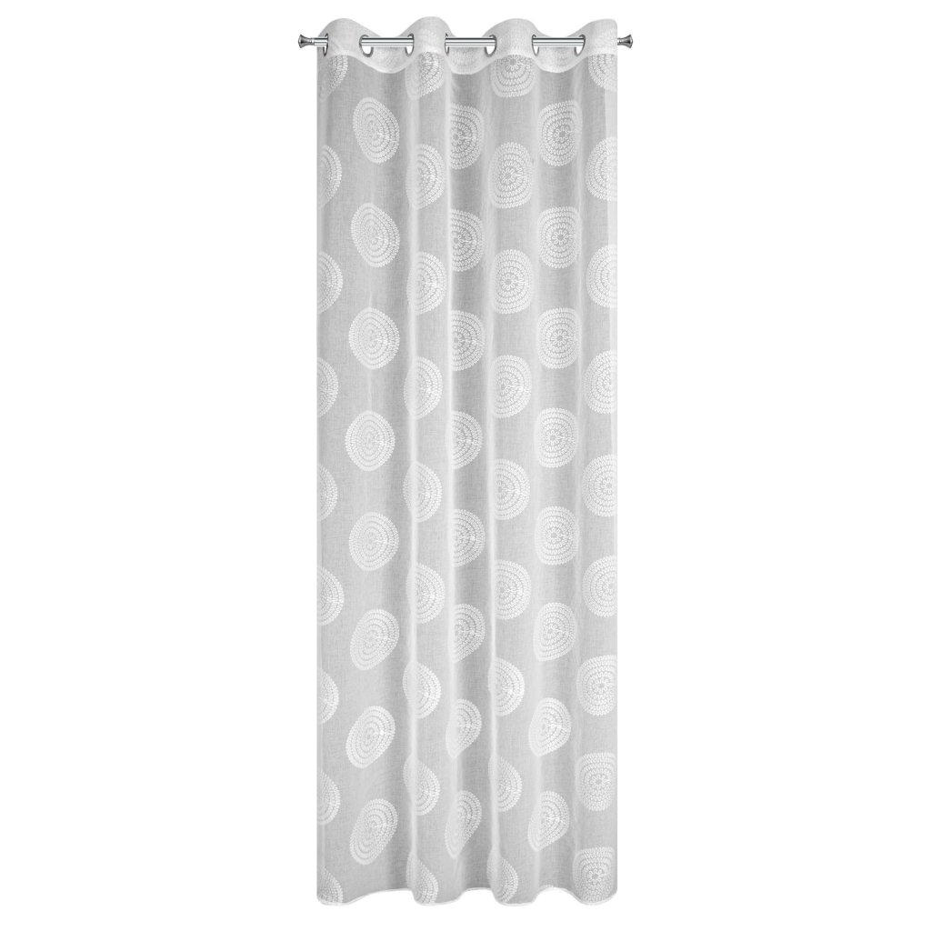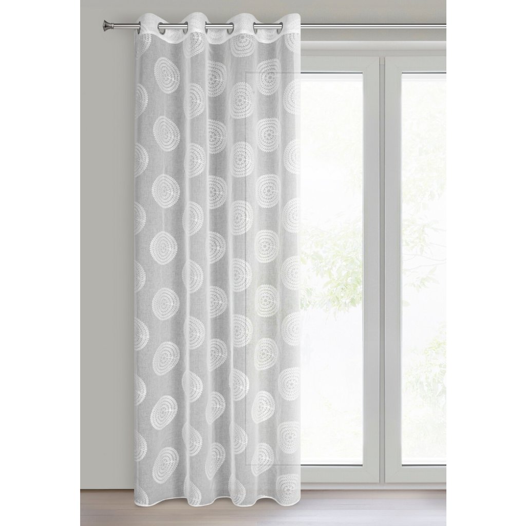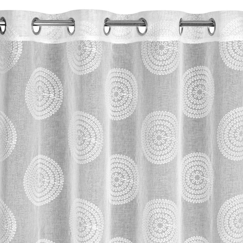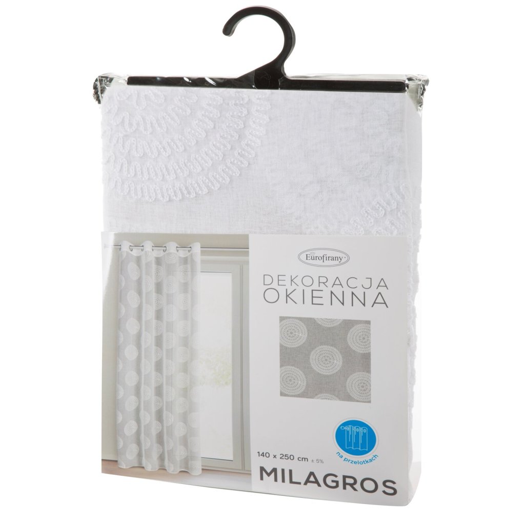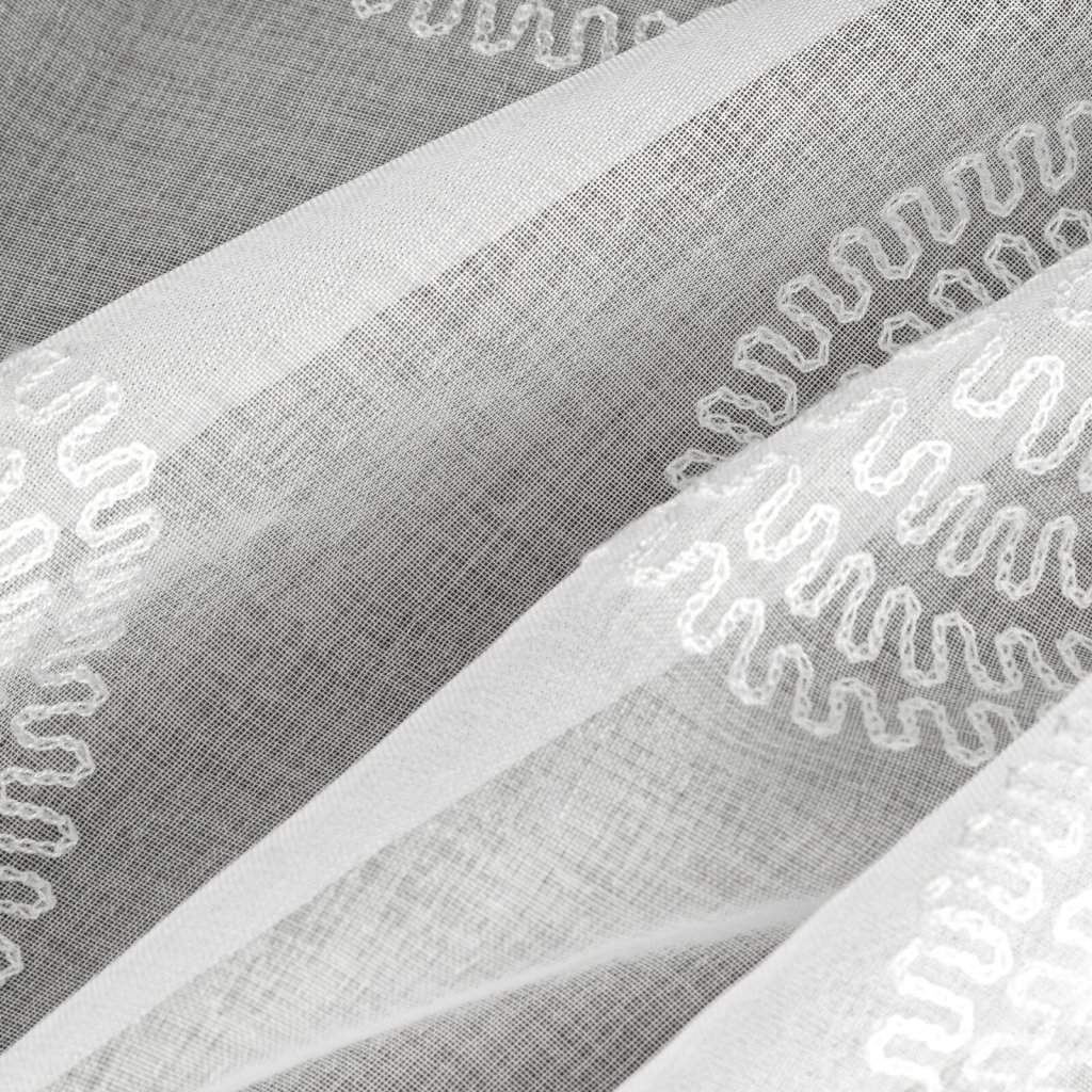 Záclona MILAGROS v bílé barvě, je ušita z matné mikrosíťoviny a zdobená geometrickou výšivkou. Jemný a lehký materiál vypadá nádherně a osvětluje interiér přirozeným světlem.Doplňkové parametry
