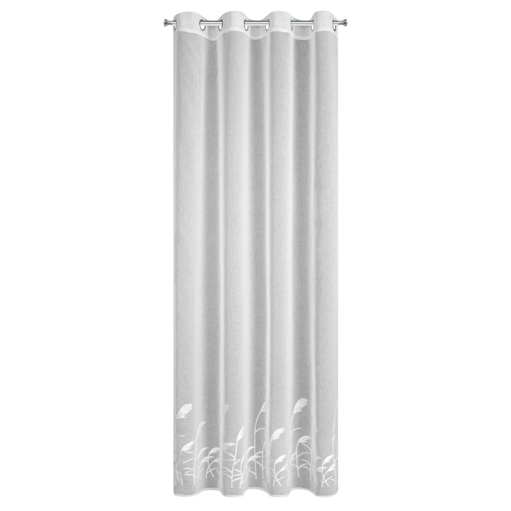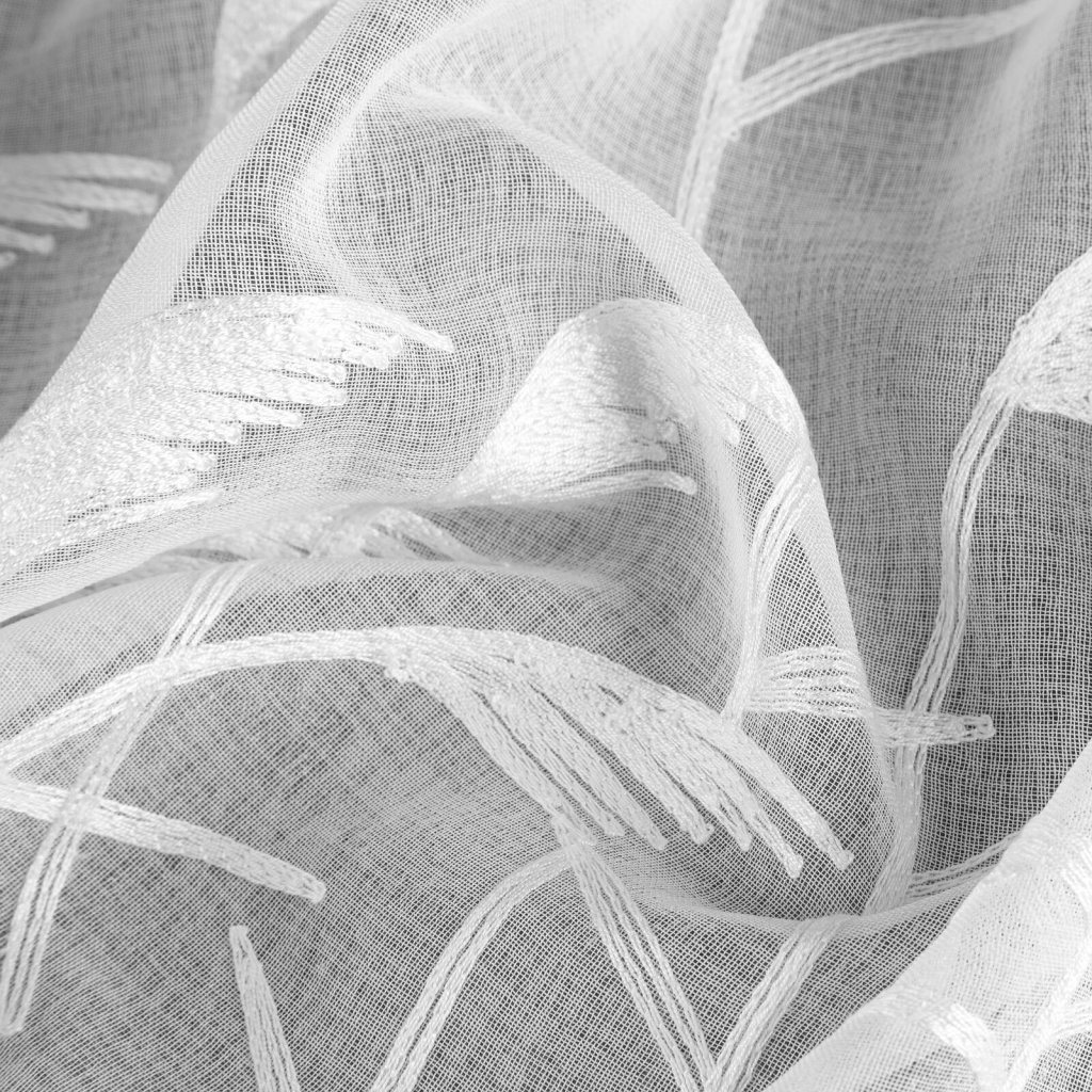 Záclona TASHA kombinuje lehkost gázy s jemnou výšivkou s motivem stébel okrasné trávy, což jí dodává elegantní a moderní nádech. Matná látka rozptyluje světlo a vytváří v místnosti atmosféru klidu a útulnosti, zatímco vyšívaná stébla dodávají prvek lehkosti a sofistikovanosti. Šířka: 140 cm, délka: 250 cm, barva: bílá, hmotnost: 72 GSM, složení: 100% polyester.Doplňkové parametry