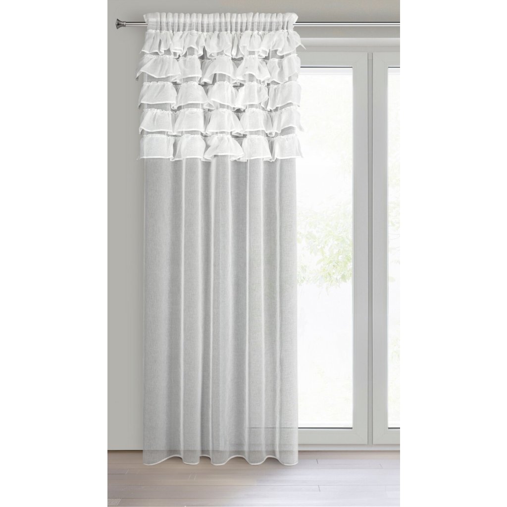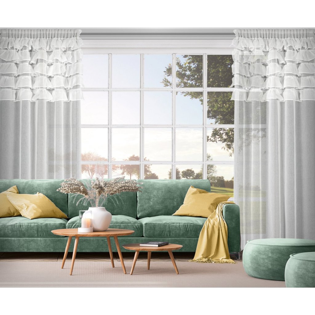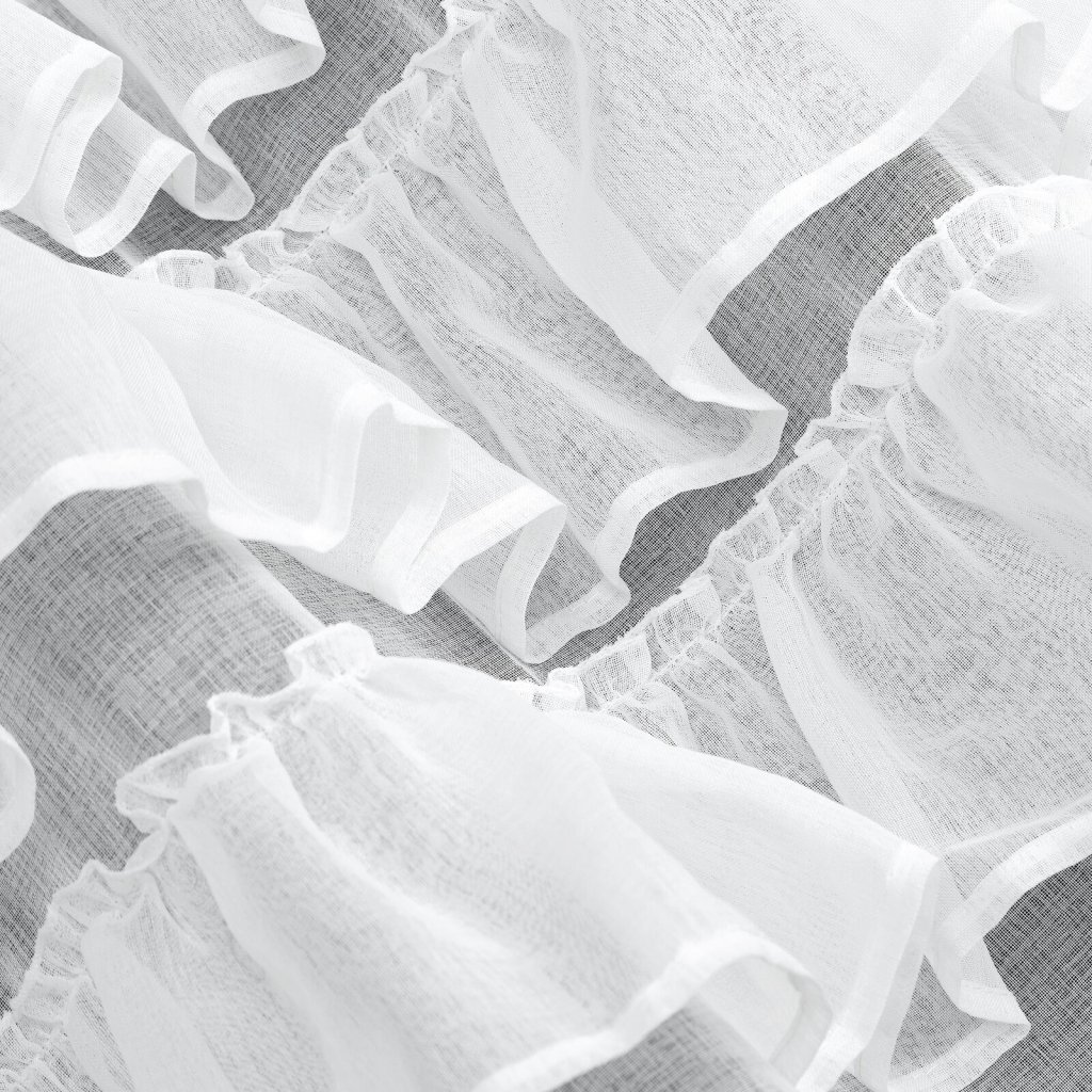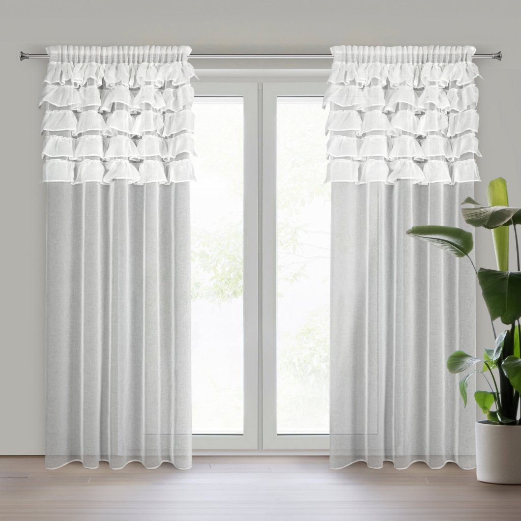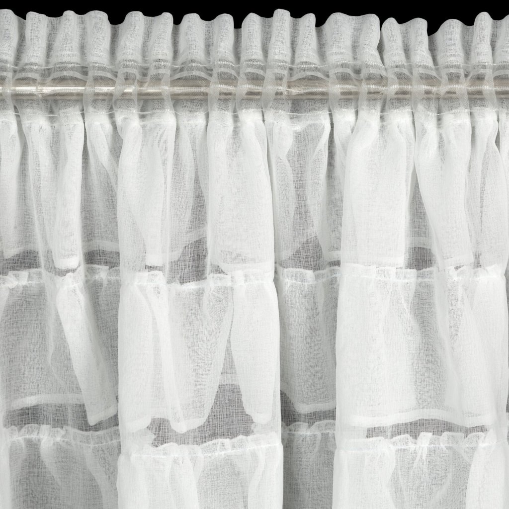 Hotová záclona zdobená volánky v horní části, šířka: 140 cm, délka: 270 cm, barva: bílá, hmotnost: 70 GSM, složení: 100% polyester.Doplňkové parametry