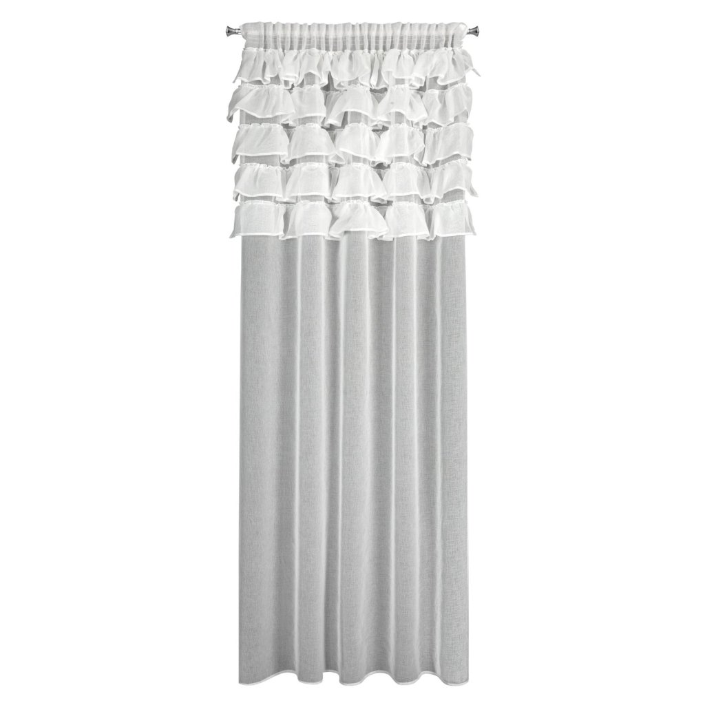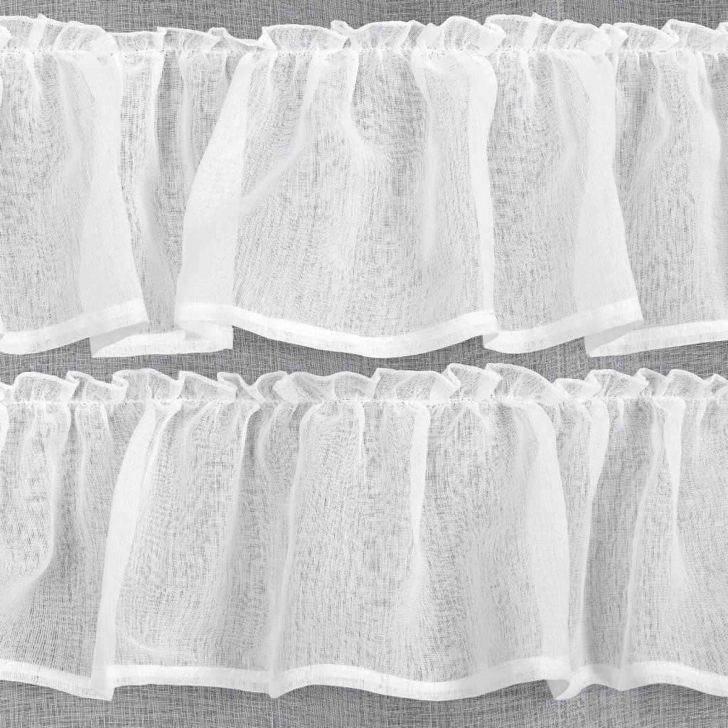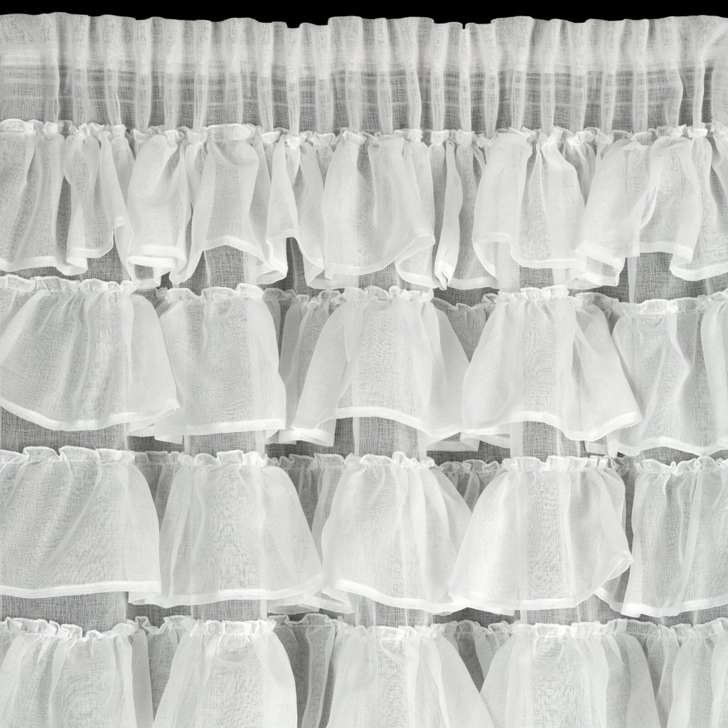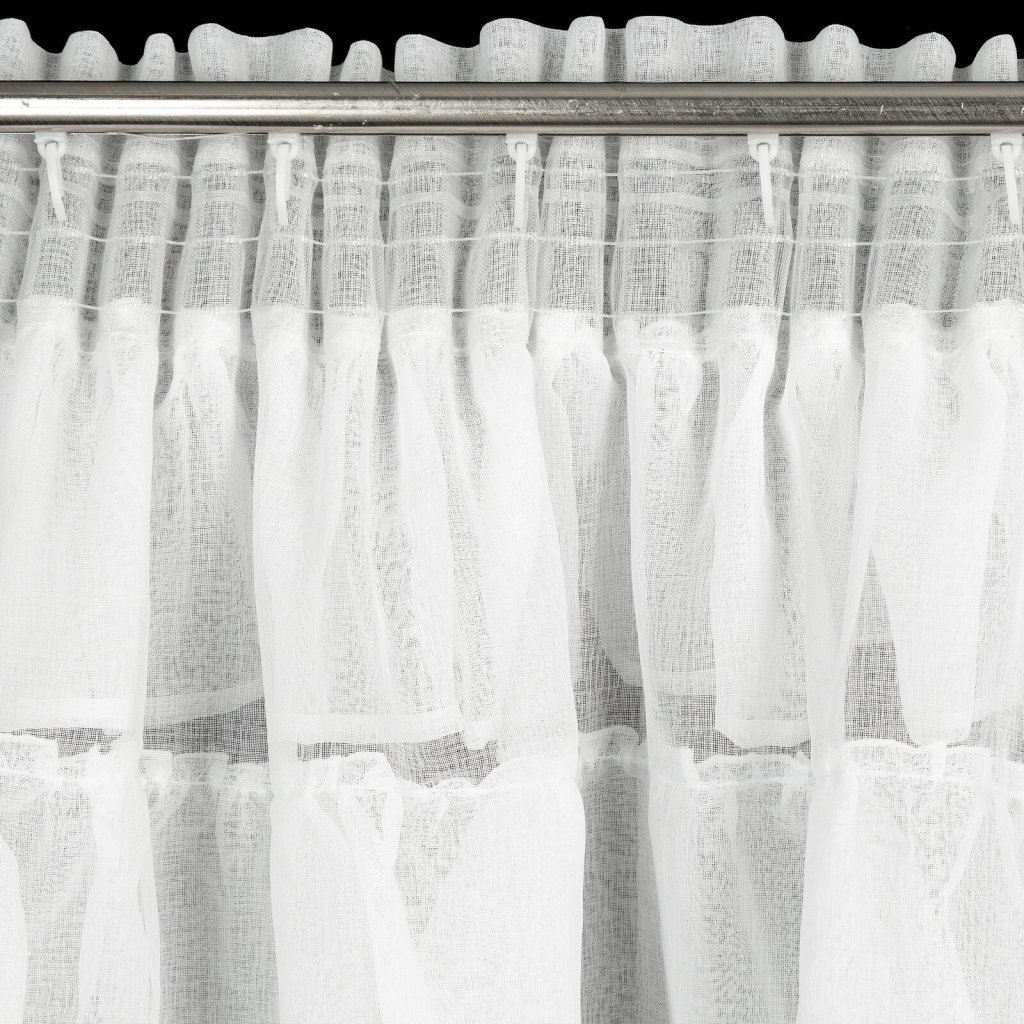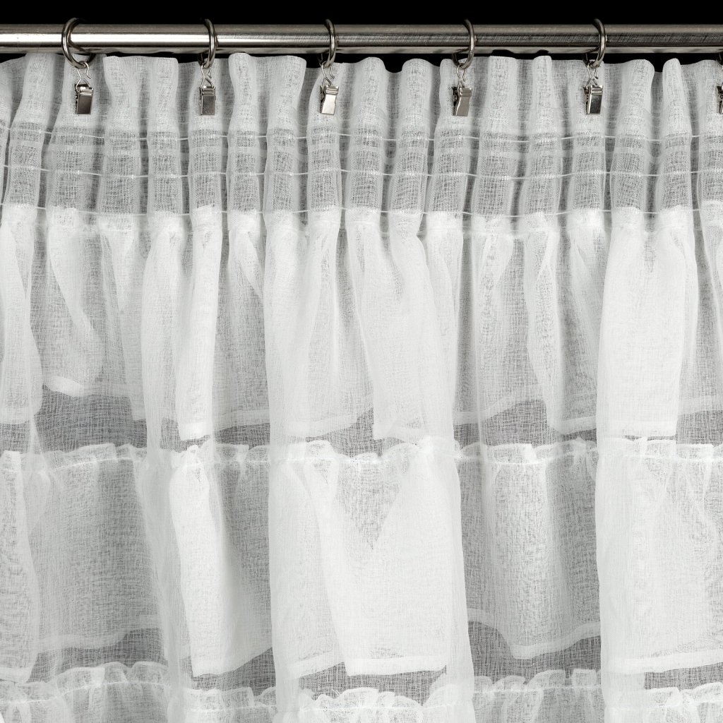 Hotová záclona zdobená volánky v horní části, šířka: 140 cm, délka: 270 cm, barva: bílá, hmotnost: 70 GSM, složení: 100% polyester.Doplňkové parametry