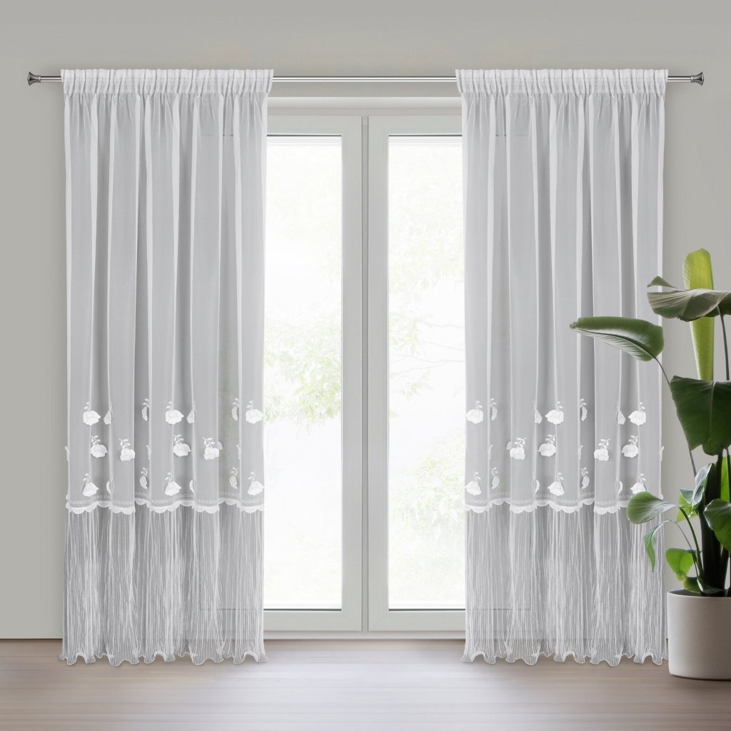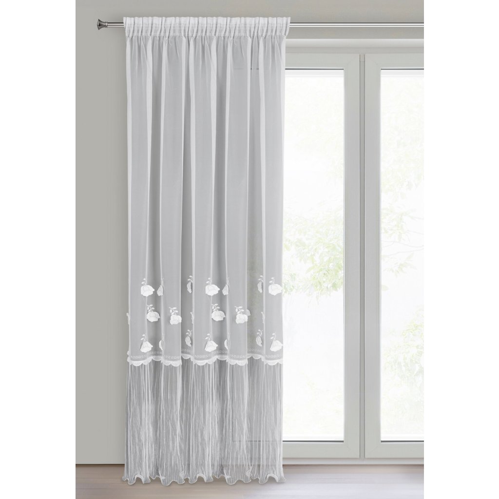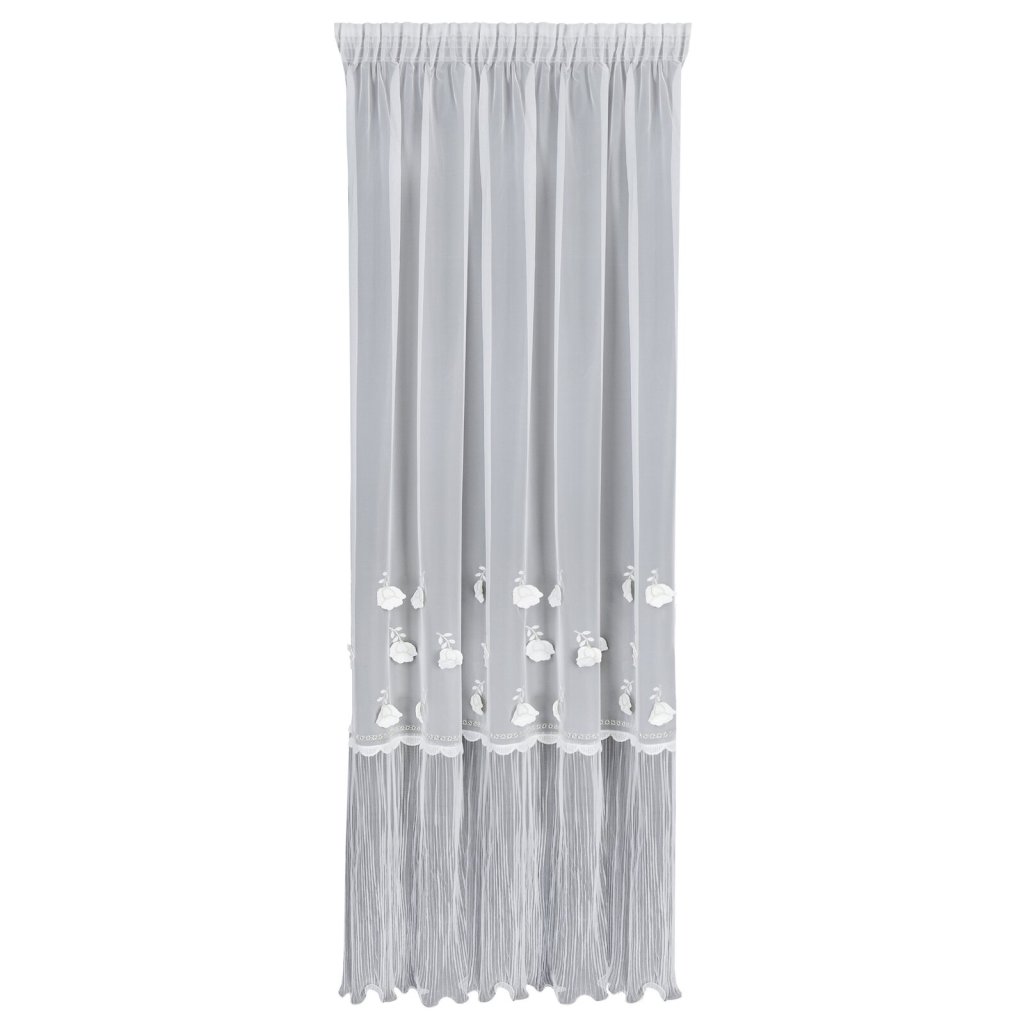 Záclona zaujme dekorativní květinovou aplikací, která mu dodává jedinečný charakter a volán ve spodní části dodává lehkost a stylové zakončení. Šířka: 140 cm, délka: 270 cm, barva: bílá, hmotnost: 50 GSM, složení: 100% polyester.Doplňkové parametry