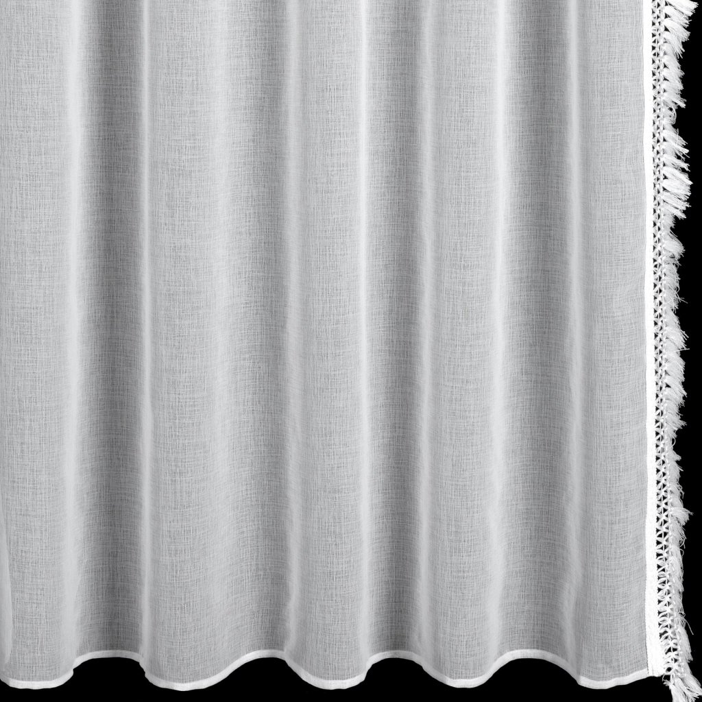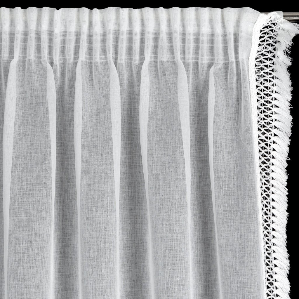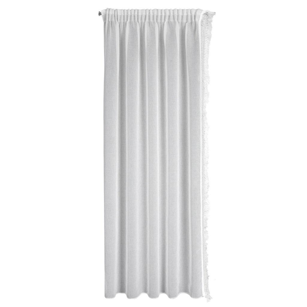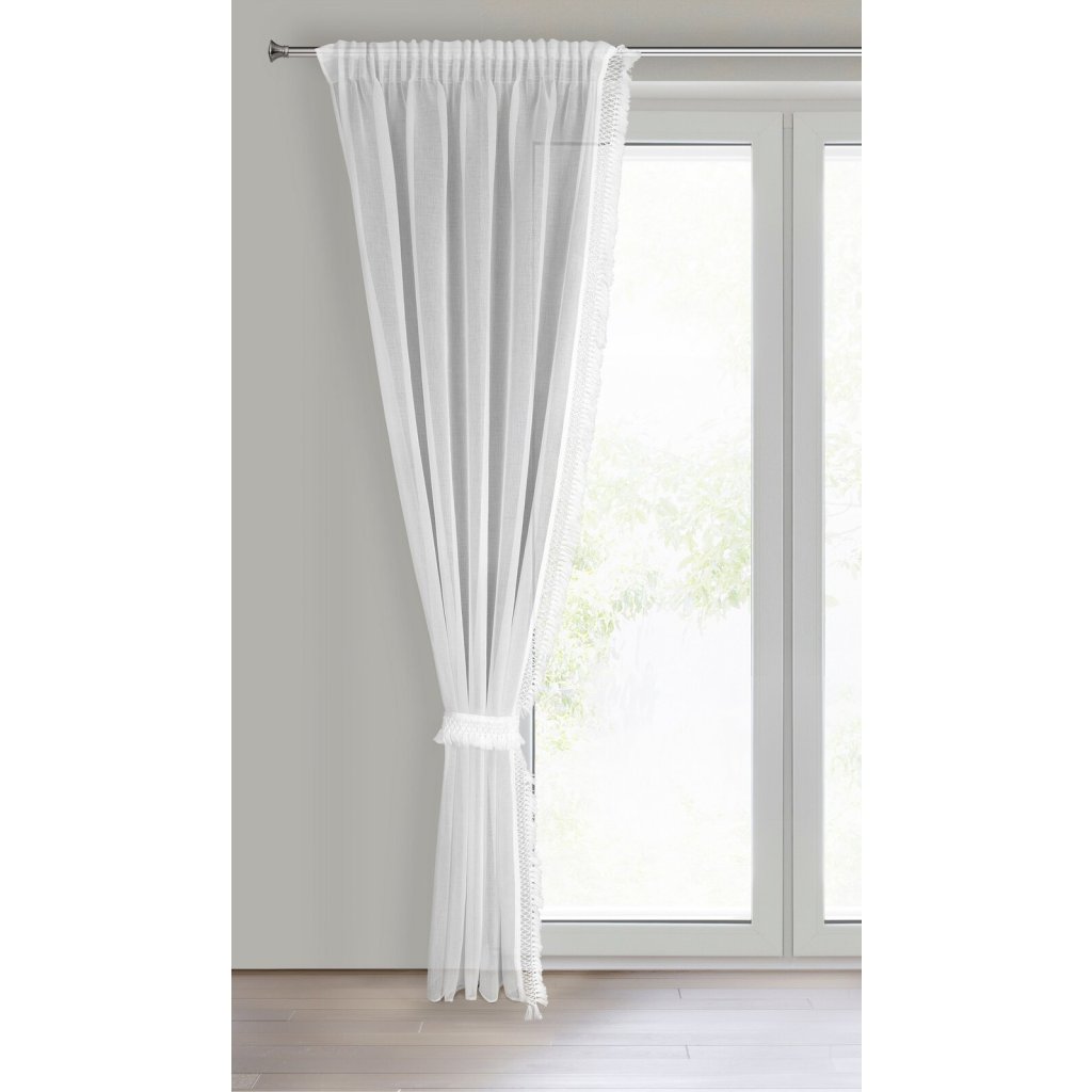 Sada záclon s ozdobnými třásněmi na bocích a šňůrkou, šířka: 140 cm, délka: 270 cm, barva: bílá, hmotnost: 75 GSM, složení: 100% polyester.Doplňkové parametry