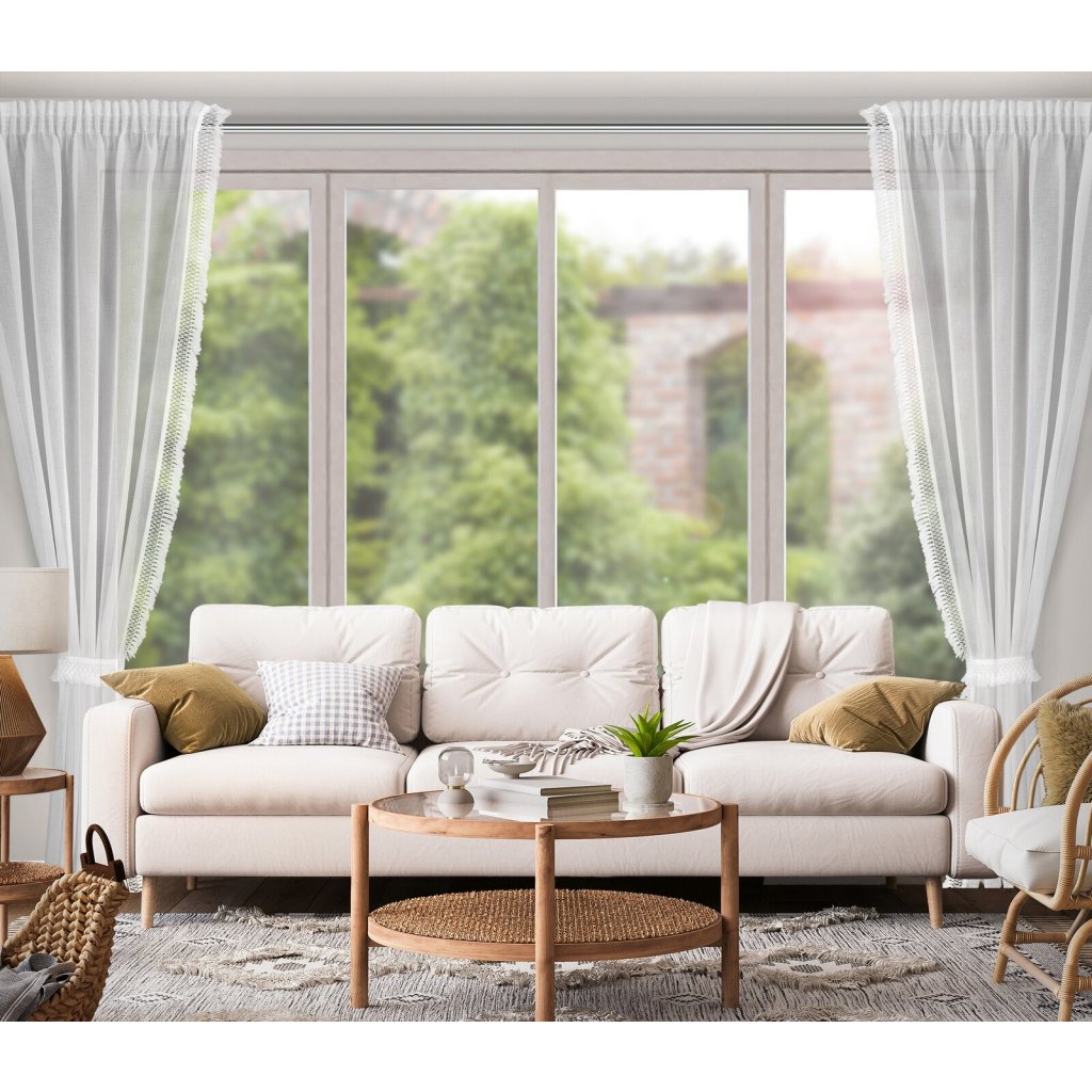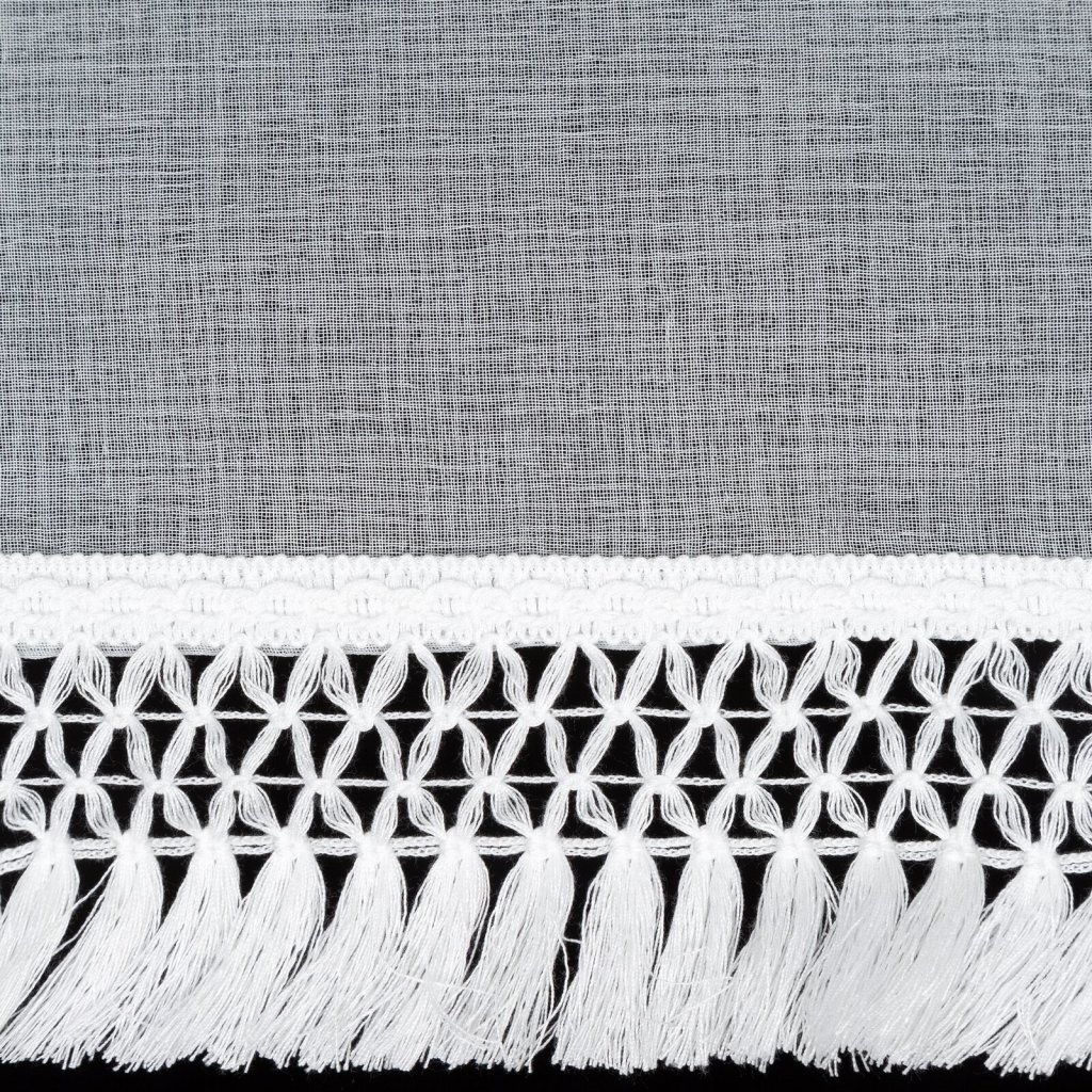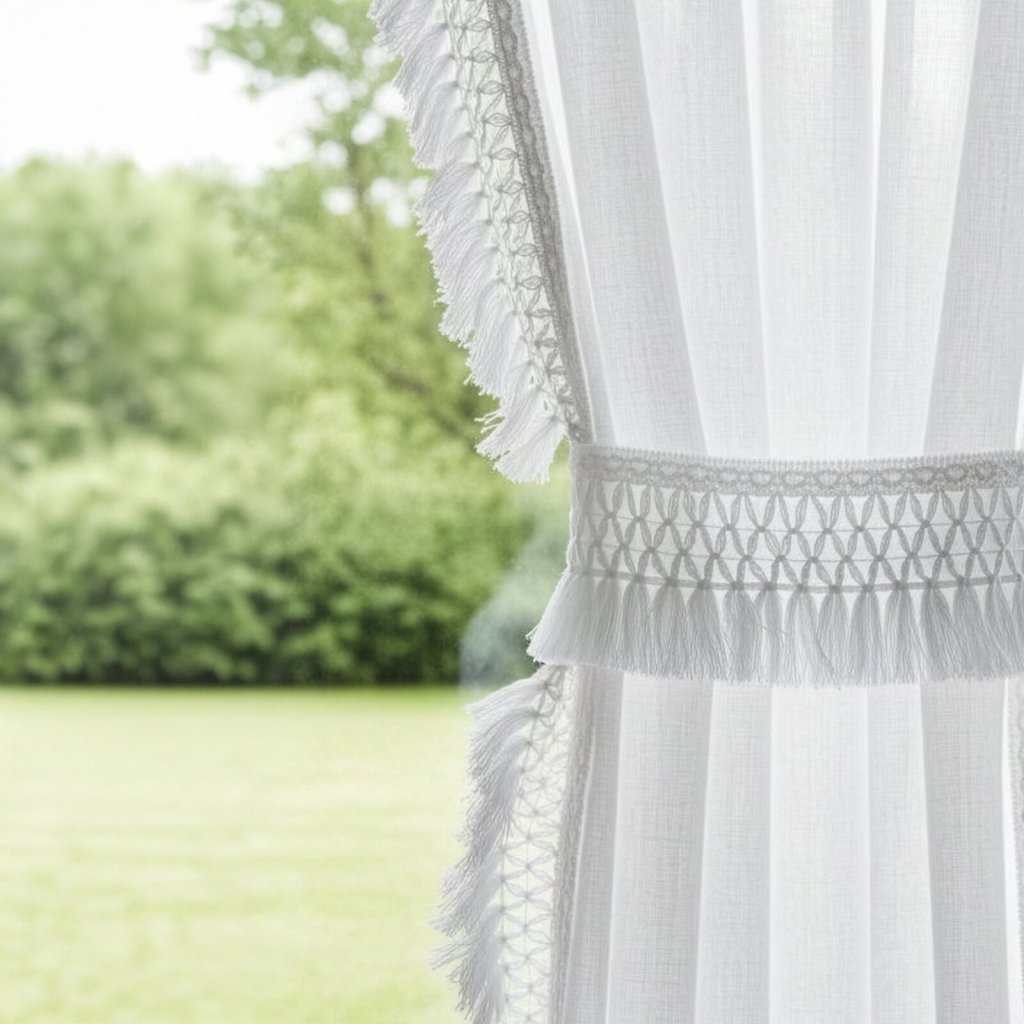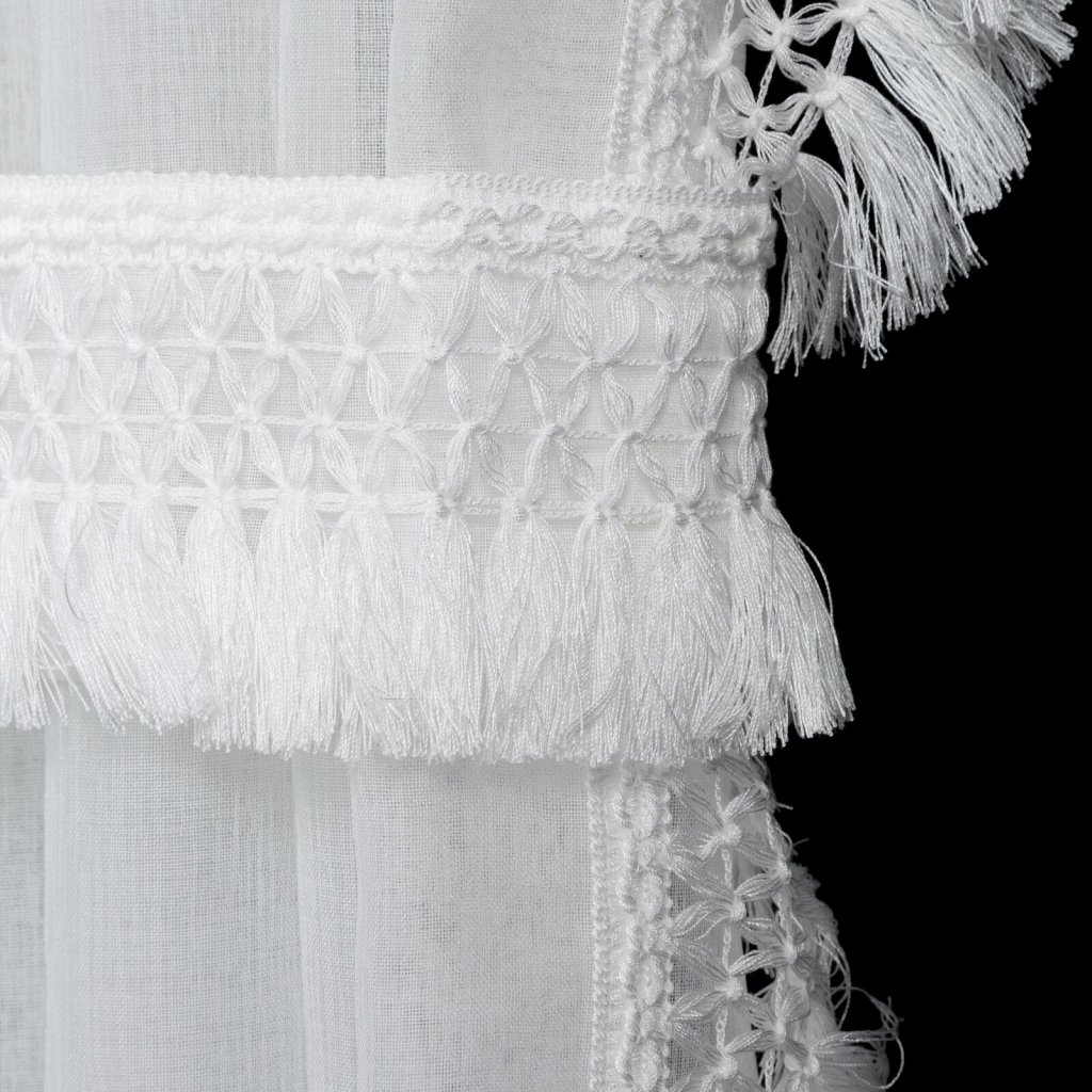 Sada záclon s ozdobnými třásněmi na bocích a šňůrkou, šířka: 140 cm, délka: 270 cm, barva: bílá, hmotnost: 75 GSM, složení: 100% polyester.Doplňkové parametry