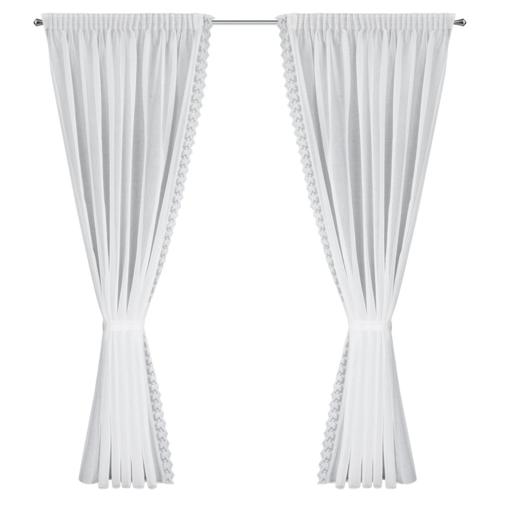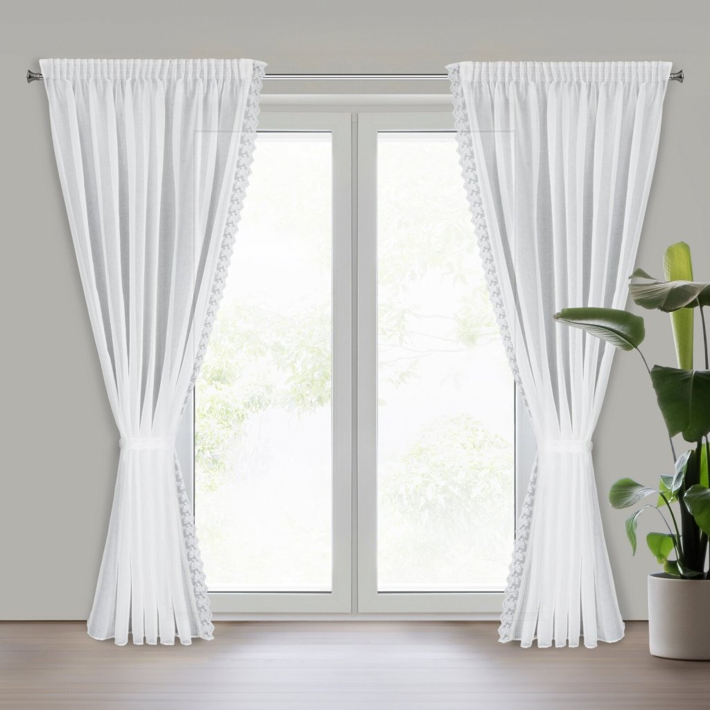 Elegantní a decentní sada dvou hotových záclon SUZAN z gázy je perfektní volbou pro ty, kteří oceňují klasické, jemné záclony s romantickým nádechem. Lehká, poloprůhledná látka krásně rozptyluje světlo a dodává interiéru světlý a útulný pocit. Obě záclony jsou ozdobeny jemnou krajkou, která jim dodává dekorativní a nenápadný nádech. Šířka: 140 cm, délka: 270 cm, barva: bílá, hmotnost: 70 GSM, složení: 100% polyester.Buďte první, kdo napíše příspěvek k této položce.