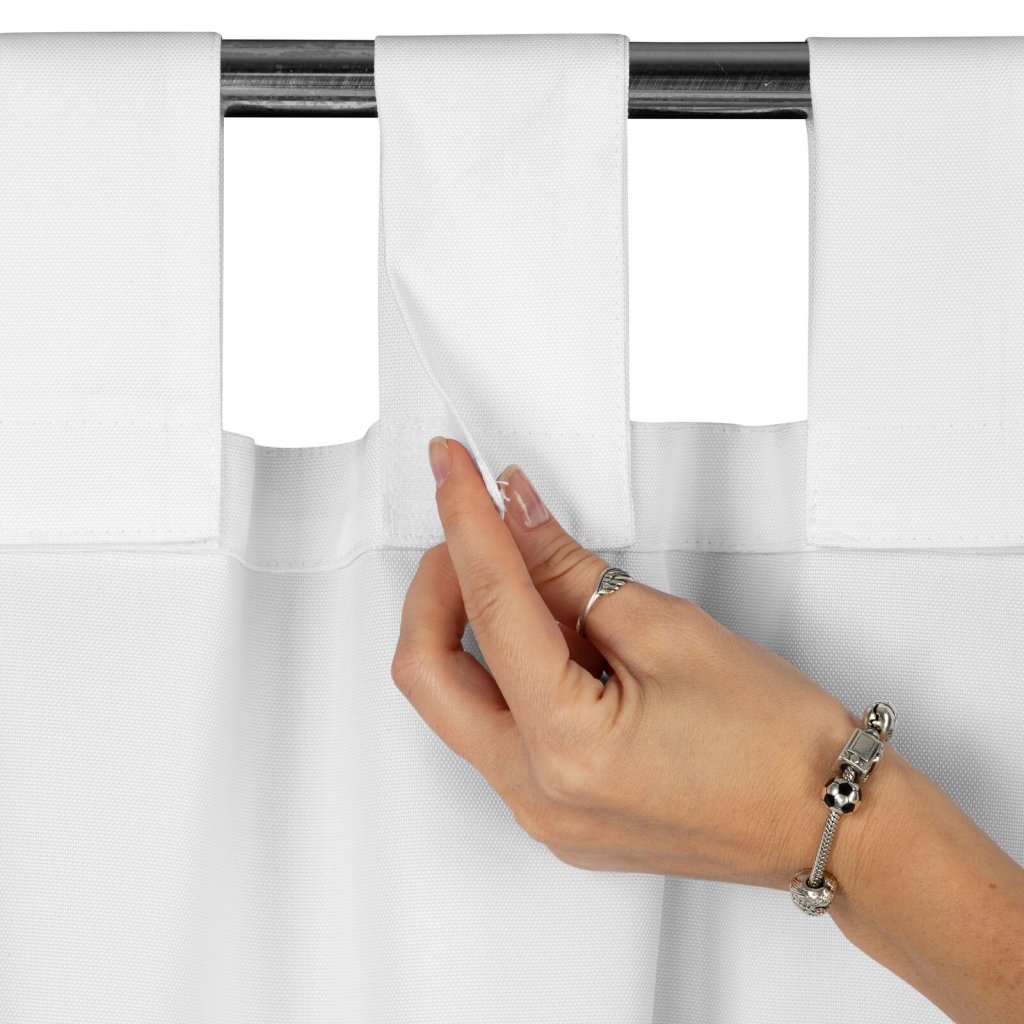 Zahradní voděodolný závěs s ramínky na suchý zip, šířka: 155 cm, délka: 240 cm, barva: bílá (zářivě bílá), hmotnost: 180 GSM, složení: 100% polyester.Doplňkové parametry