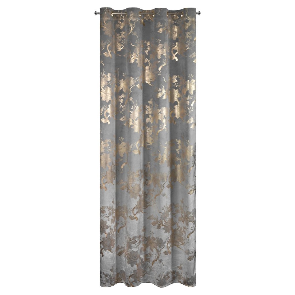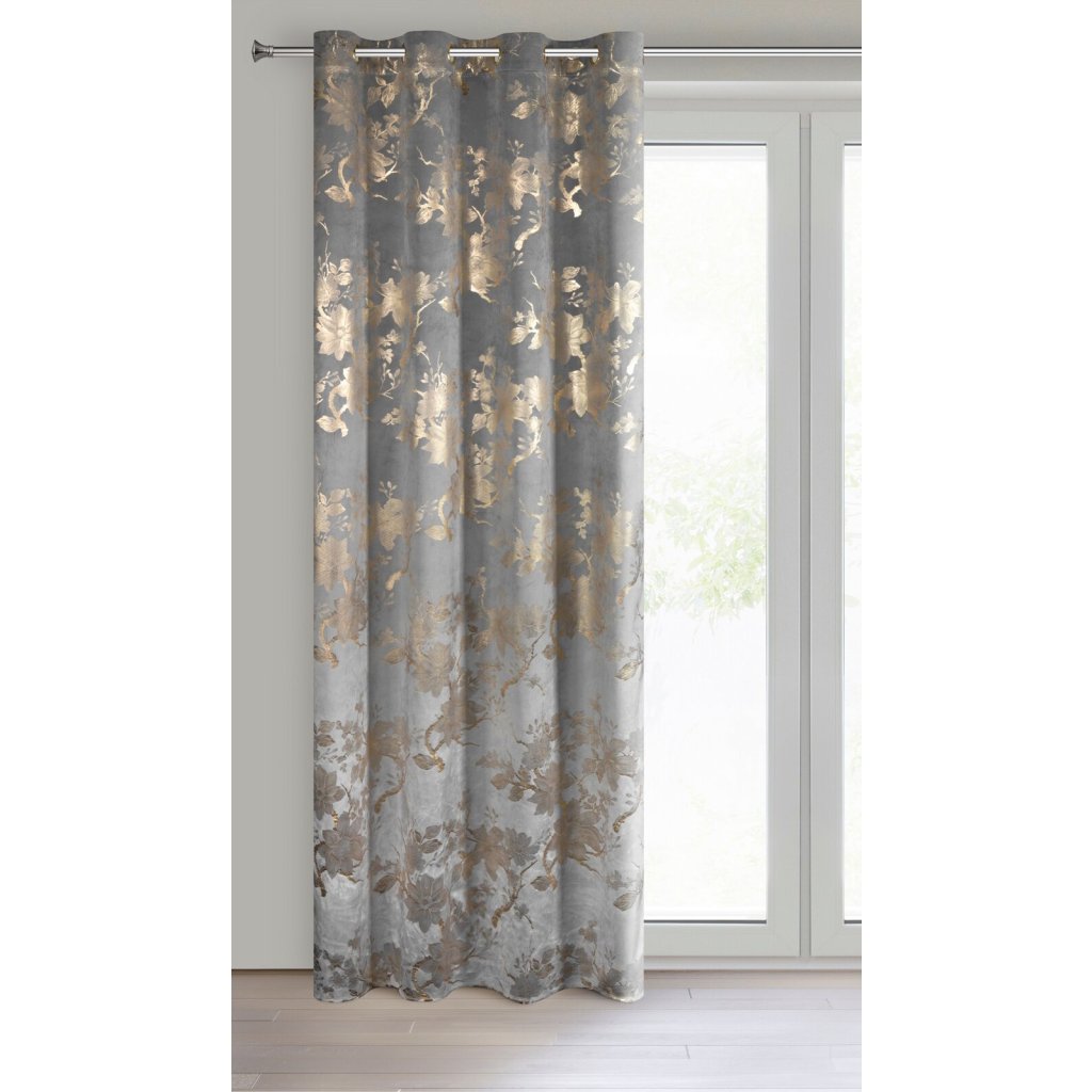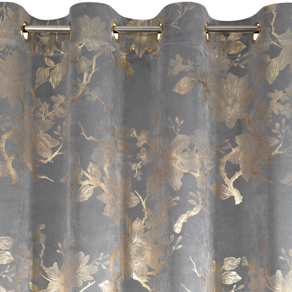Hotový sametový závěs s lesklým zlatým potiskem se vzorem květin, šířka: 140 cm, délka: 250 cm, barva: šedá, gramáž: 200 GSM, složení: 100% polyester.Doplňkové parametry