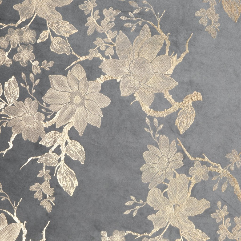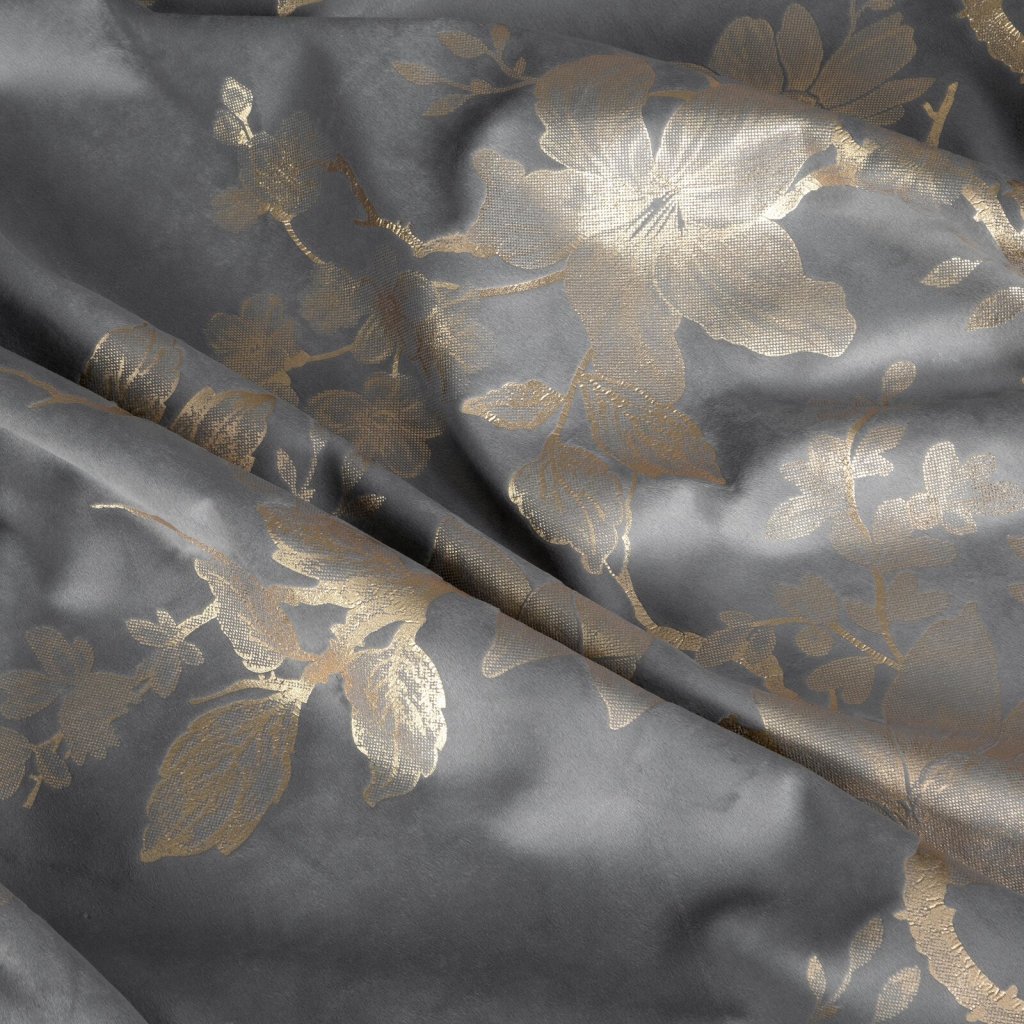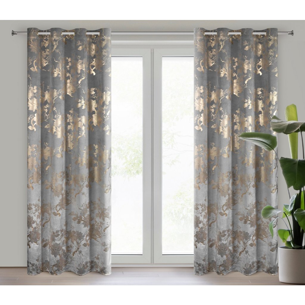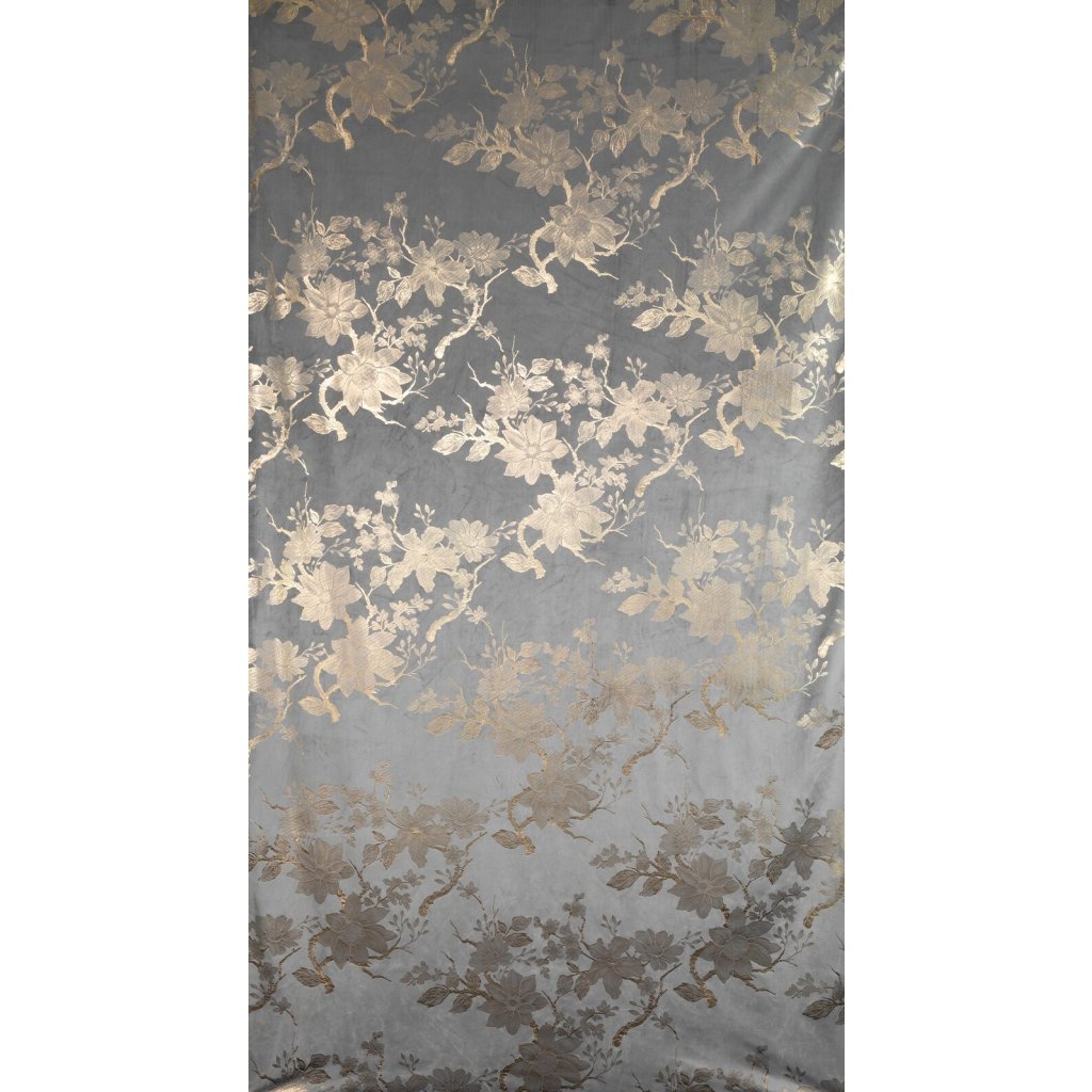 Hotový sametový závěs s lesklým zlatým potiskem se vzorem květin, šířka: 140 cm, délka: 250 cm, barva: šedá, gramáž: 200 GSM, složení: 100% polyester.Doplňkové parametry