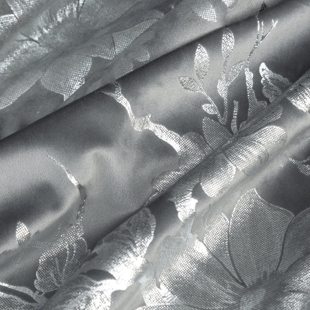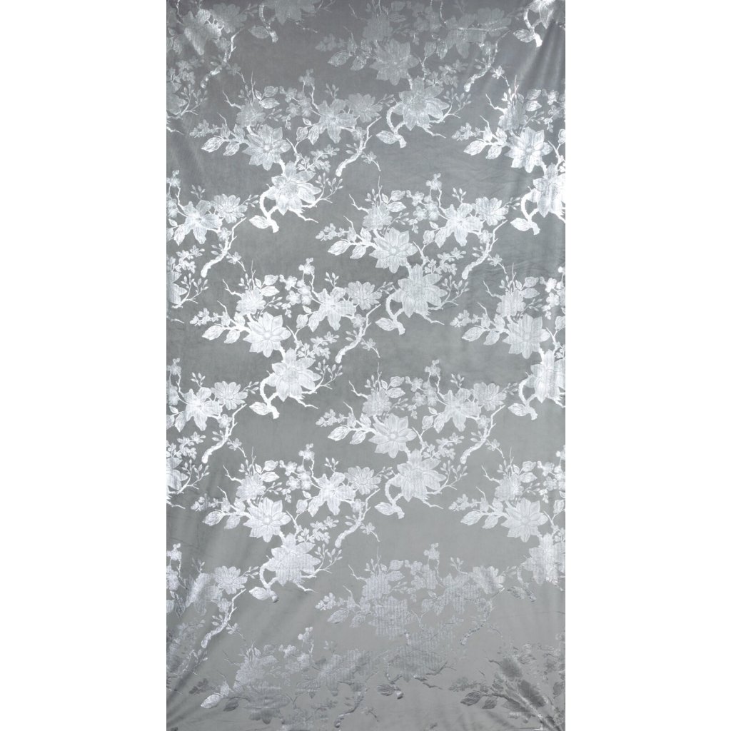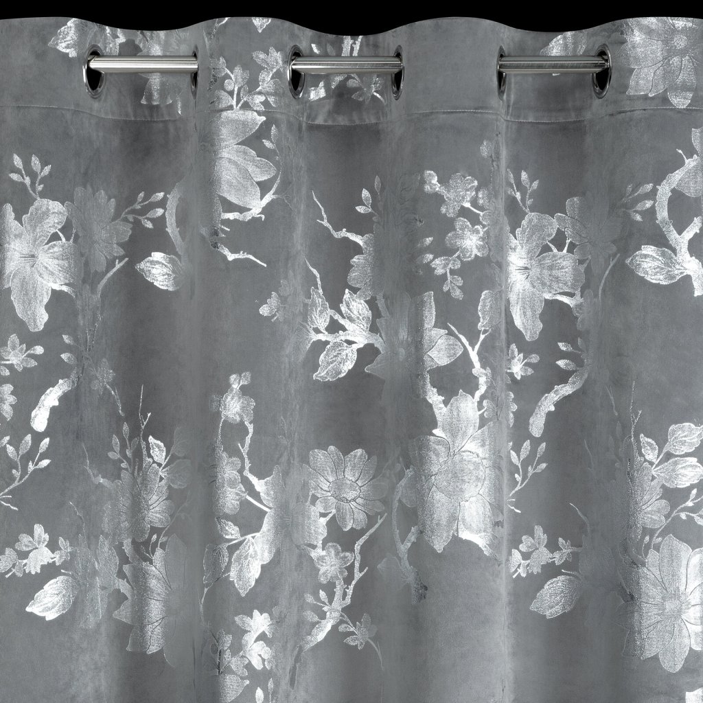 Hotový sametový závěs s lesklým stříbrným potiskem se vzorem květin, šířka: 140 cm, délka: 250 cm, barva: stříbrná, gramáž: 200 GSM, složení: 100% polyester.Doplňkové parametry