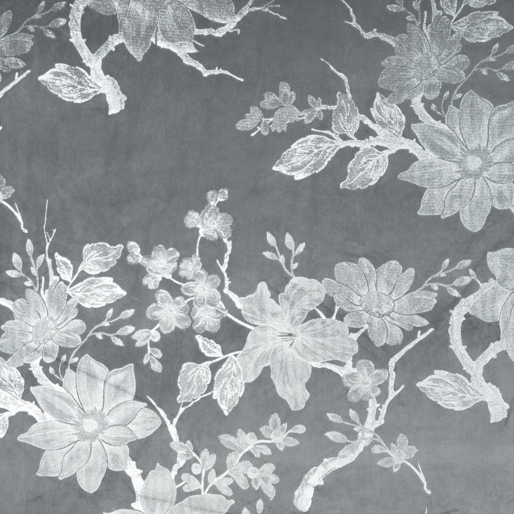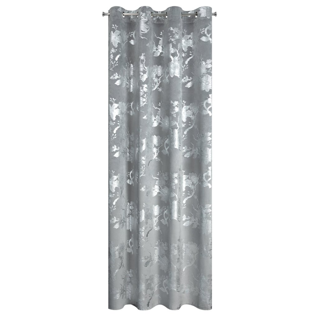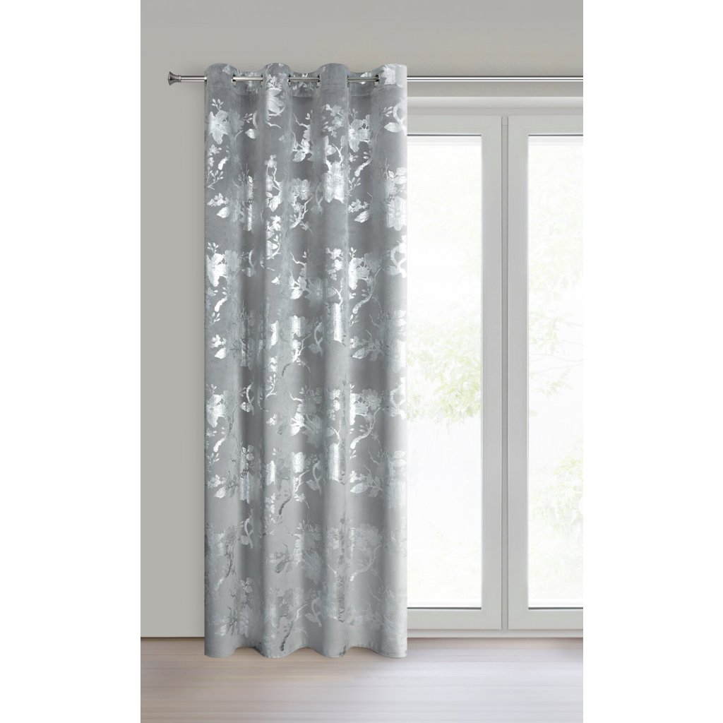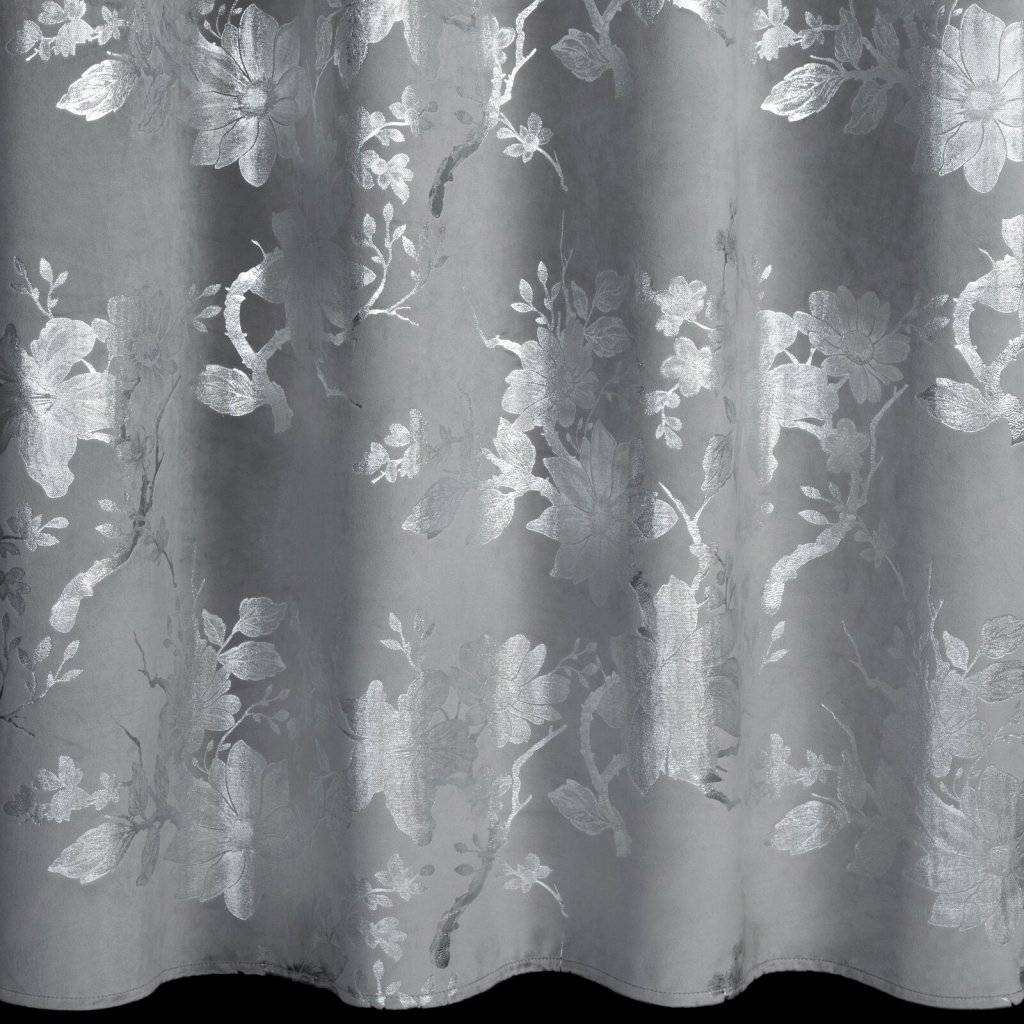 Hotový sametový závěs s lesklým stříbrným potiskem se vzorem květin, šířka: 140 cm, délka: 250 cm, barva: stříbrná, gramáž: 200 GSM, složení: 100% polyester.Doplňkové parametry