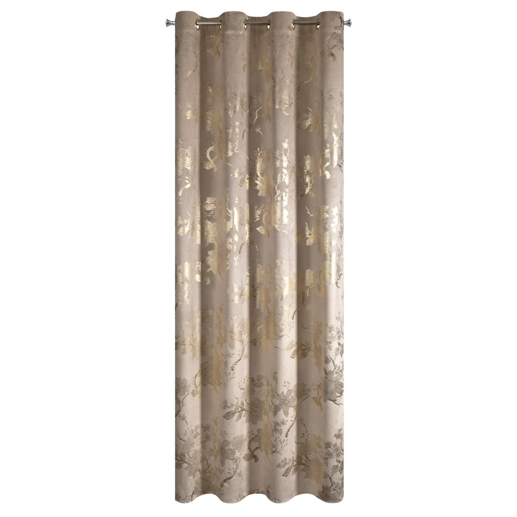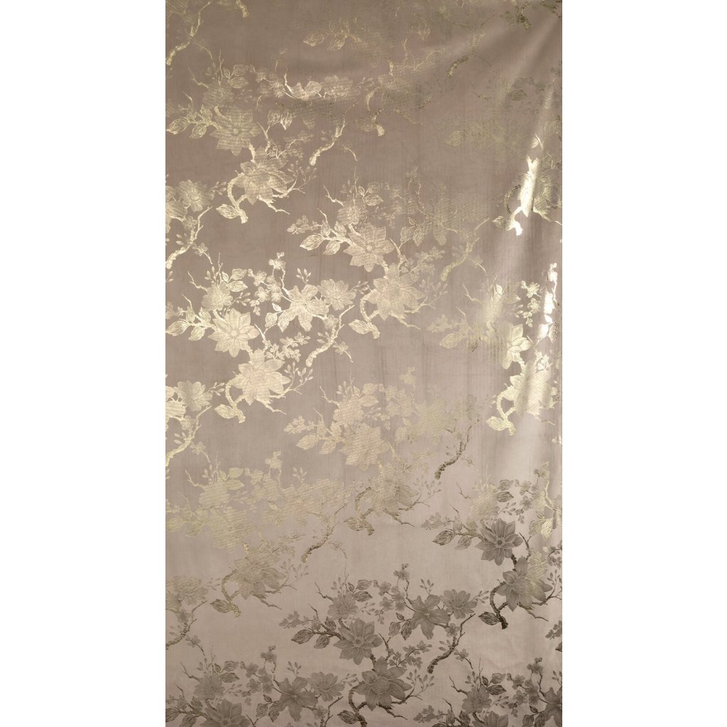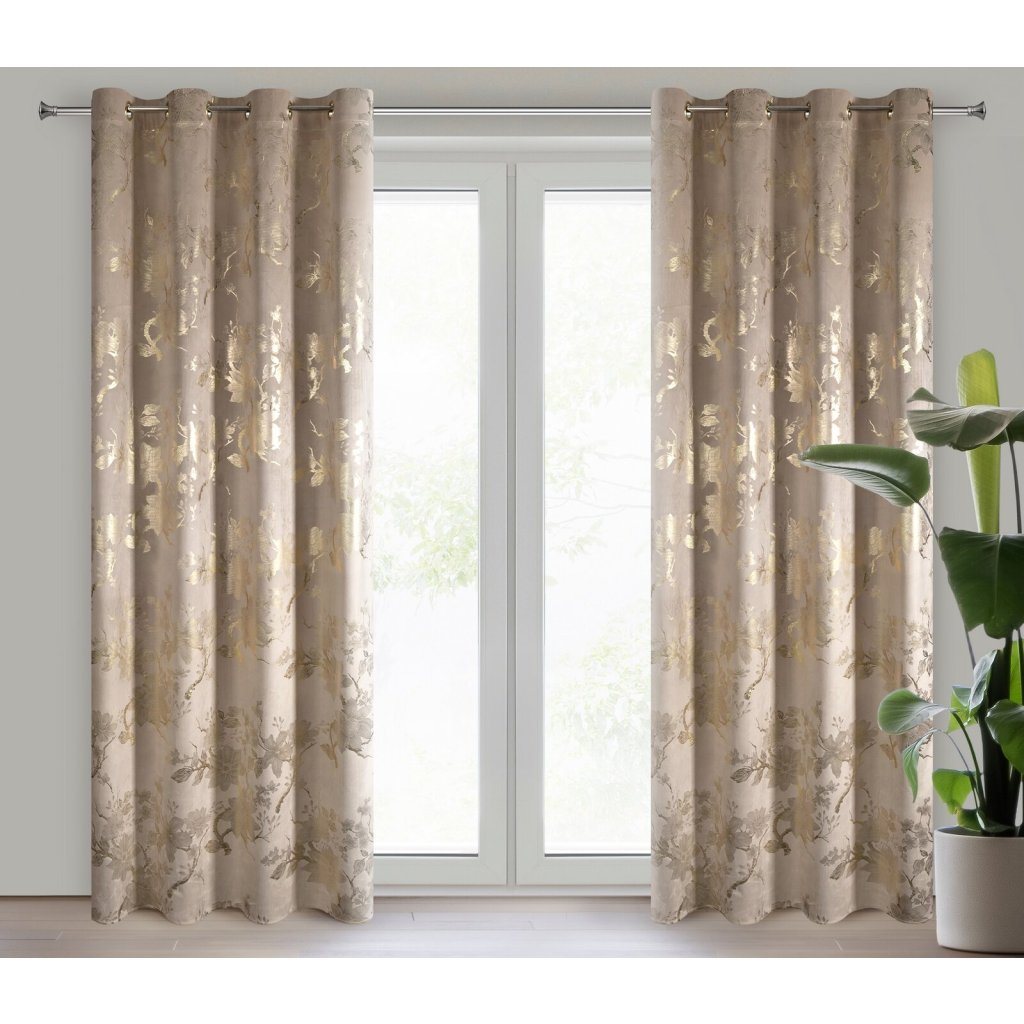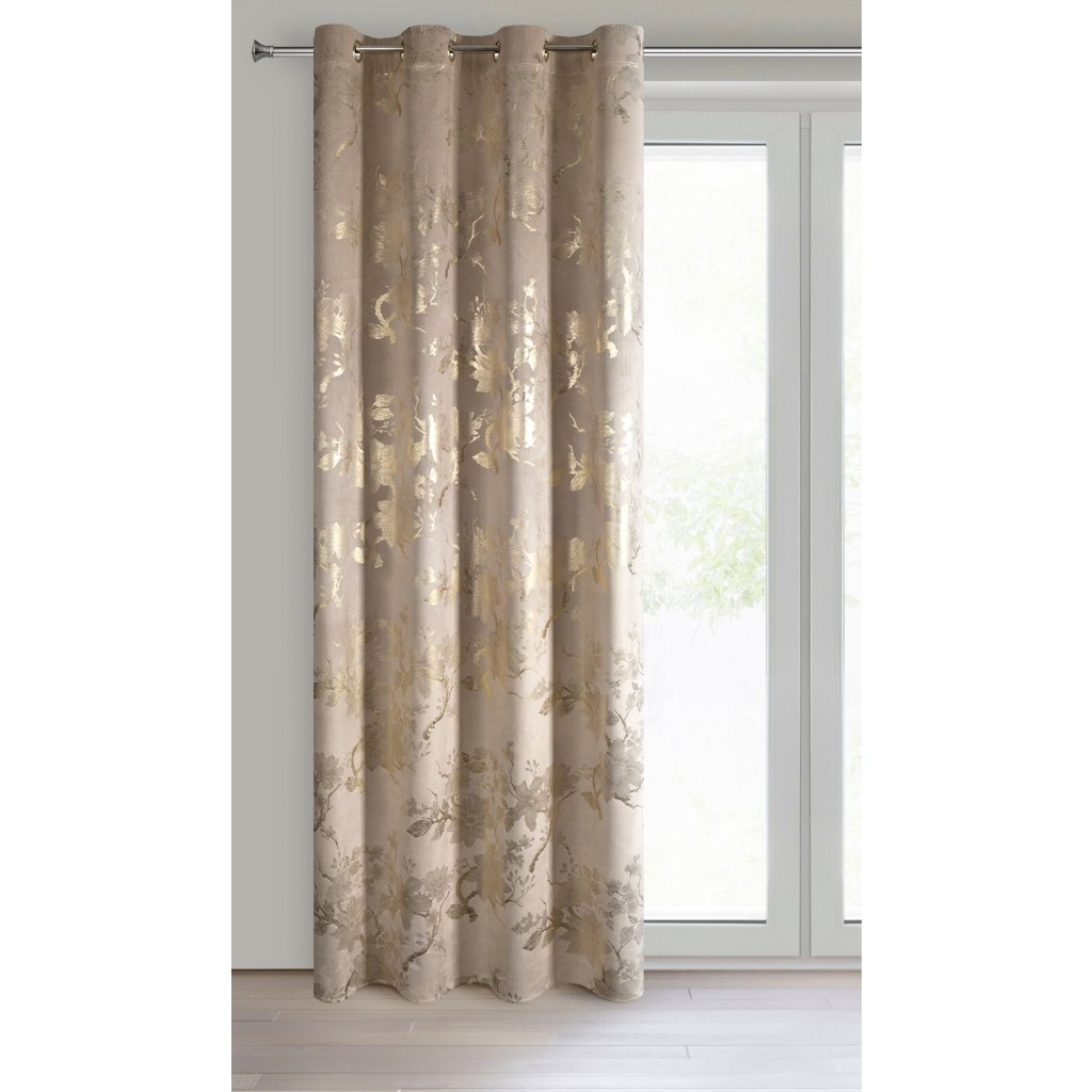 Hotový sametový závěs s lesklým zlatým potiskem se vzorem květin, šířka: 140 cm, délka: 250 cm, barva: béžová, gramáž: 200 GSM, složení: 100% polyester.Doplňkové parametry