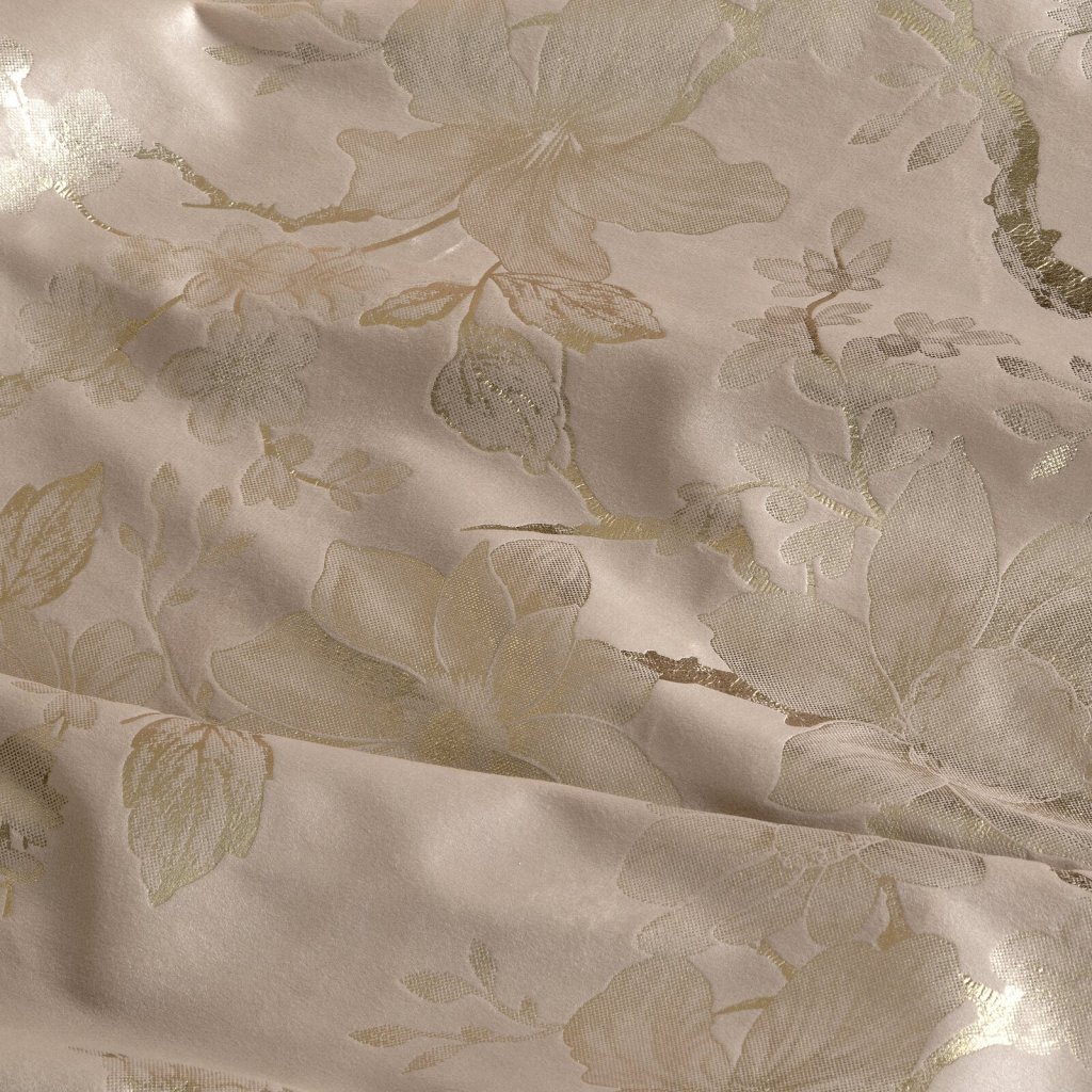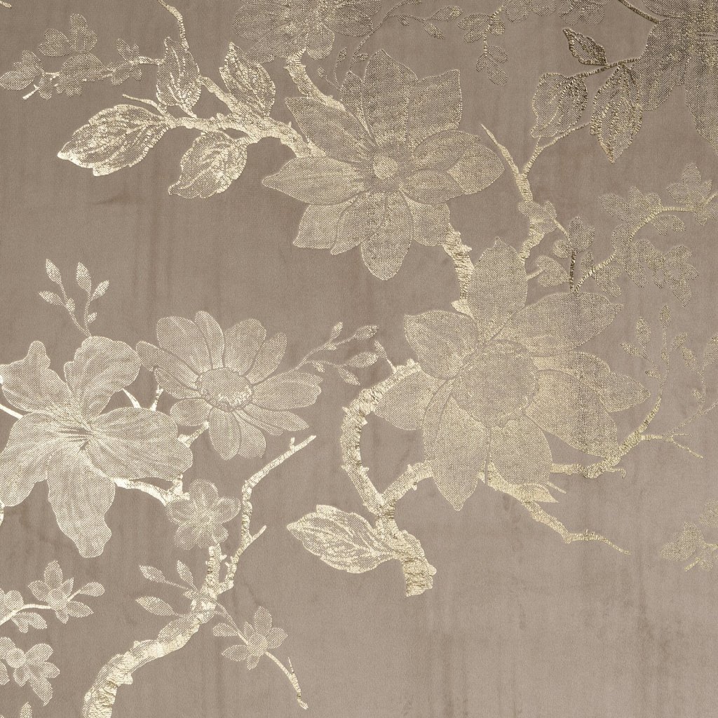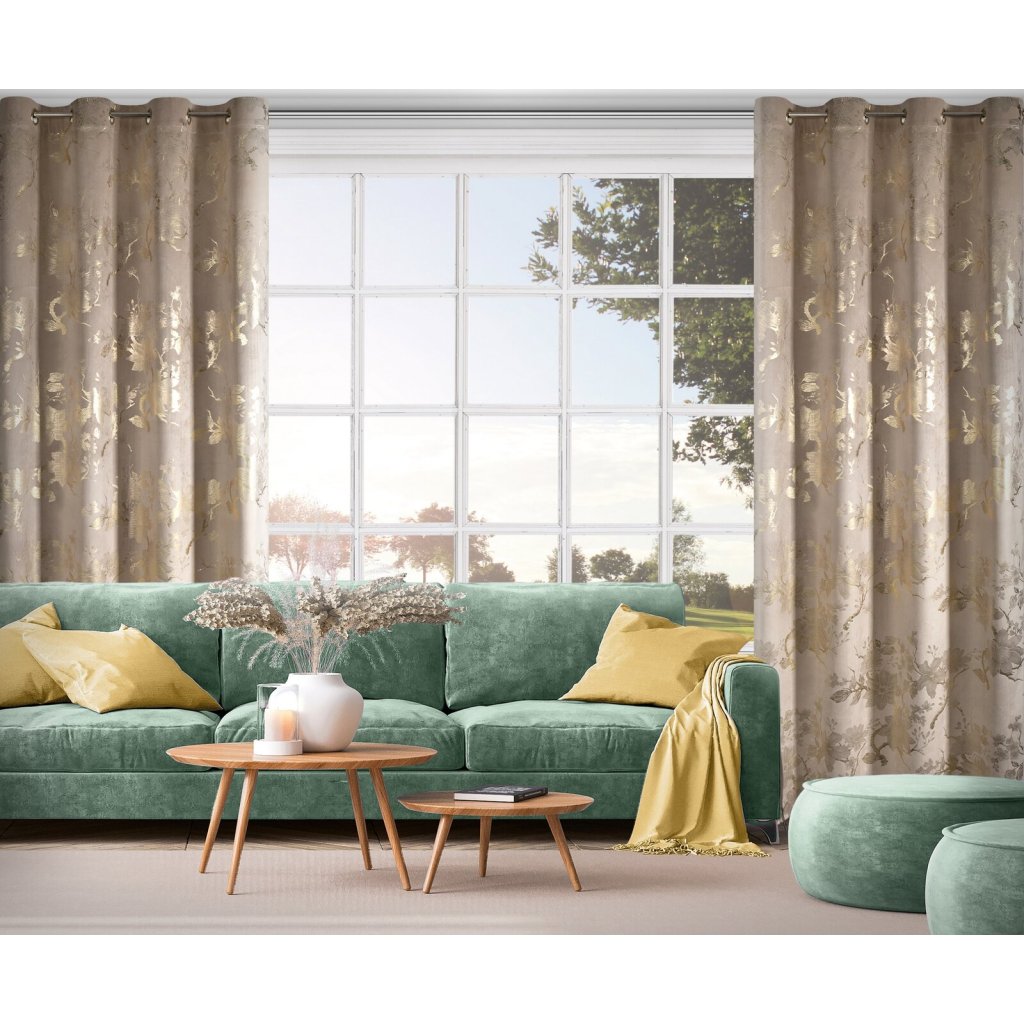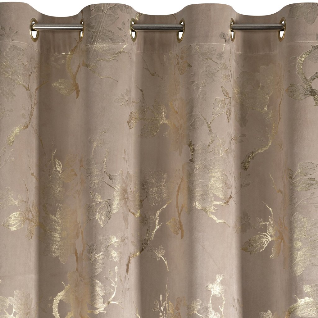 Hotový sametový závěs s lesklým zlatým potiskem se vzorem květin, šířka: 140 cm, délka: 250 cm, barva: béžová, gramáž: 200 GSM, složení: 100% polyester.Doplňkové parametry