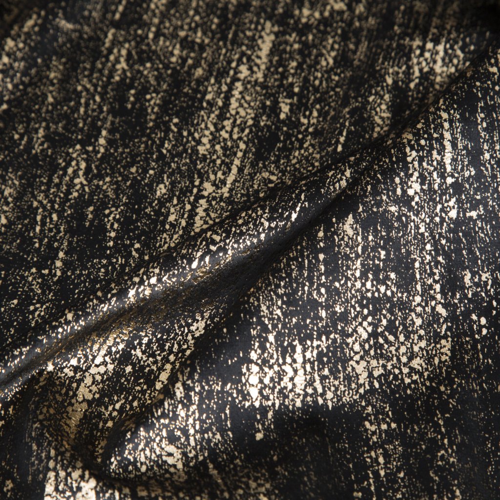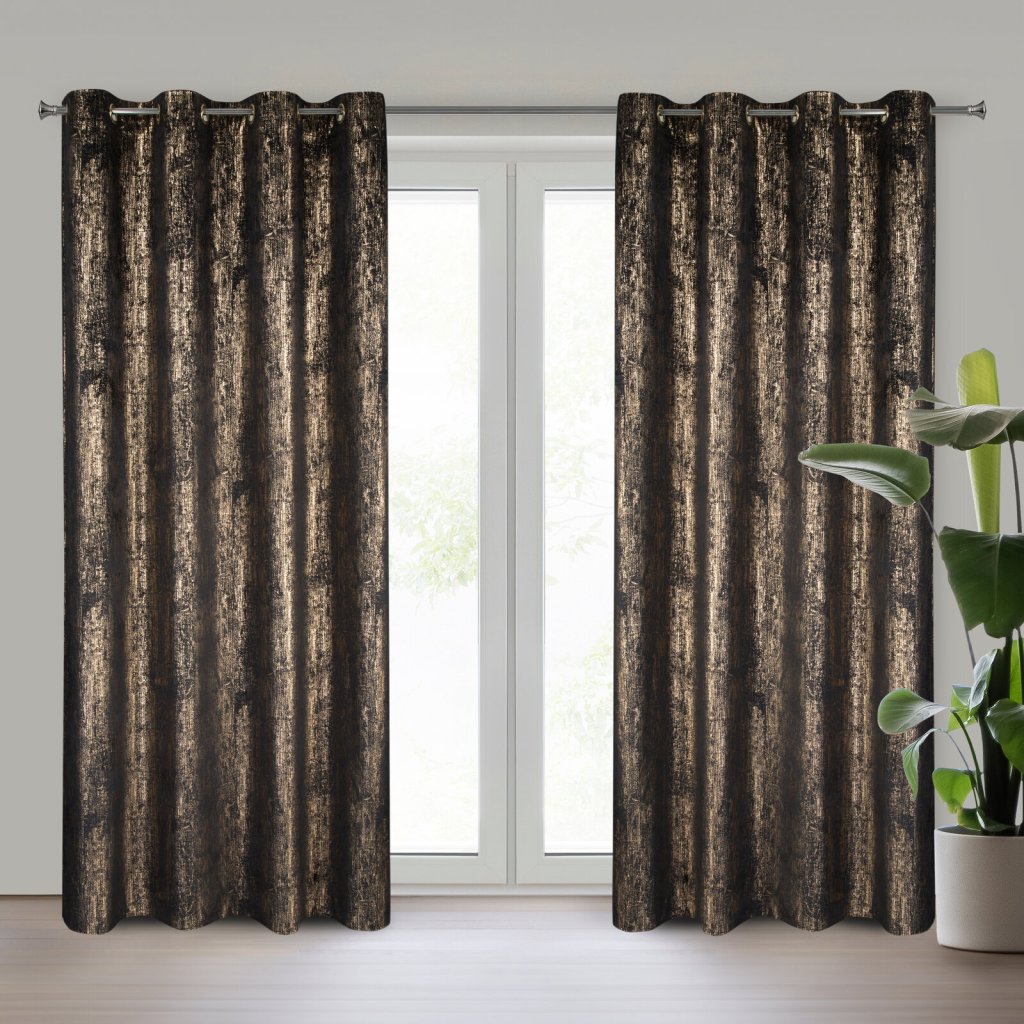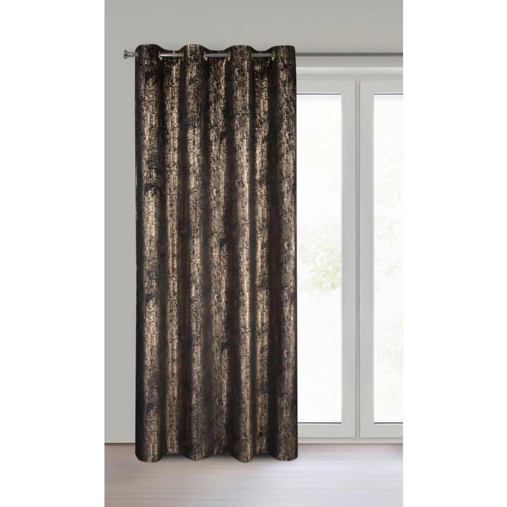 Elegantní sametový závěs DARA s lesklým potiskem dodá interiéru nádech luxusu a moderního stylu. Díky jemnému lesku krásně odráží světlo a vytváří útulnou, harmonickou atmosféru. Šířka: 140 cm, délka: 250 cm, barva: černá a zlatá, hmotnost: 200 GSM, složení: 100% polyester.Doplňkové parametry