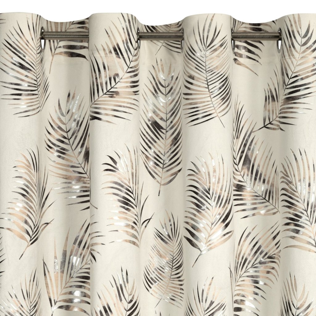 Motiv exotických palmových listů zdobících závěs GLORIA ze sametové látky příjemné na dotek dodá vašemu interiéru slavnostní charakter. třpytivý potisk exotických listů ve stříbrných a zlatých barvách aplikovaný na kontrastní pozadí, čímž vzniká mimořádná kompozice věnovaná moderním interiérům. Hrubší tkanina dokonale izoluje sluneční světlo a zajišťuje příjemnou atmosféru v místnosti, závěs má střední stupeň zatemnění. Šířka: 140 cm, délka: 250 cm, barva: vícebarevná, hmotnost: 200 GSM, složení: 100% polyester.Doplňkové parametry
