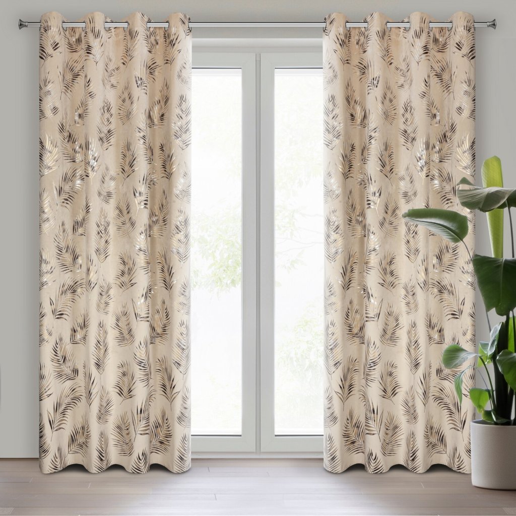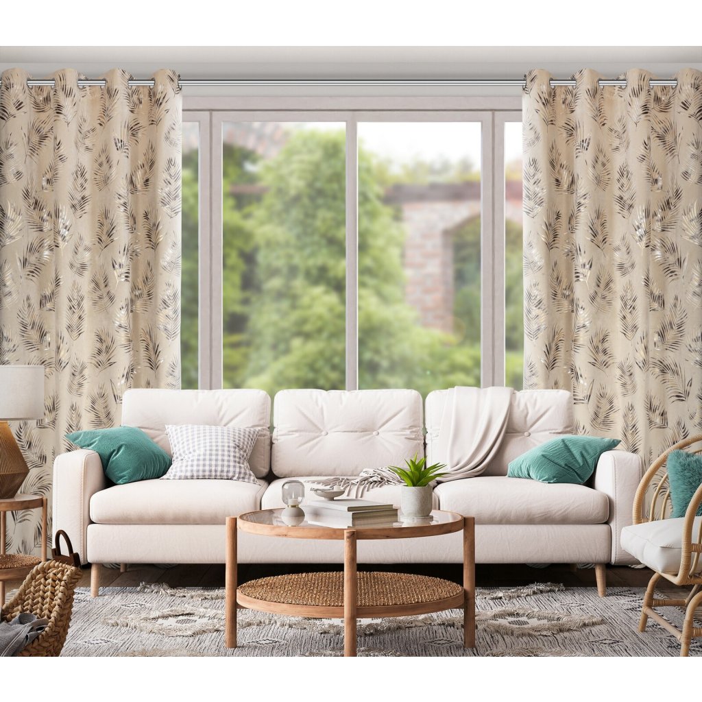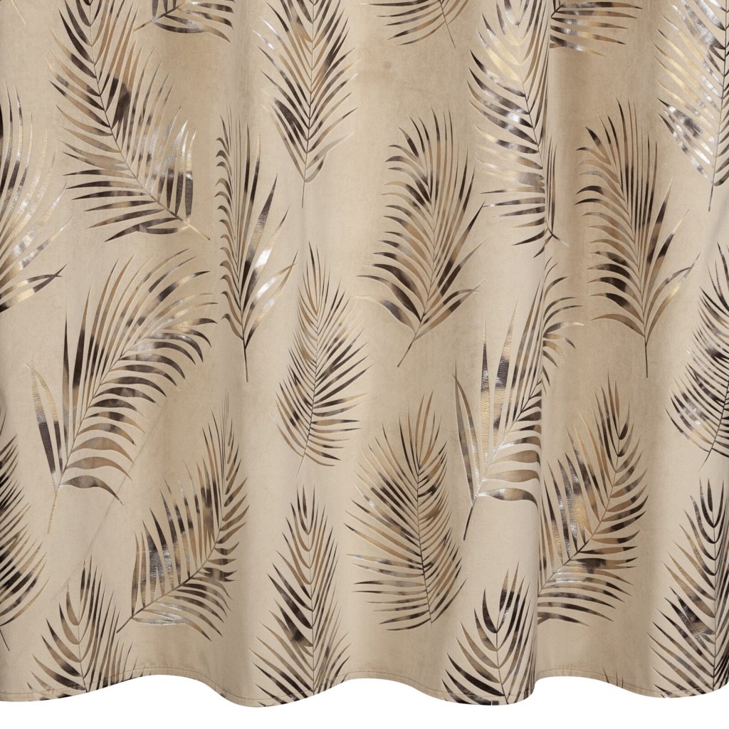 Motiv exotických palmových listů zdobících závěs GLORIA ze sametové látky příjemné na dotek dodá vašemu interiéru slavnostní charakter. třpytivý potisk exotických listů ve stříbrných a zlatých barvách aplikovaný na kontrastní pozadí, čímž vzniká mimořádná kompozice věnovaná moderním interiérům. Hrubší tkanina dokonale izoluje sluneční světlo a zajišťuje příjemnou atmosféru v místnosti, závěs má střední stupeň zatemnění. Šířka: 140 cm, délka: 250 cm, barva: vícebarevná, hmotnost: 200 GSM, složení: 100% polyester.Doplňkové parametry
