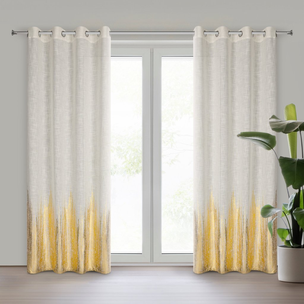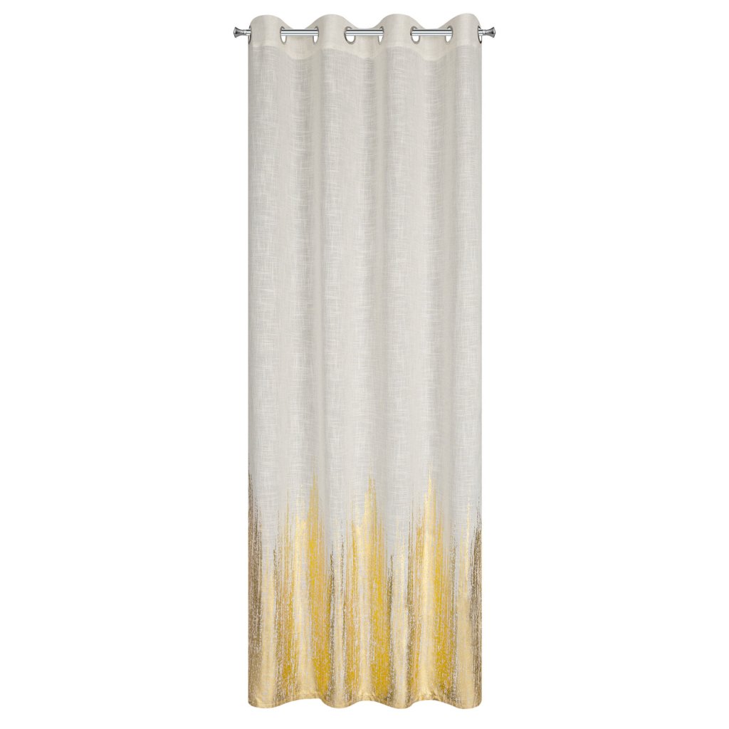 Hotový závěs ze lněné látky v eko stylu s lesklým zlatým potiskem, šířka: 135 cm, délka: 250 cm, hmotnost: 200 GSM, barva: přírodní a zlatá, složení: 95% polyester, 5% len.Doplňkové parametry