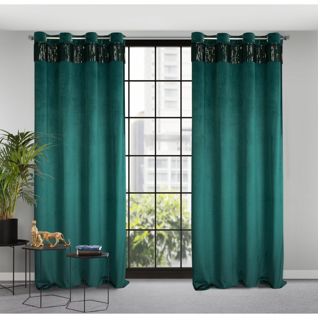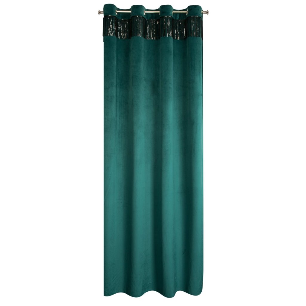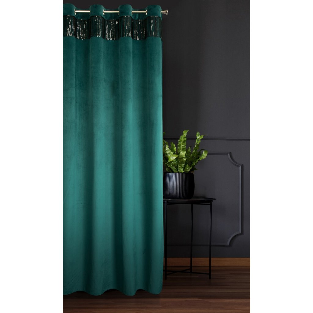 Sametový jednobarevný závěs s ozdobnou páskou s flitry šířka: 140 cm, délka: 250 cm, barva: tmavá zelená, hmotnost: 290 GSM, složení: 100 % polyesterDoplňkové parametry