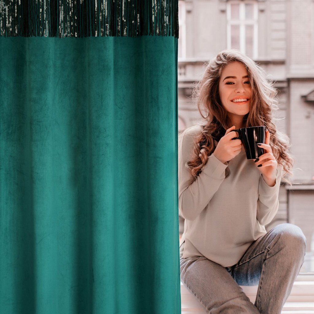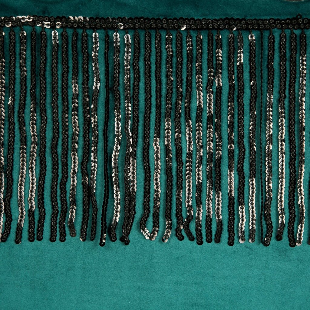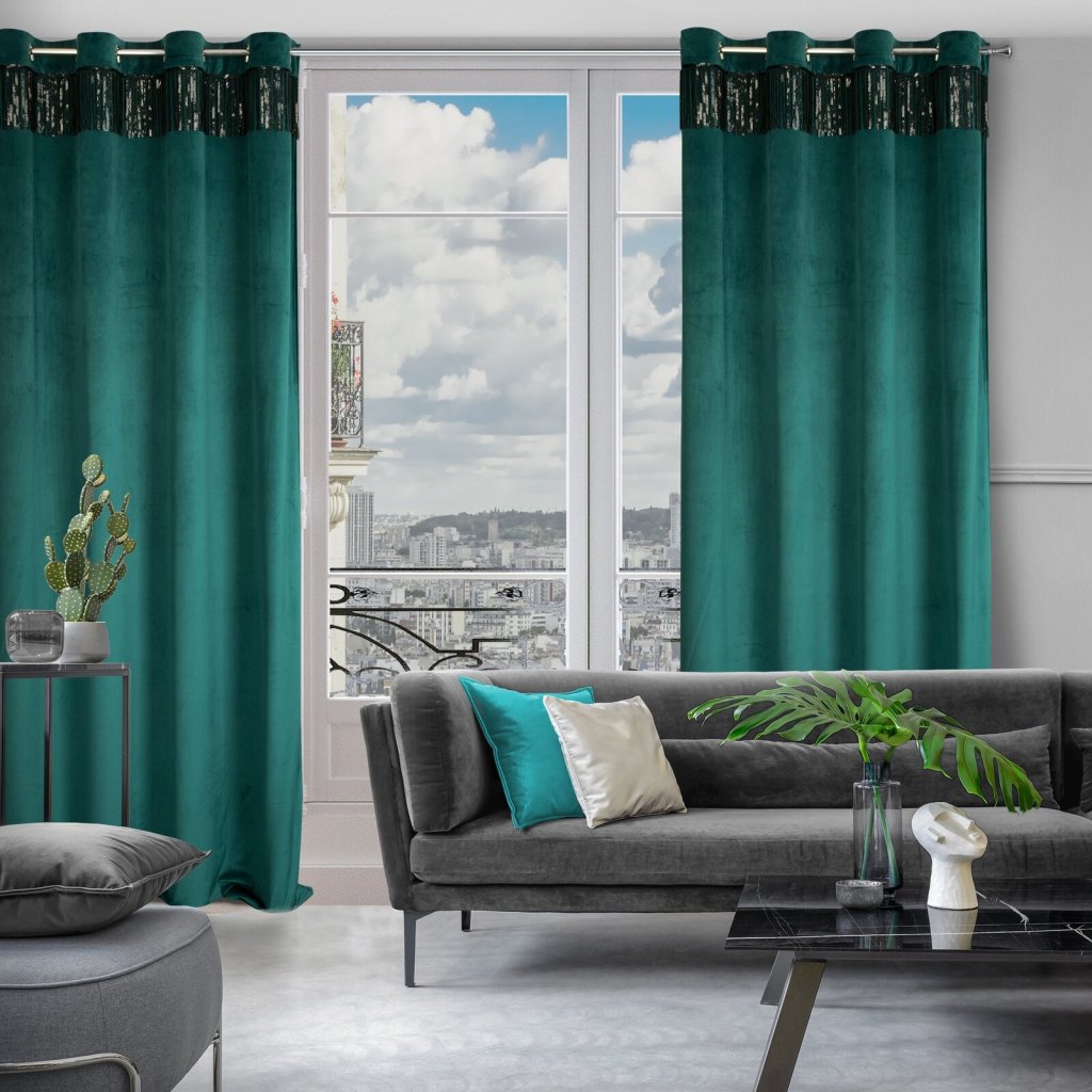 Sametový jednobarevný závěs s ozdobnou páskou s flitry šířka: 140 cm, délka: 250 cm, barva: tmavá zelená, hmotnost: 290 GSM, složení: 100 % polyesterDoplňkové parametry