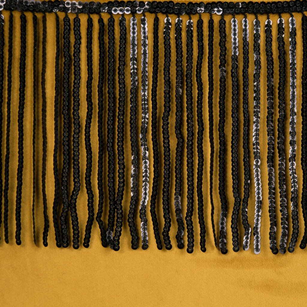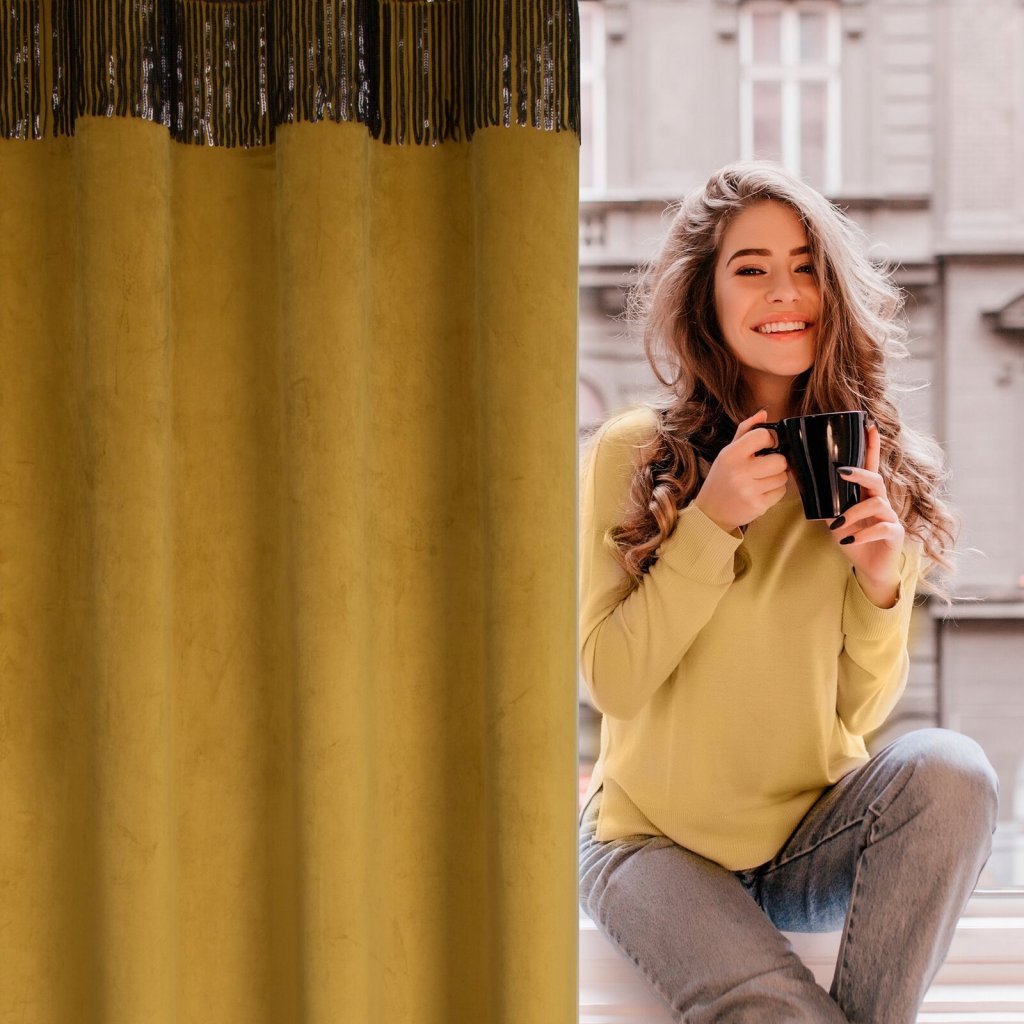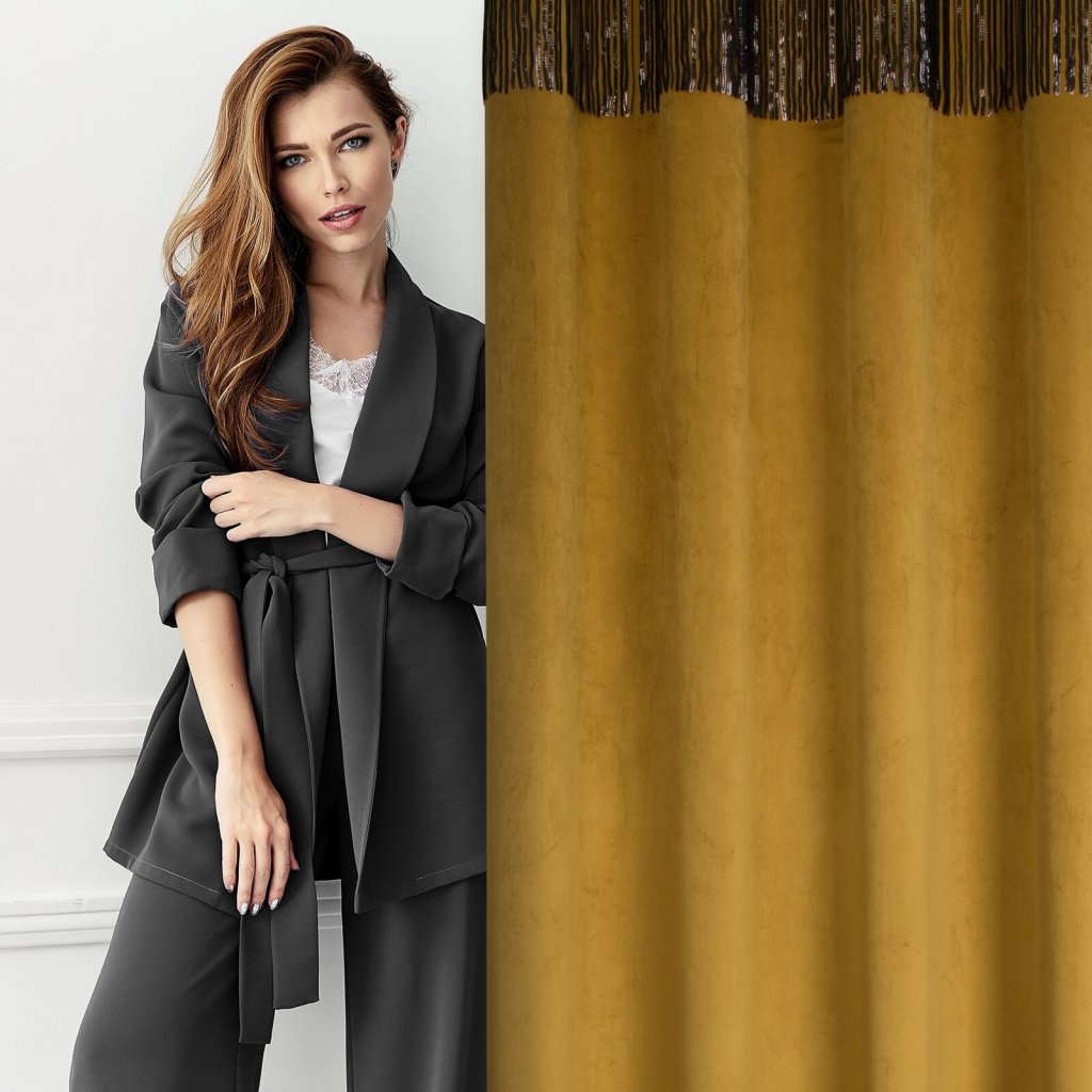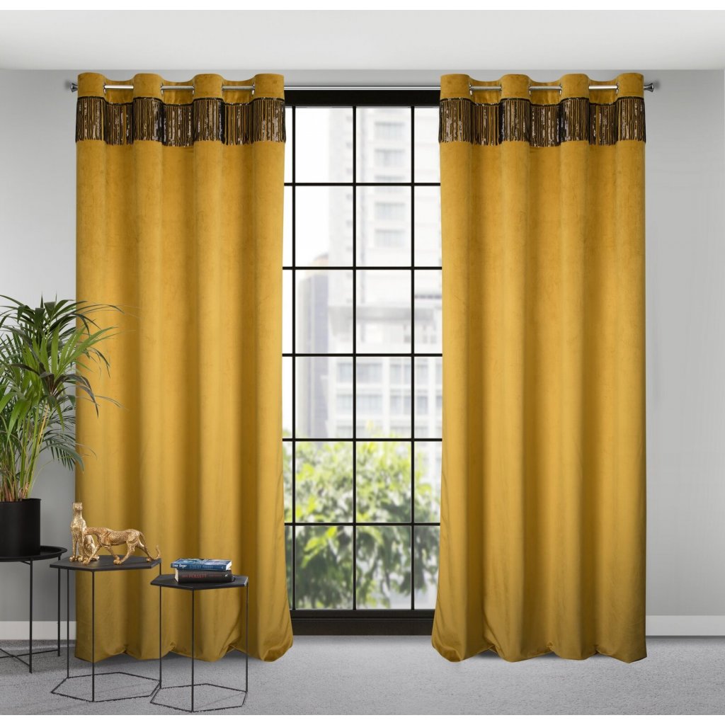 Sametový jednobarevný závěs s ozdobnou páskou s flitry šířka: 140 cm, délka: 250 cm, barva: zlatá, hmotnost: 290 GSM, složení: 100 % polyesterDoplňkové parametry
