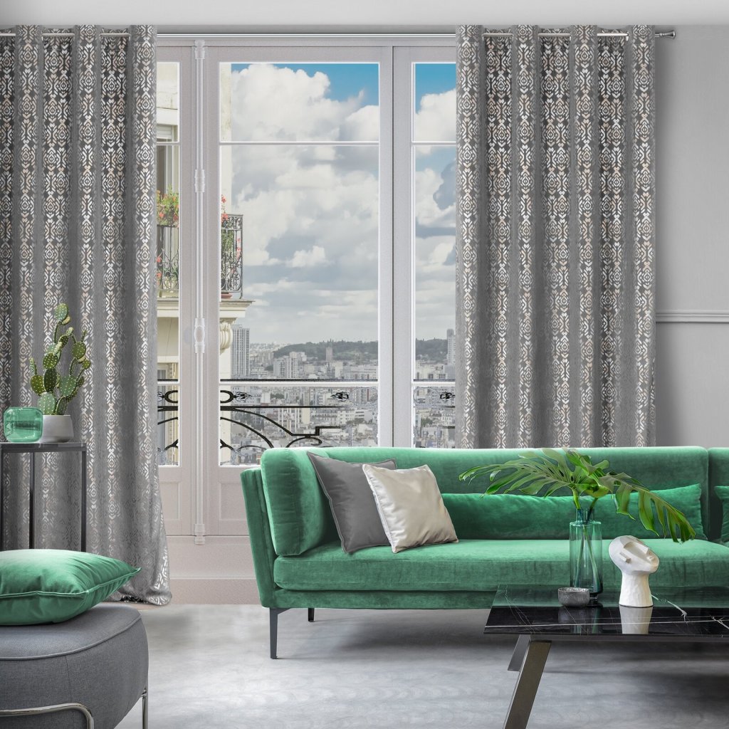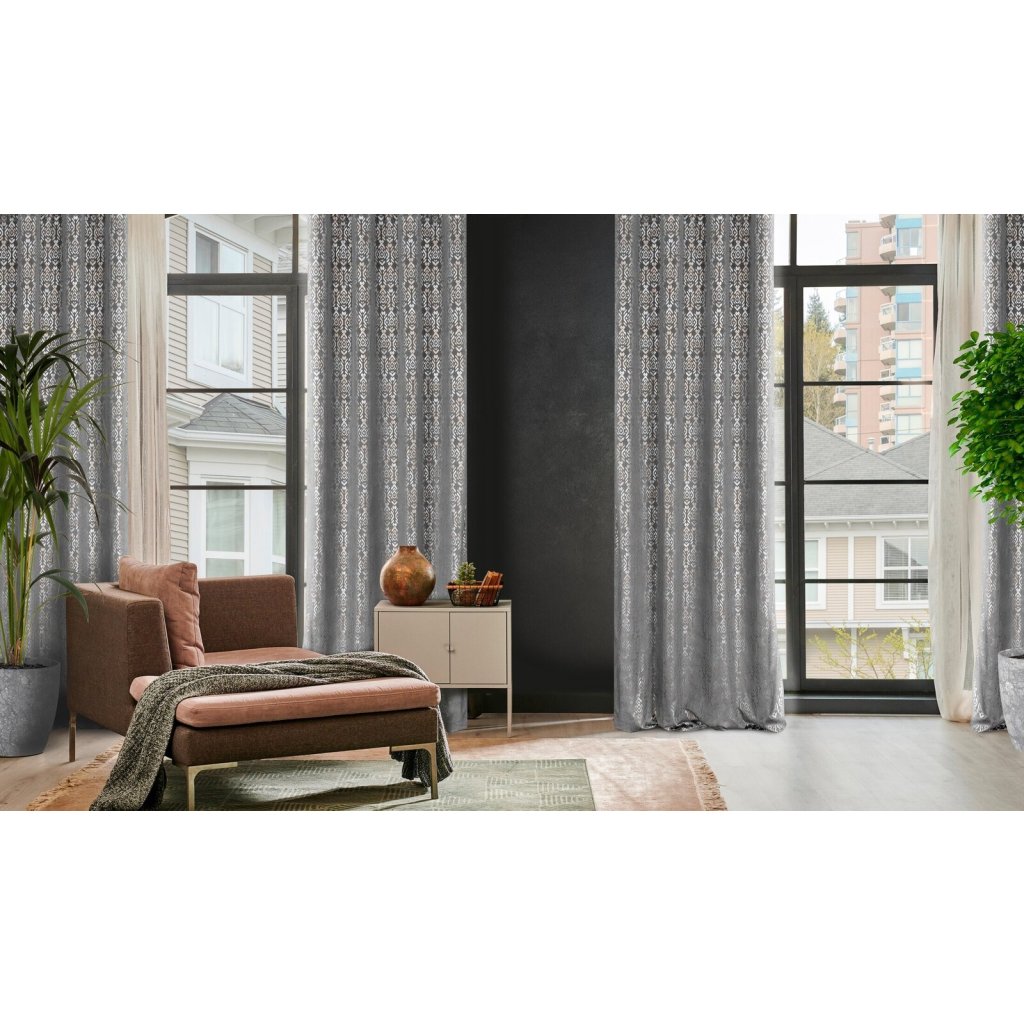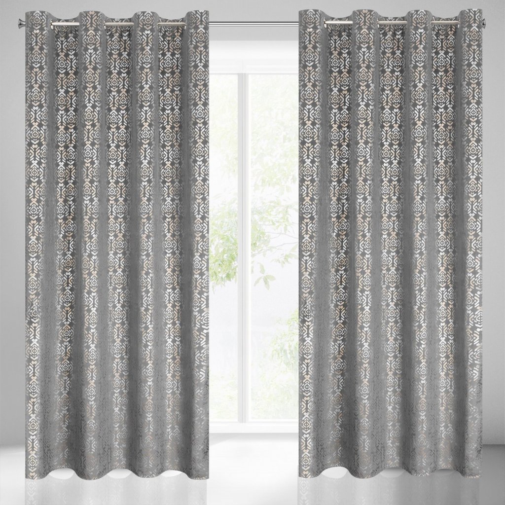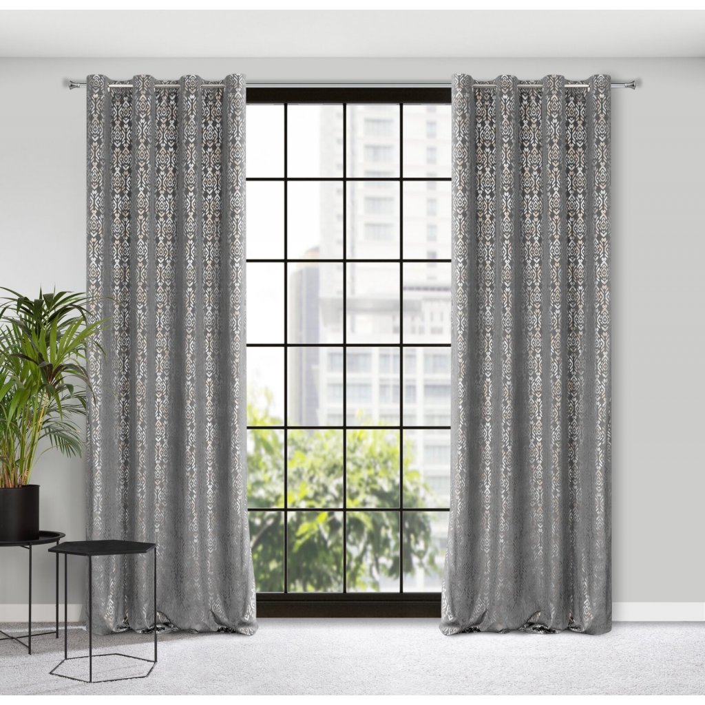 Sametový závěs se zlatým a stříbrným potiskem šířka: 140 cm, délka: 250 cm, barva: šedá, hmotnost: 200 GSM, složení: 100 % polyesterDoplňkové parametry