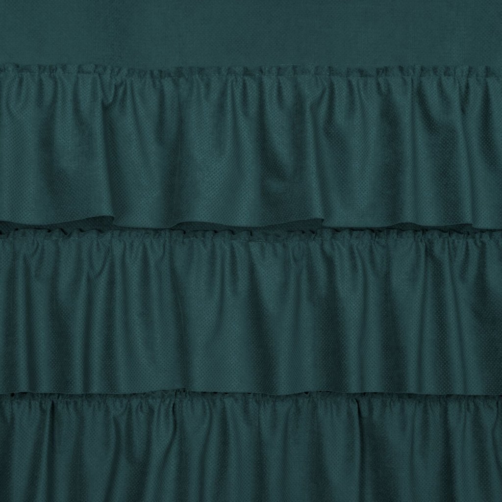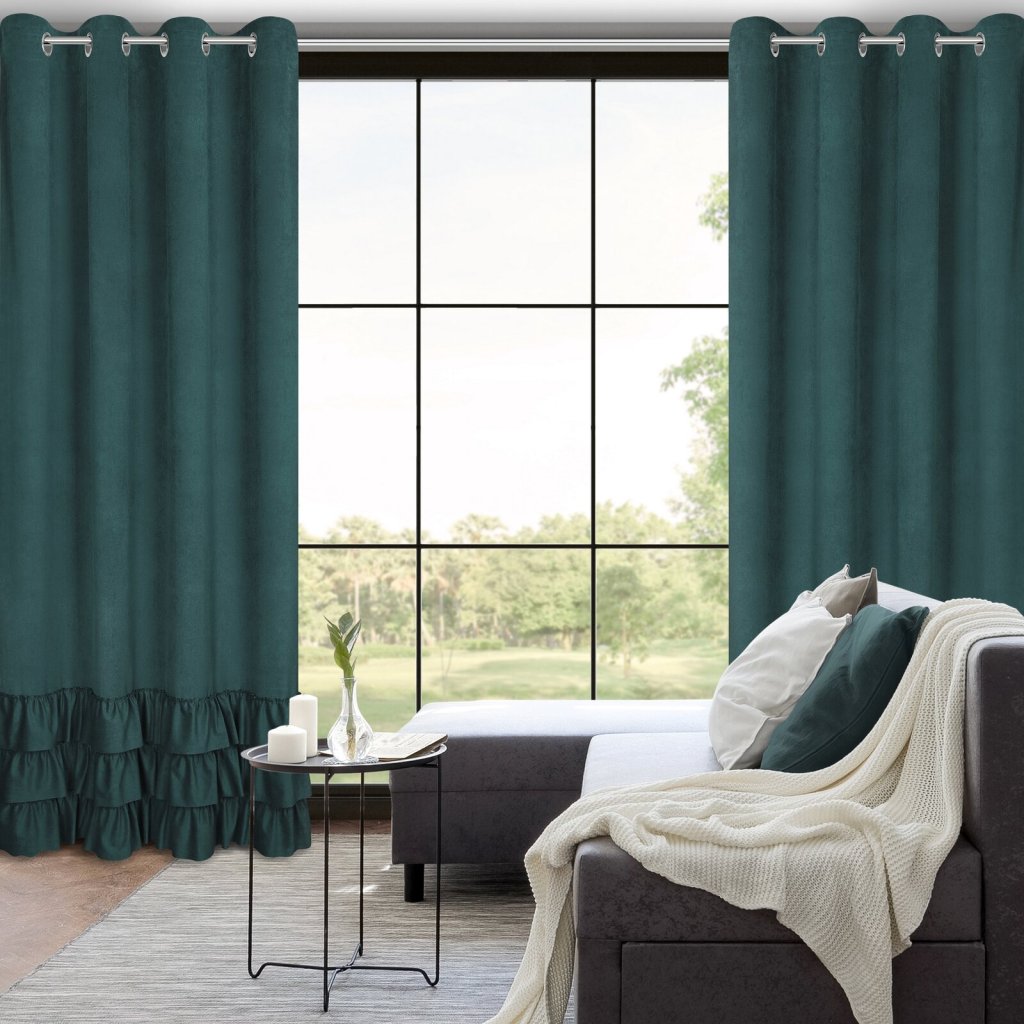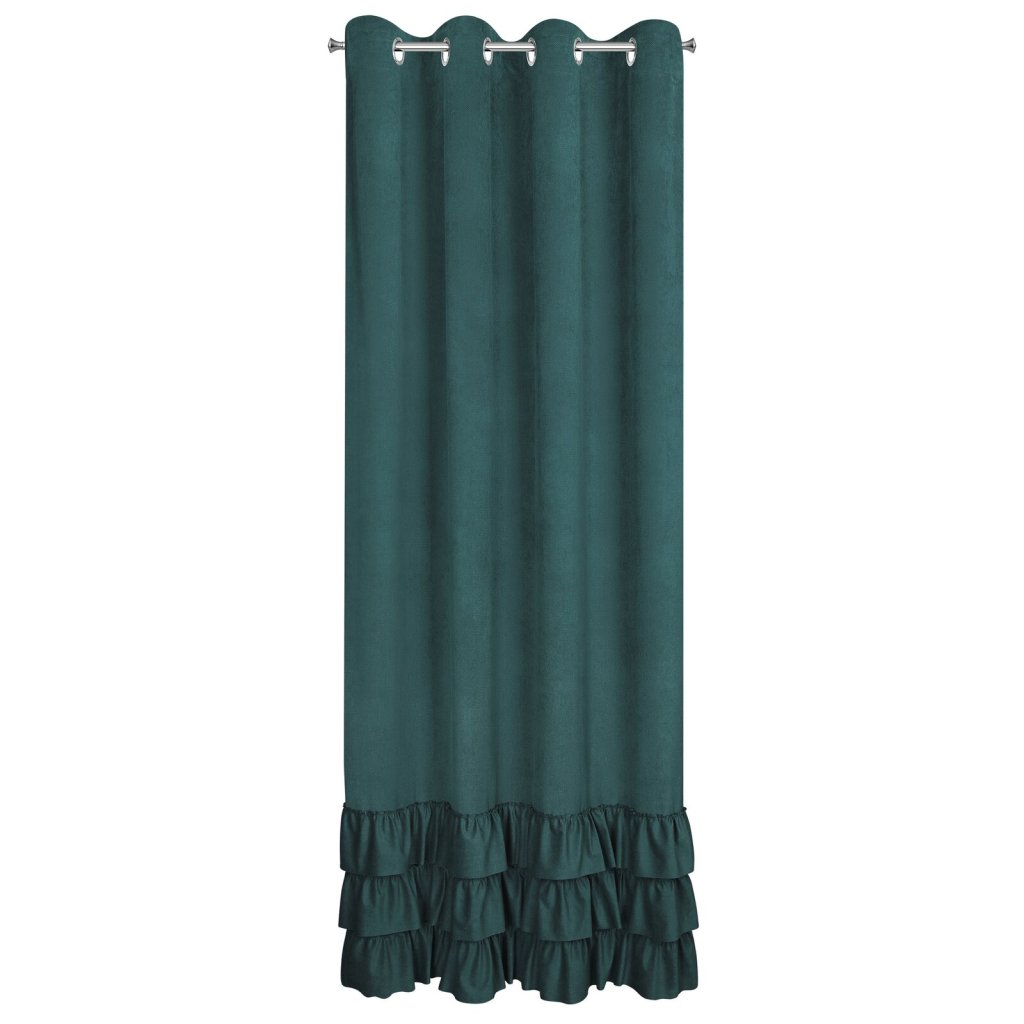 Dodejte svému interiéru nádech elegance se závěsem vyrobeným z měkké sametové látky. Spodní část látky je ozdobena třemi výraznými volánky, které celému závěsu dodávají romantický nádech. Šířka: 140 cm, délka: 250 cm, hmotnost: 200 GSM, barva: tmavě zelená, složení: 100% polyester.Doplňkové parametry