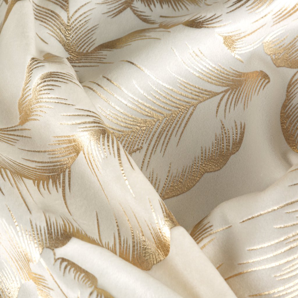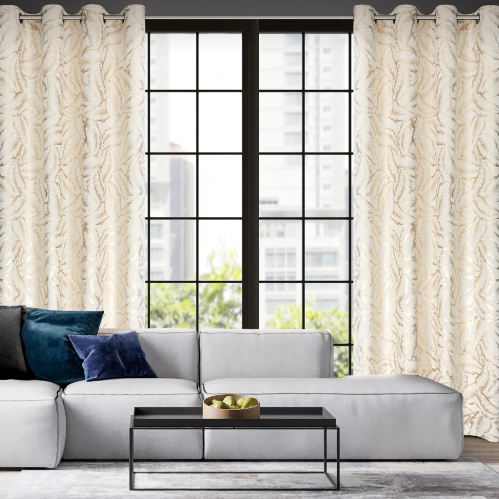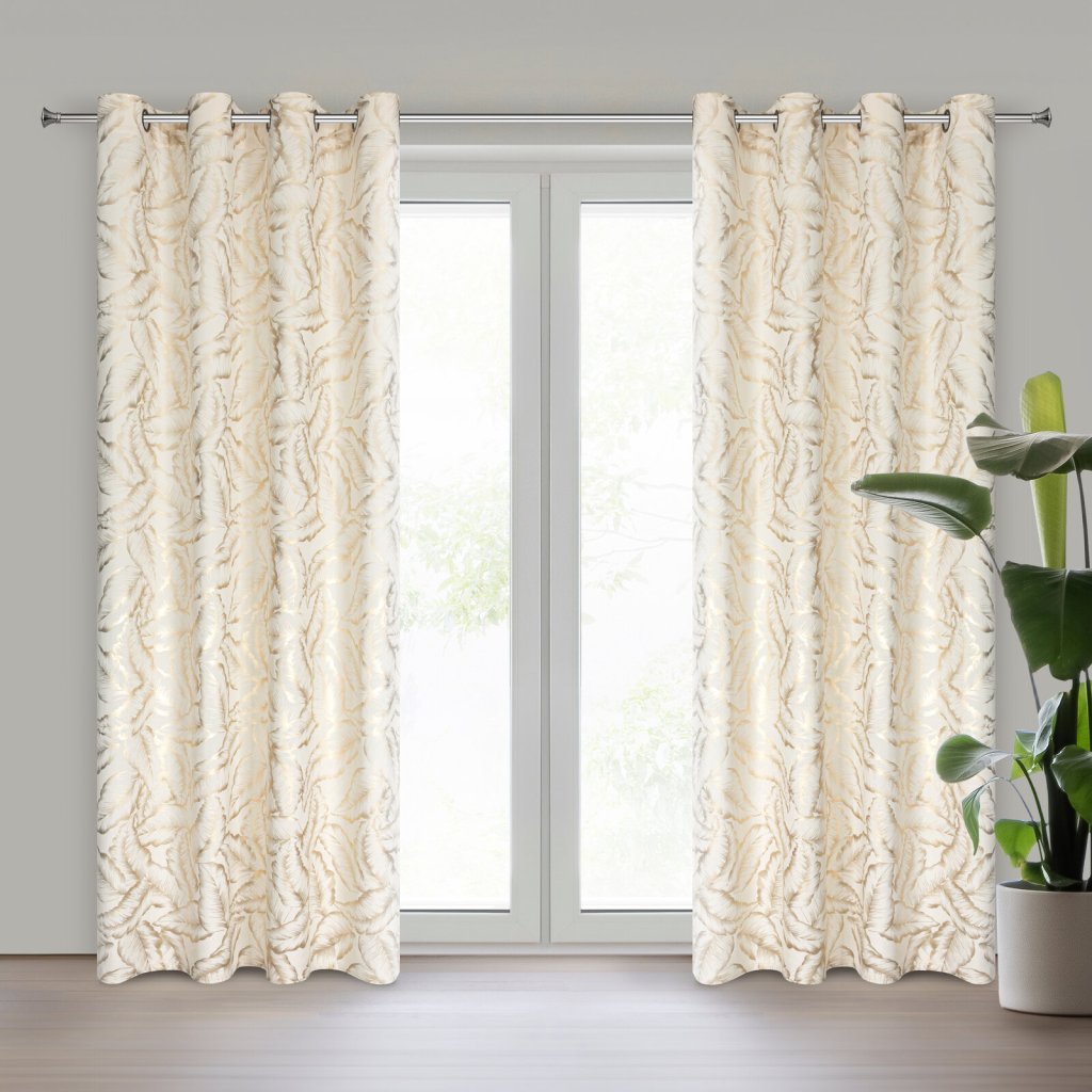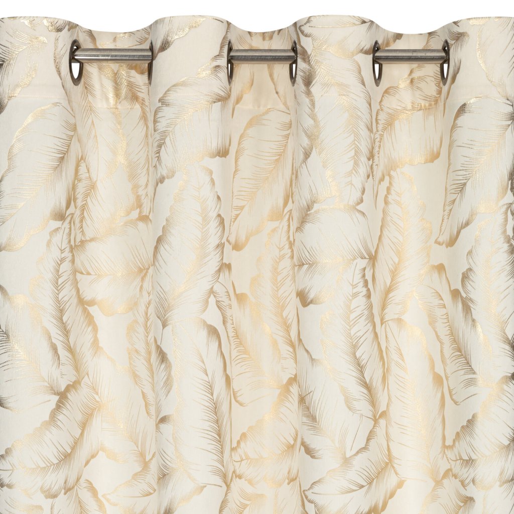 Kolekce závěsů Milena s moderním lesklým potiskem listů na jemné sametové látce. Hladká látka v jednotné barvě odráží světlo, což způsobuje mírný lesk v závislosti na úhlu dopadu světla. Šířka: 140 cm, délka: 250 cm, barva: krémová a šampaňská, hmotnost: 200 GSM, složení: 100% polyester.Doplňkové parametry