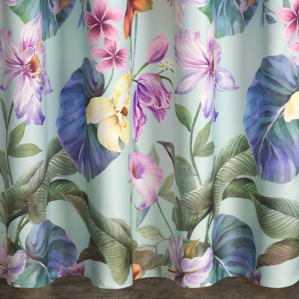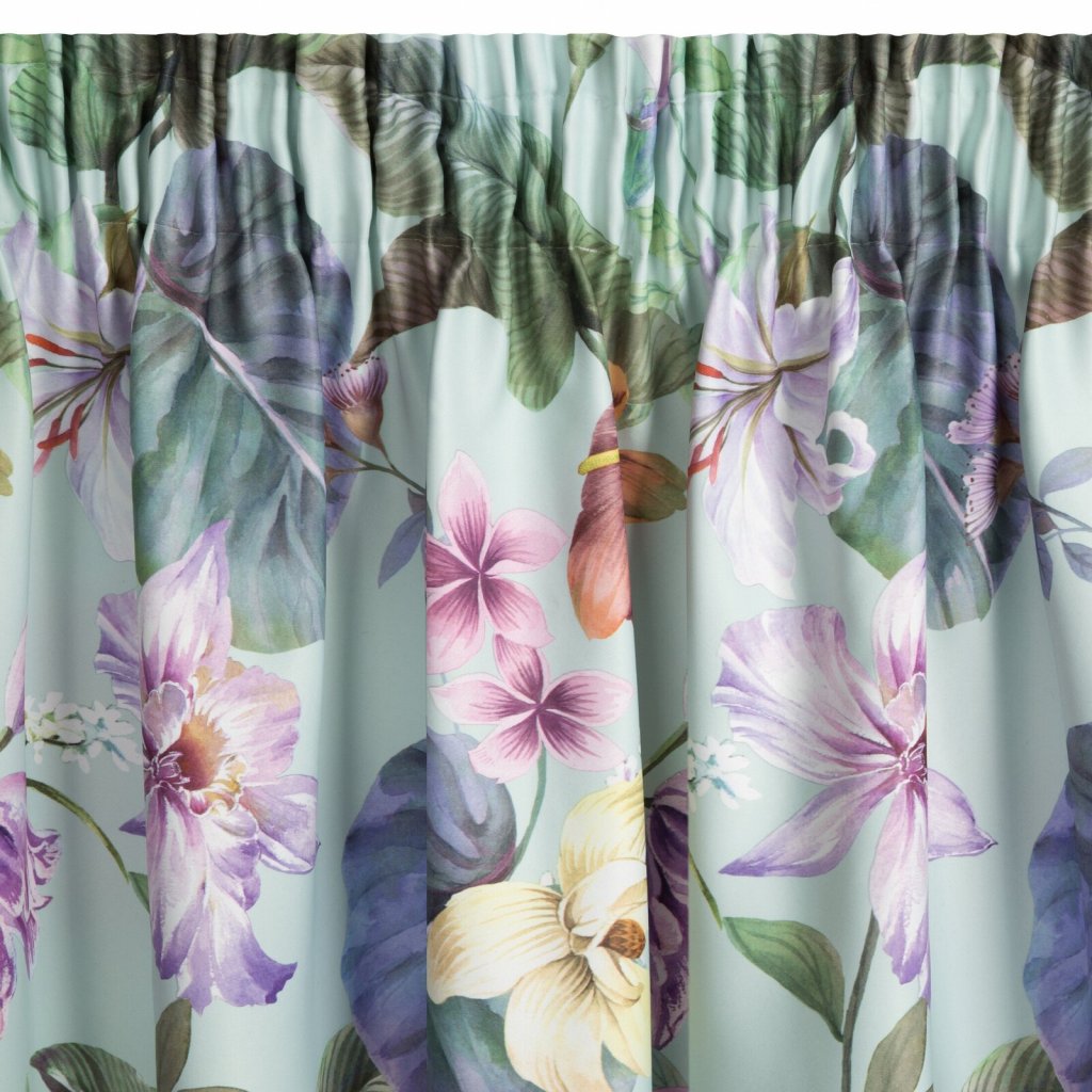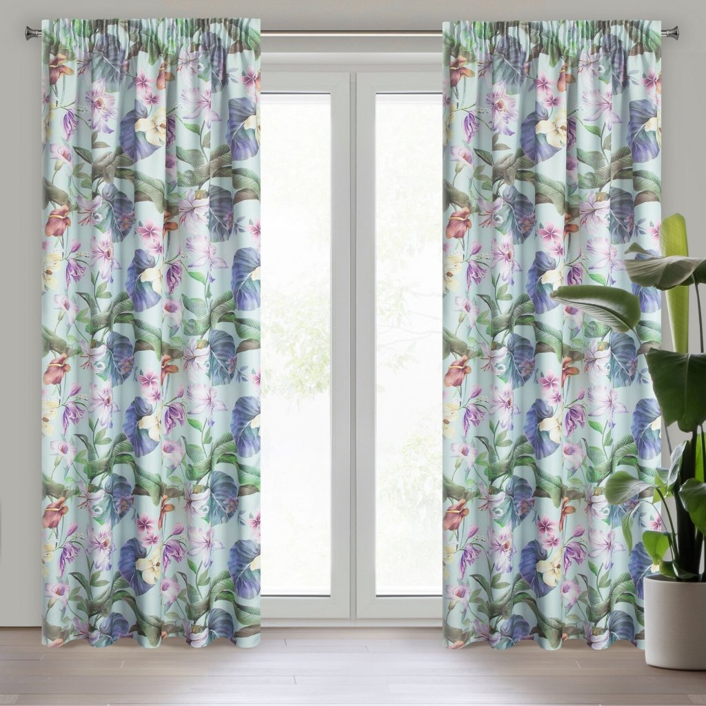 Závěs z jemné tkaniny zdobený potiskem s motivem exotických listů a květin. Vysoká úroveň stínění. Šířka: 140 cm, délka: 270 cm, barva: vícebarevná, hmotnost: 210 GSM, složení: 100 % polyesterDoplňkové parametry