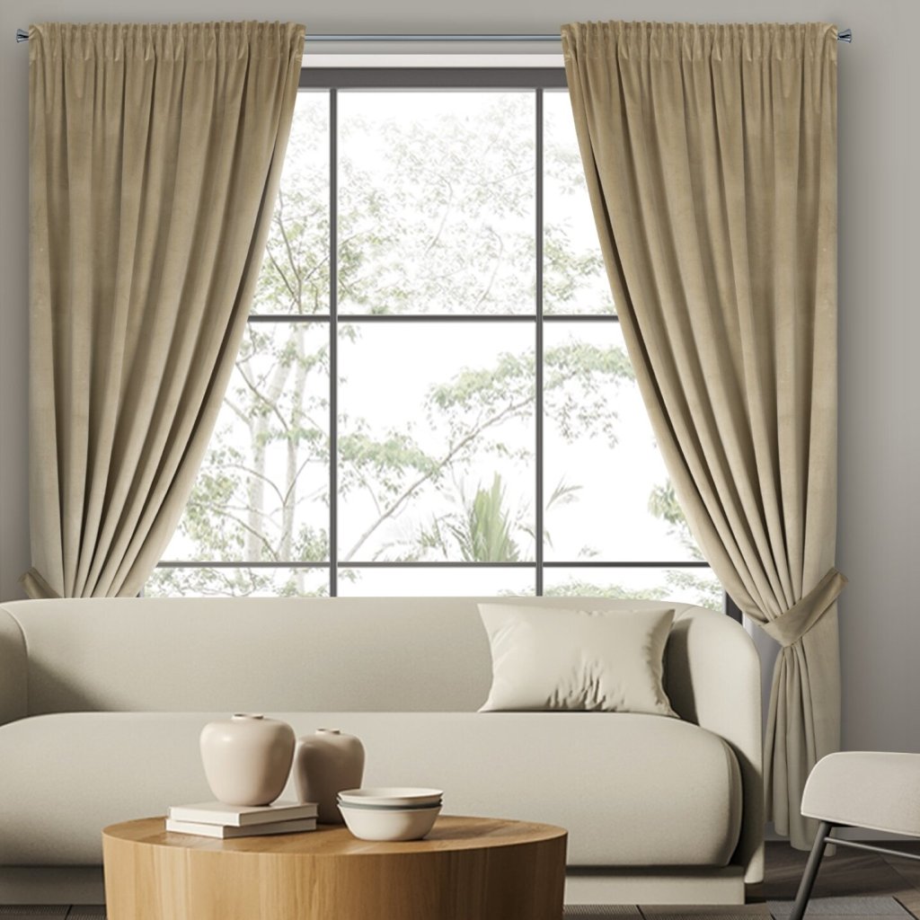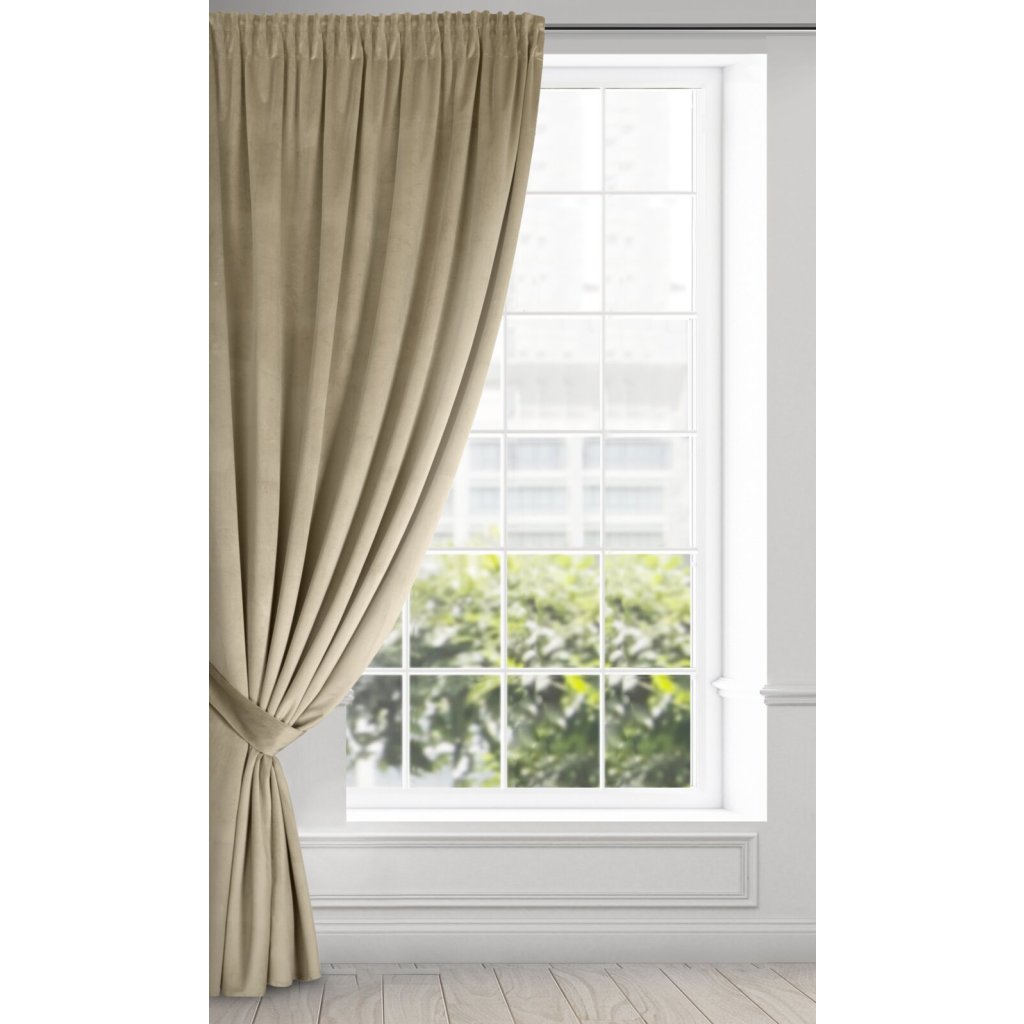 Jednobarevný sametový závěs se šňůrkou, šířka: 140 cm, délka: 300 cm, barva: světle béžová, hmotnost: 200 GSM, složení: 100% polyester.Doplňkové parametry