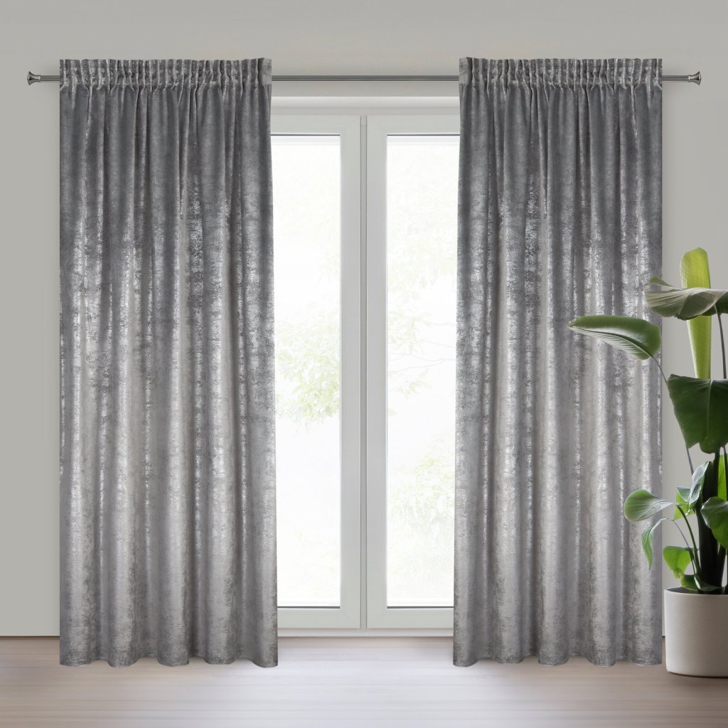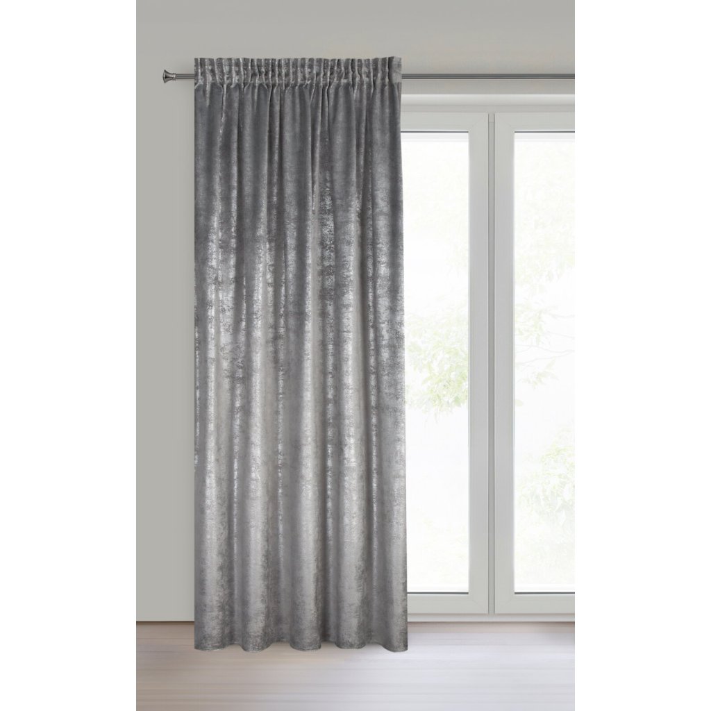 Elegantní sametový závěs AVENA ve stříbrné barvě s jemným lesklým vzorem dodá interiéru moderní nádech. Lesklý potisk ve stříbrné barvě krásně odráží světlo, čímž vytváří sofistikovaný efekt a oživuje prostor. Šířka: 135 cm, délka: 270 cm, barva: stříbrná, hmotnost: 200 GSM, složení: 100% polyester.Doplňkové parametry