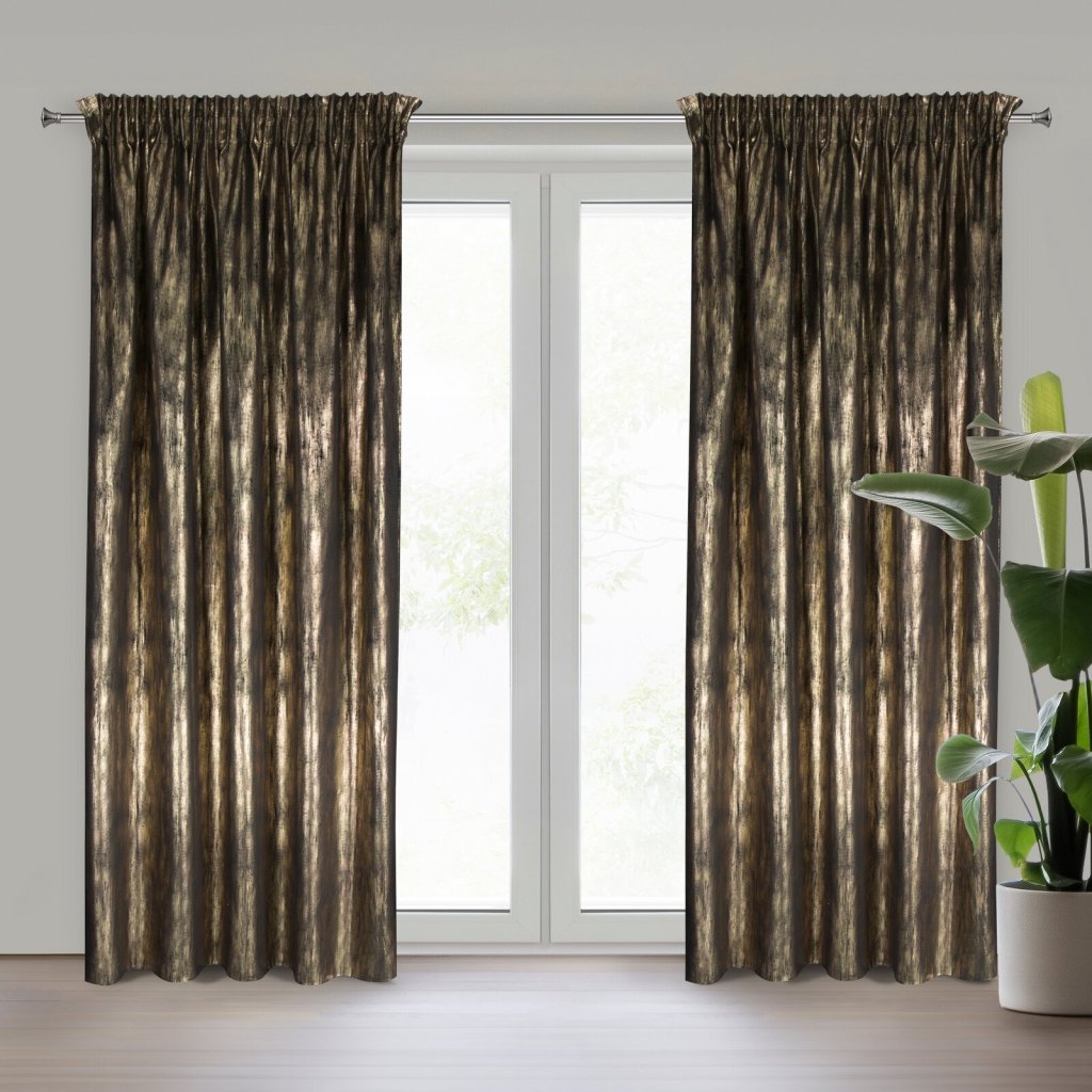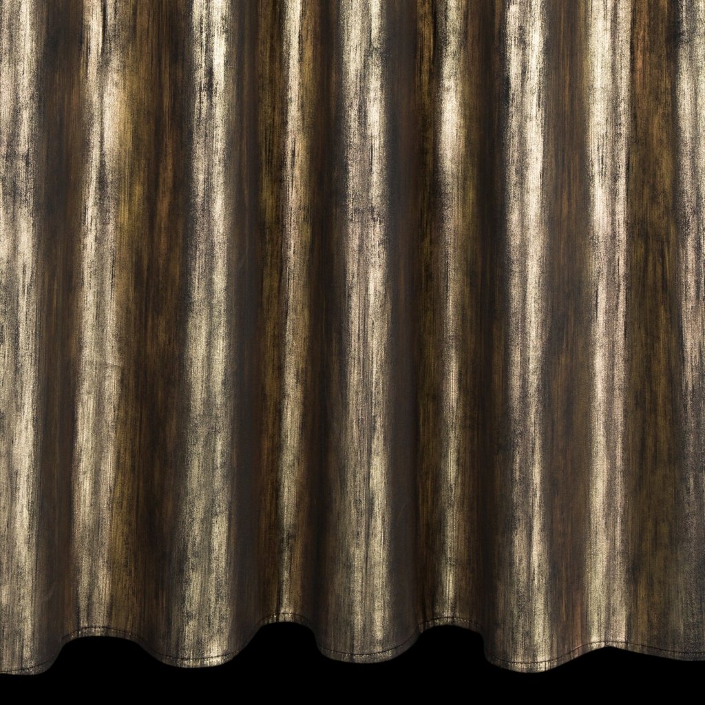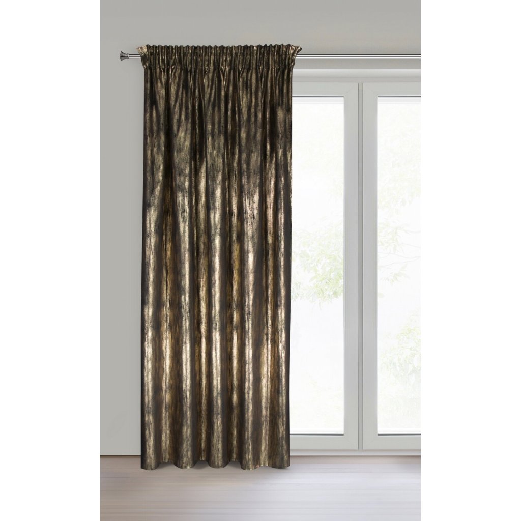 Závěs EMILA zaujme moderním vzorem po celém závěsu na jemné sametové látce, navíc zvýrazněný třpytivým, zlatavým potiskem. Šířka: 140 cm, délka: 270 cm, barva: černá a zlatá, hmotnost: 200 GSM, složení: 100% polyester.Doplňkové parametry