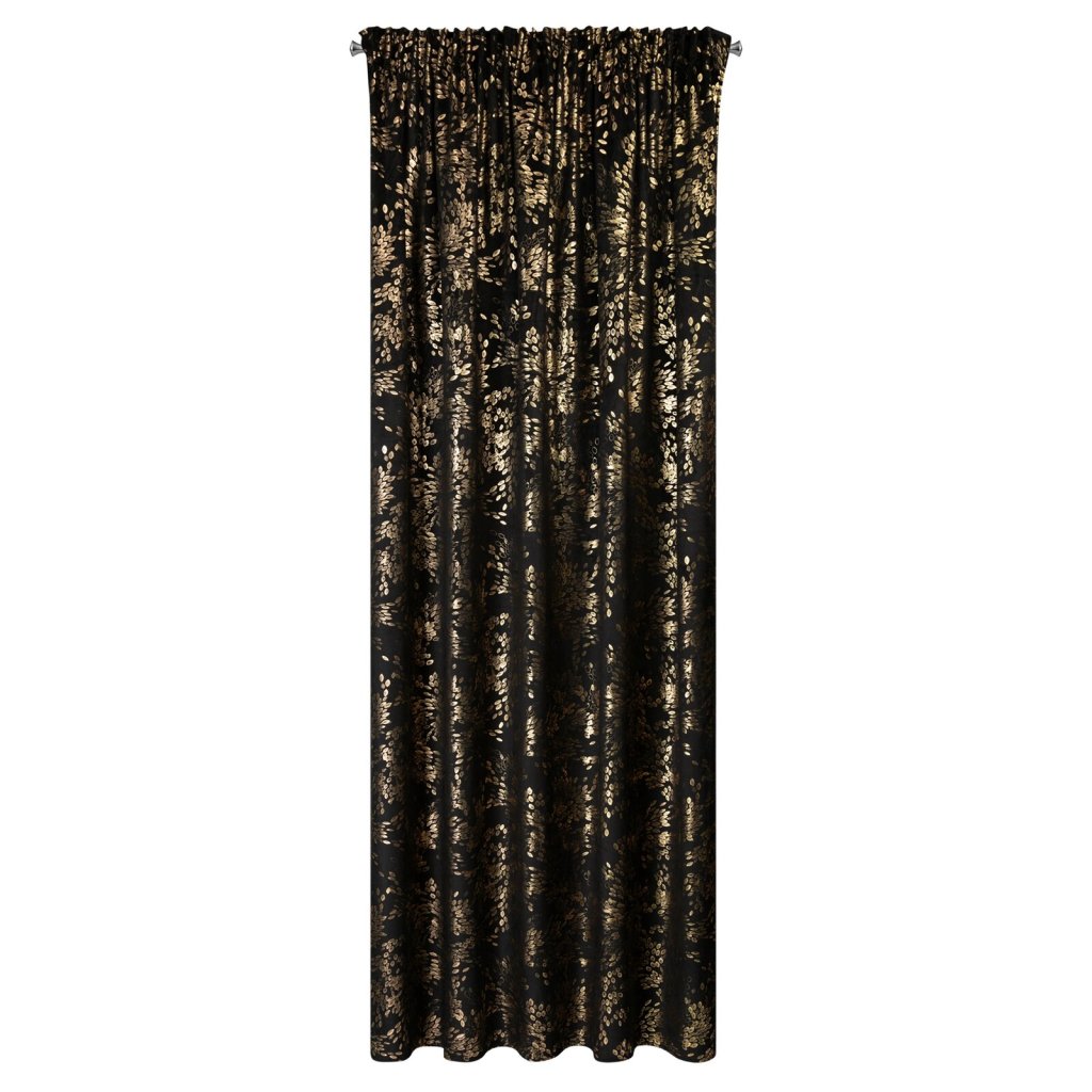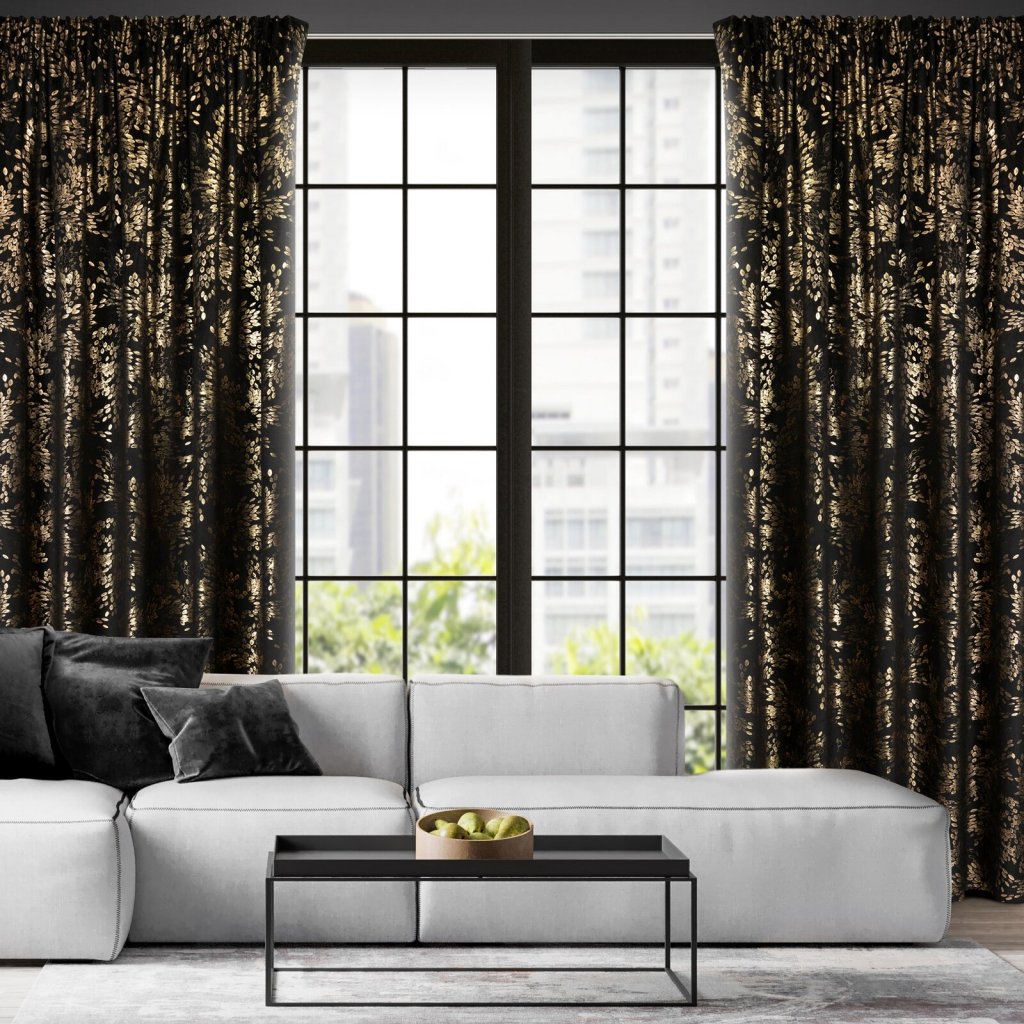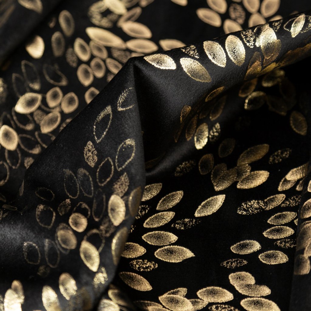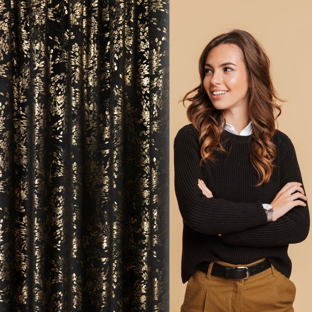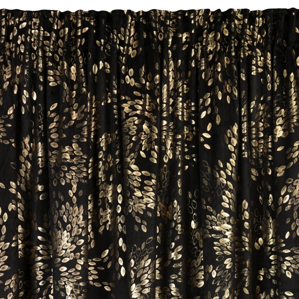 Hotový sametový závěs FELIS je vyroben z kvalitního sametu, je měkký a má jemný lesk, který krásně odráží světlo a vytváří jemný, elegantní efekt. Lesklý potisk drobných lístků na povrchu látky v šampaňské barvě dodává sofistikovanost a přirozenou lehkost a do interiéru vnáší jemný rostlinný motiv. Šířka: 140 cm, délka: 270 cm, hmotnost: 200 GSM, barva: černá a šampaňská, složení: 100% polyester.Doplňkové parametry