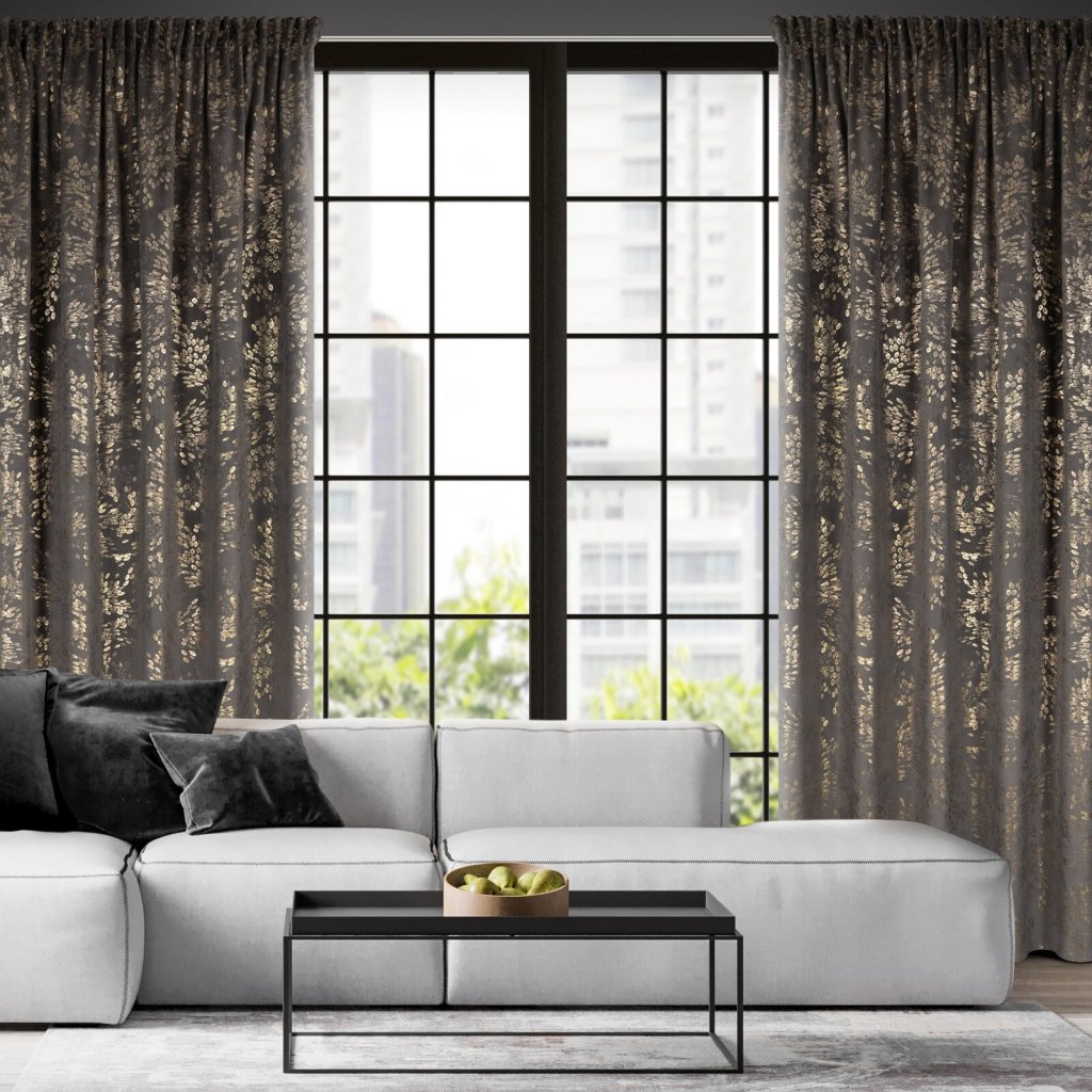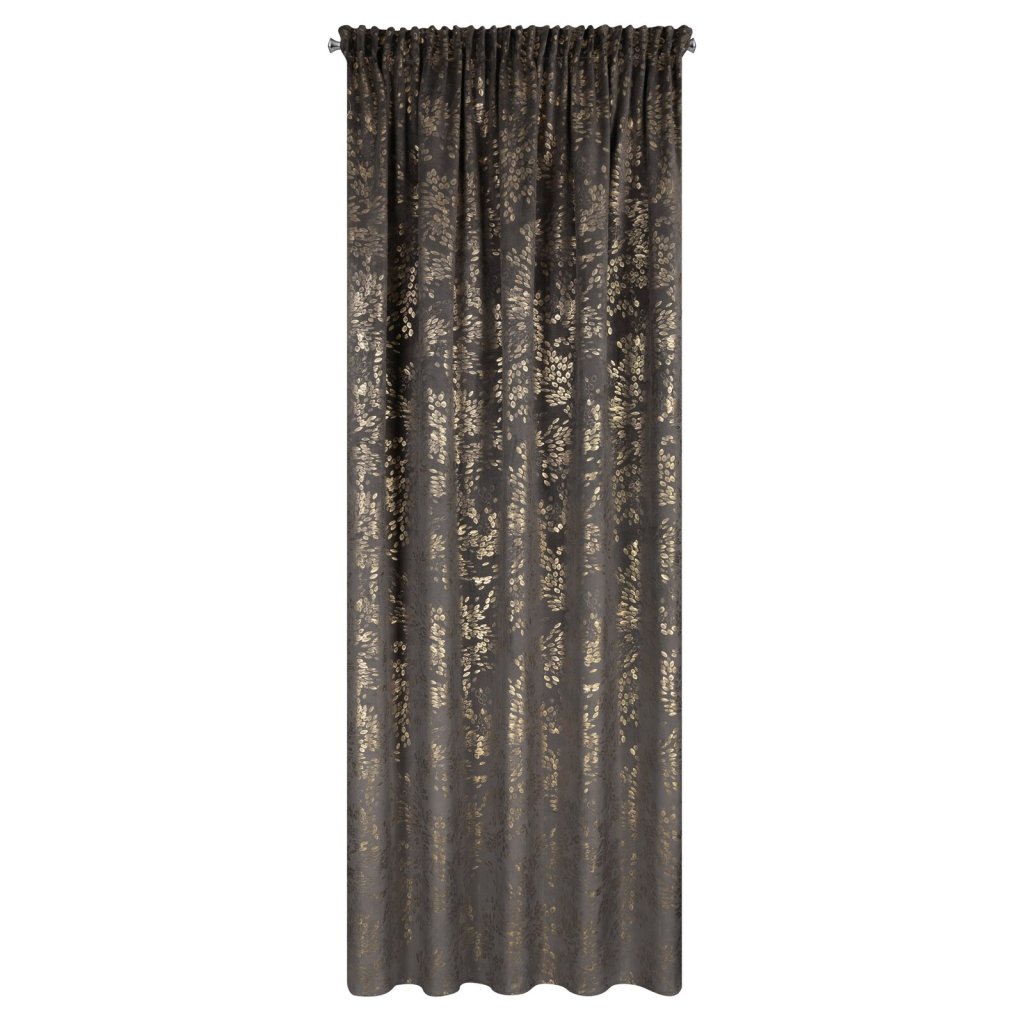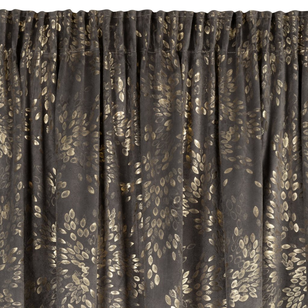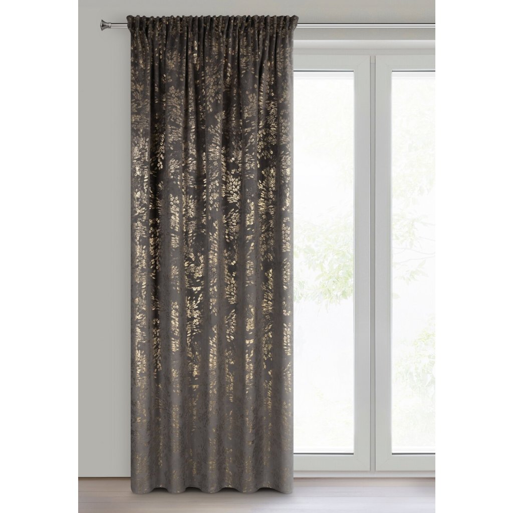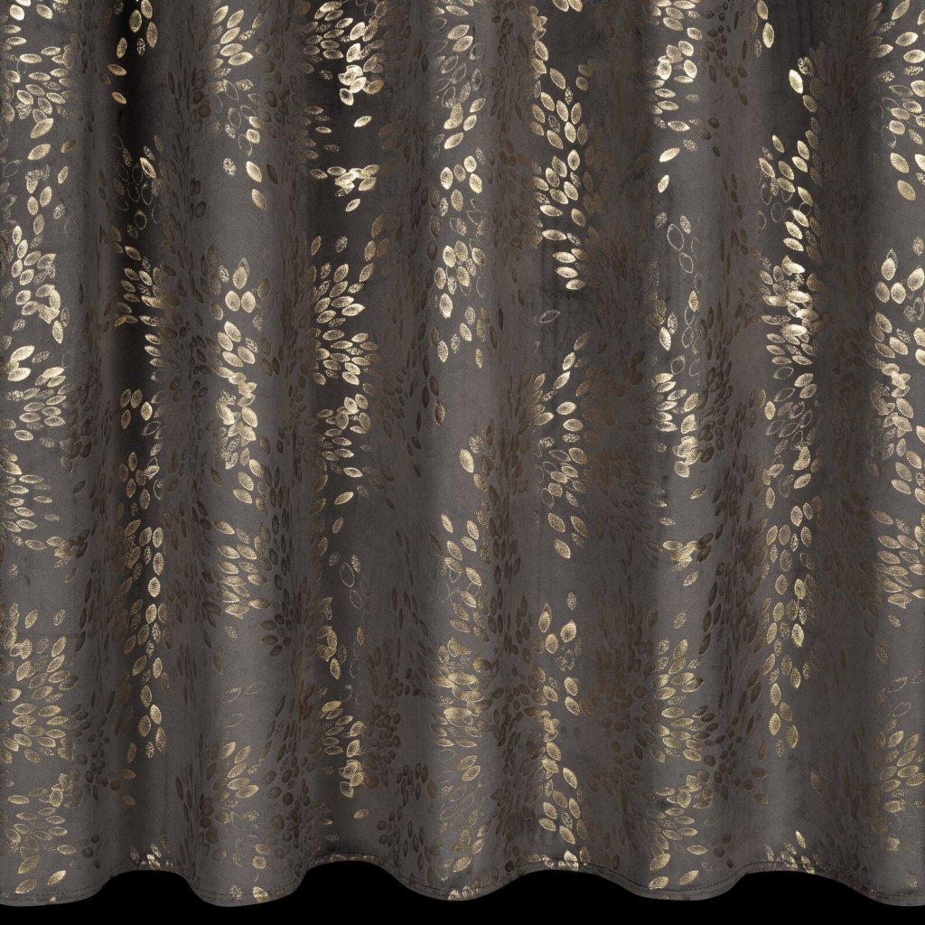 Hotový sametový závěs FELIS je vyroben z kvalitního sametu, je měkký a má jemný lesk, který krásně odráží světlo a vytváří jemný, elegantní efekt. Lesklý potisk drobných lístků na povrchu látky v šampaňské barvě dodává sofistikovanost a přirozenou lehkost a do interiéru vnáší jemný rostlinný motiv. Šířka: 140 cm, délka: 270 cm, hmotnost: 200 GSM, barva: grafitová a šampaňská, složení: 100% polyester.Doplňkové parametry