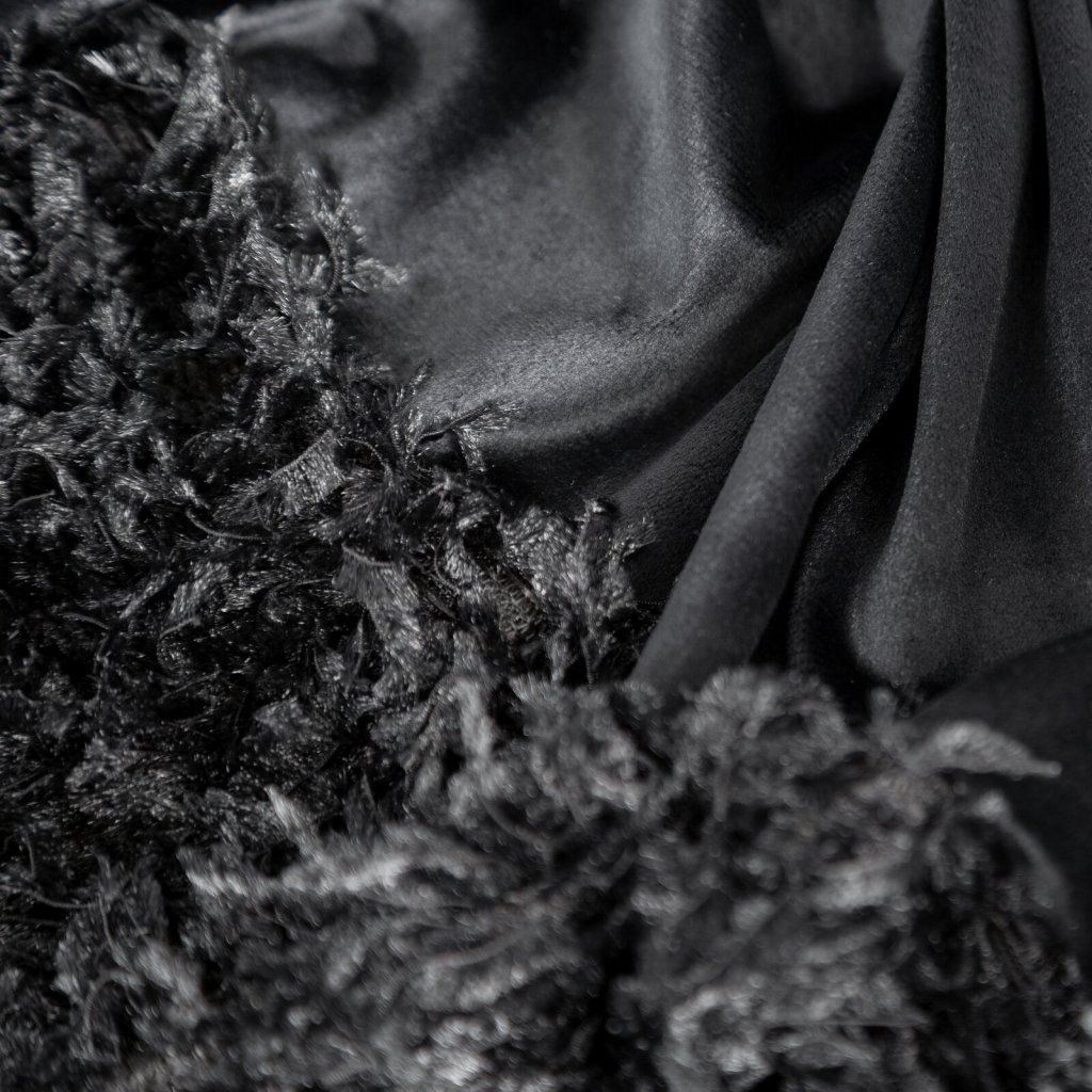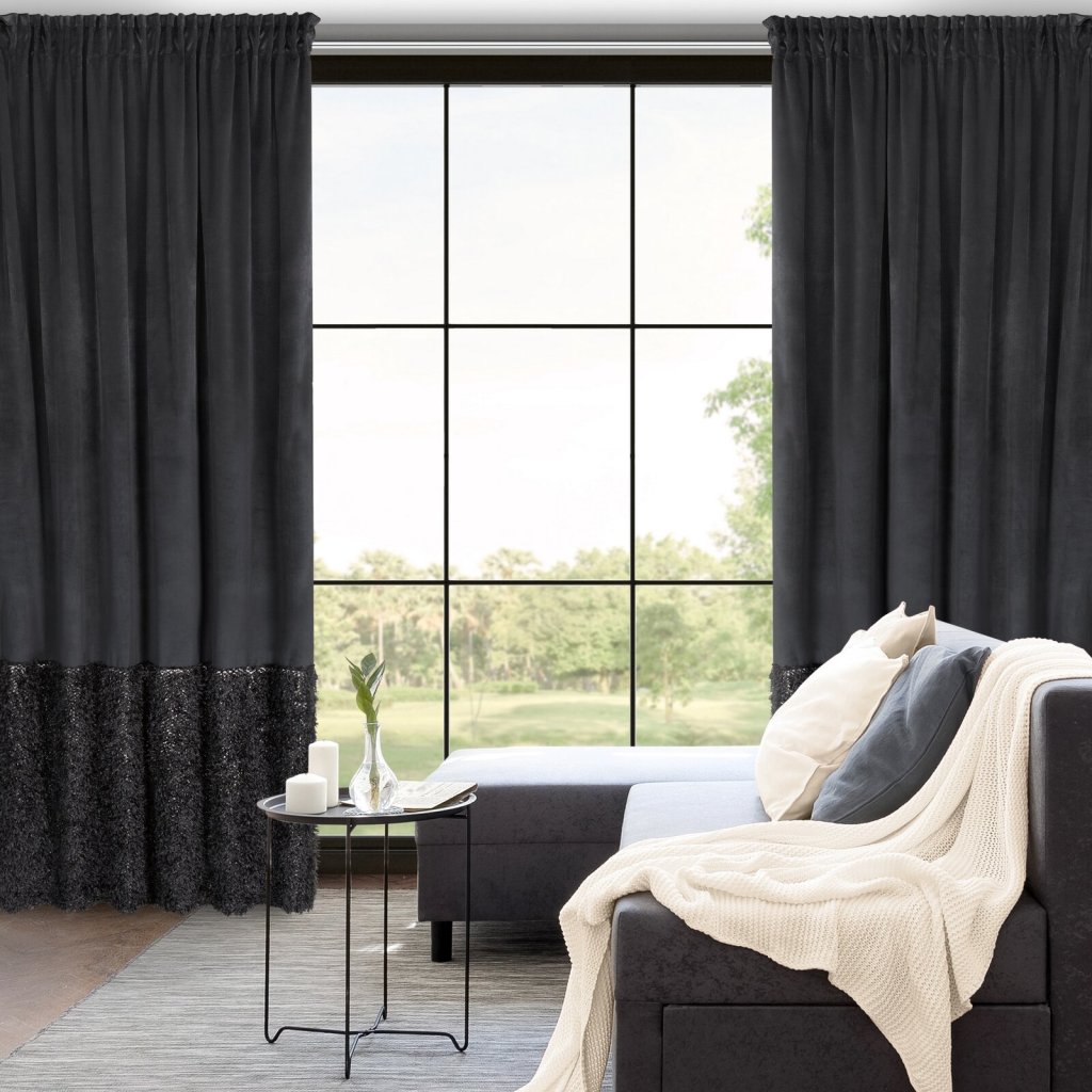 Hotový sametový závěs s chlupatou aplikací, šířka: 140 cm, délka: 270 cm, barva: černá, hmotnost: 230 GSM, složení: 100% polyester.Doplňkové parametry