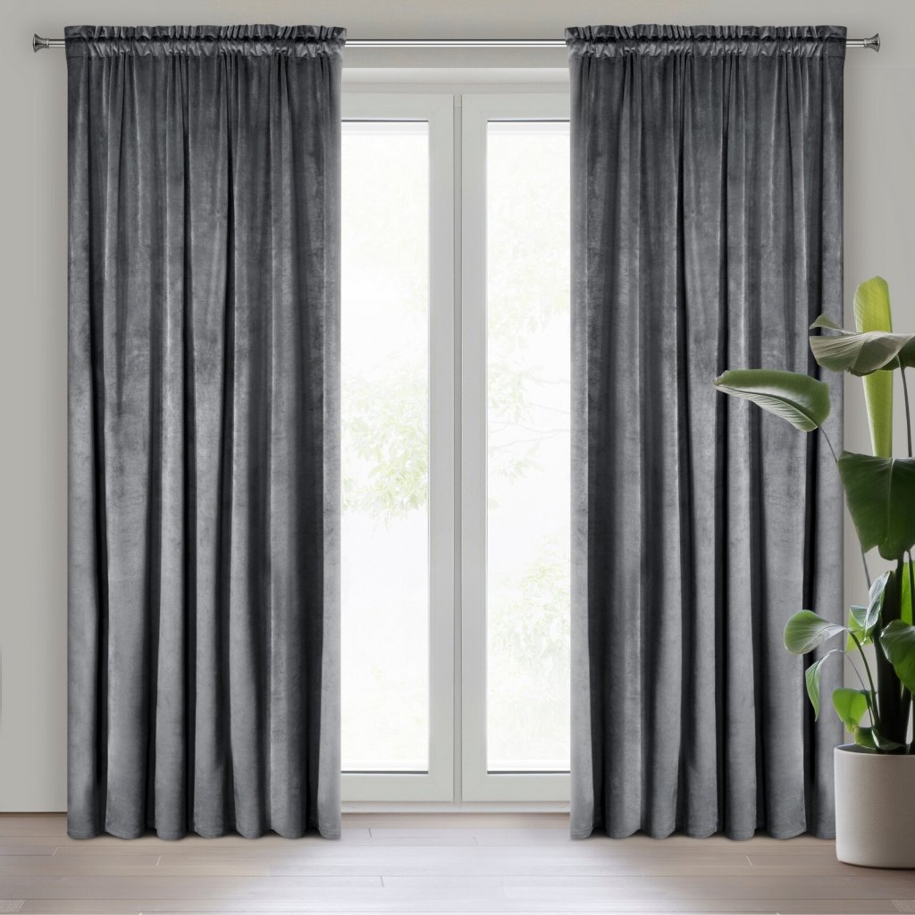 Jemný sametový závěs s matným povrchem. Hrubá tkanina se středními vlastnostmi zatemnění dodává interiéru elegantní charakter, šířka: 140 cm, délka: 270 cm, barva: šedá, hmotnost: 200 GSM, složení: 100% polyester.Doplňkové parametry
