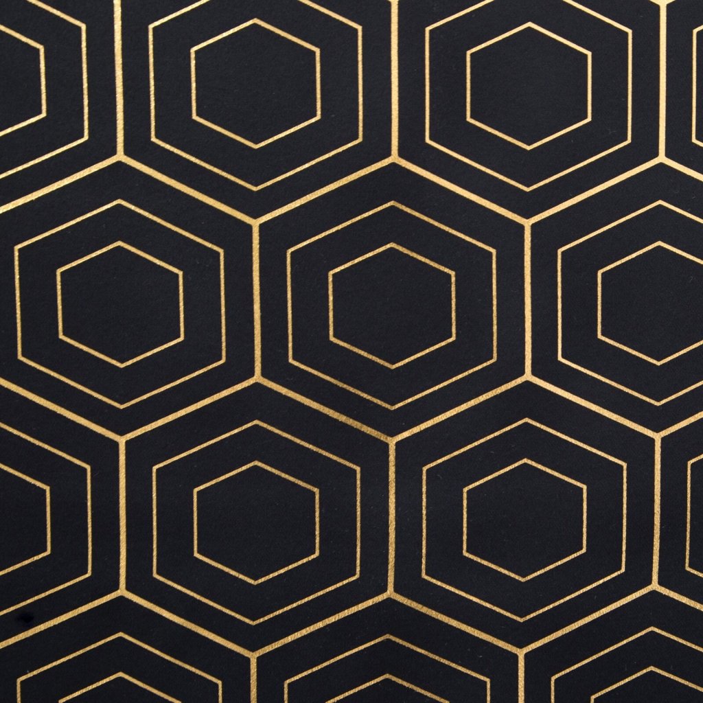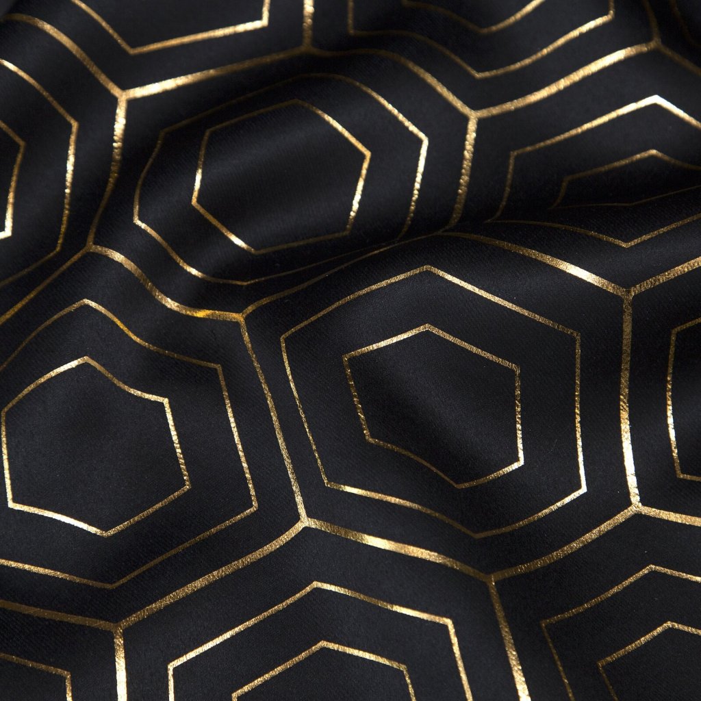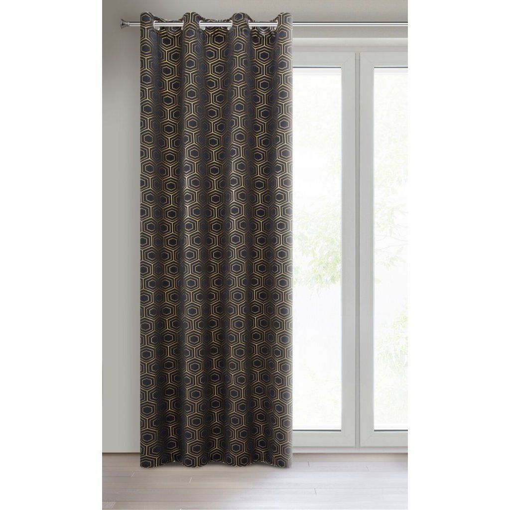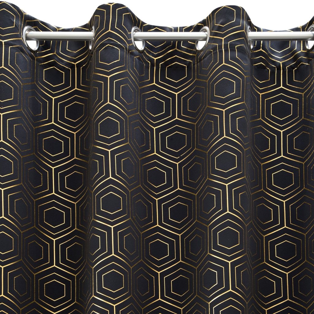 Zatemňovací závěs se zlatým potiskem s geometrickými vzory, šířka: 135 cm, délka: 250 cm, barva: černá a zlatá, hmotnost: 190 GSM, složení: 100% polyester.Doplňkové parametry
