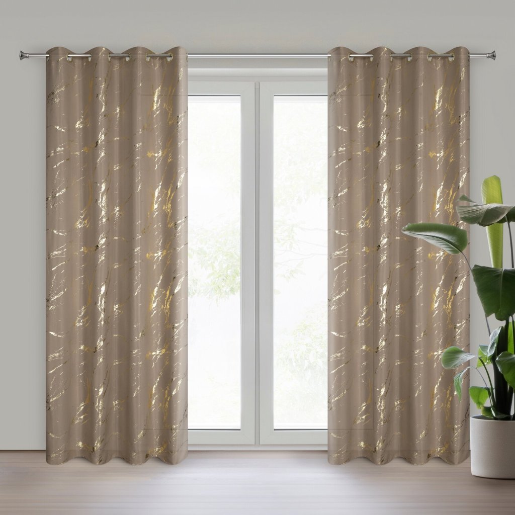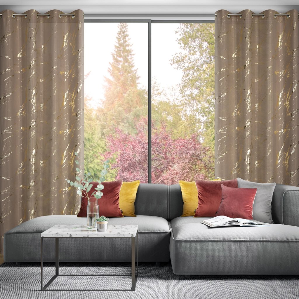 Hotový závěs z mikrovlákna s lesklým zlatým potiskem, šířka: 140 cm, délka: 250 cm, barva: hnědá, gramáž: 75 GSM, složení: 100% polyester.Doplňkové parametry